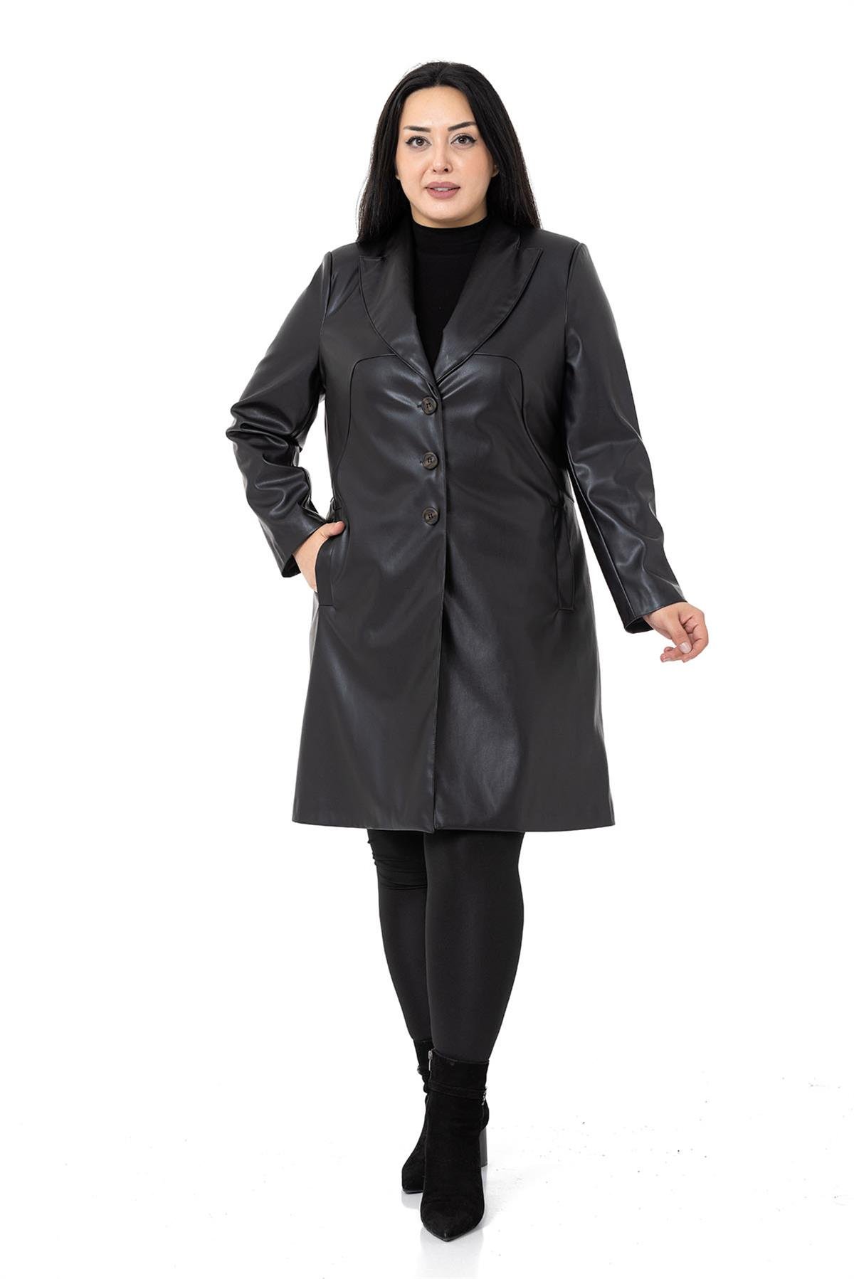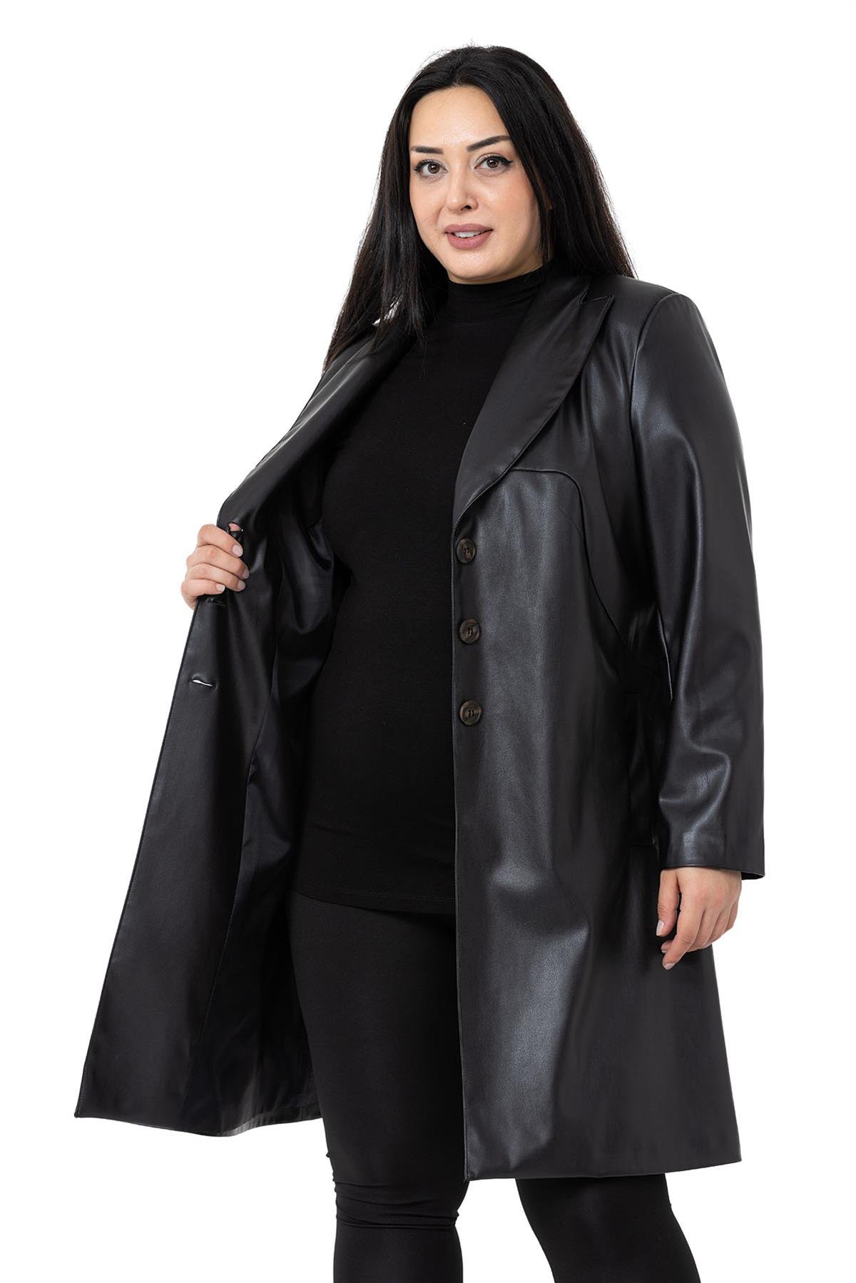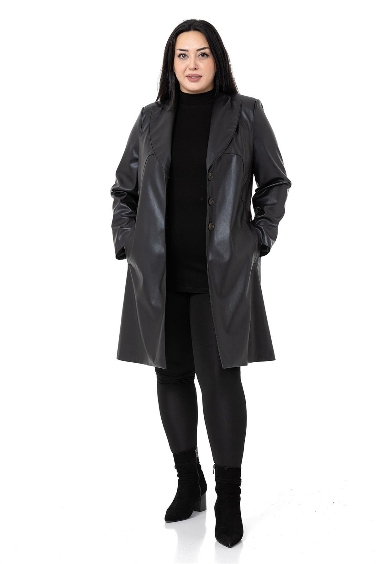 Büyük beden fleto cepli düğmeli astarlı suni deri midi boy kaban.
