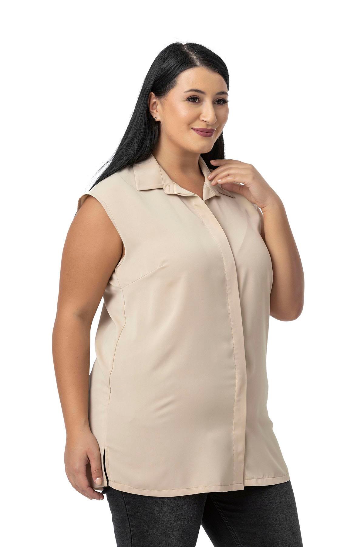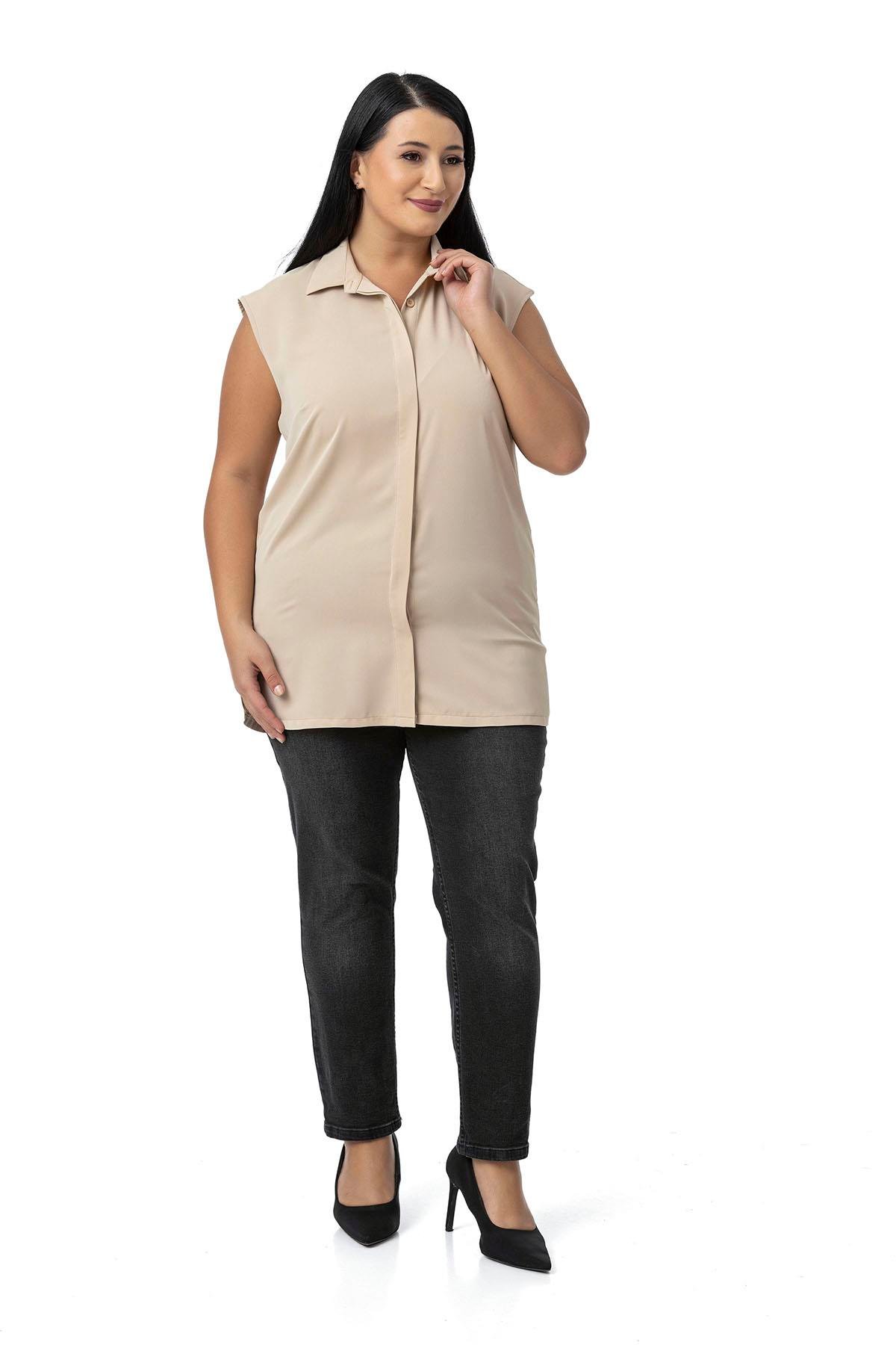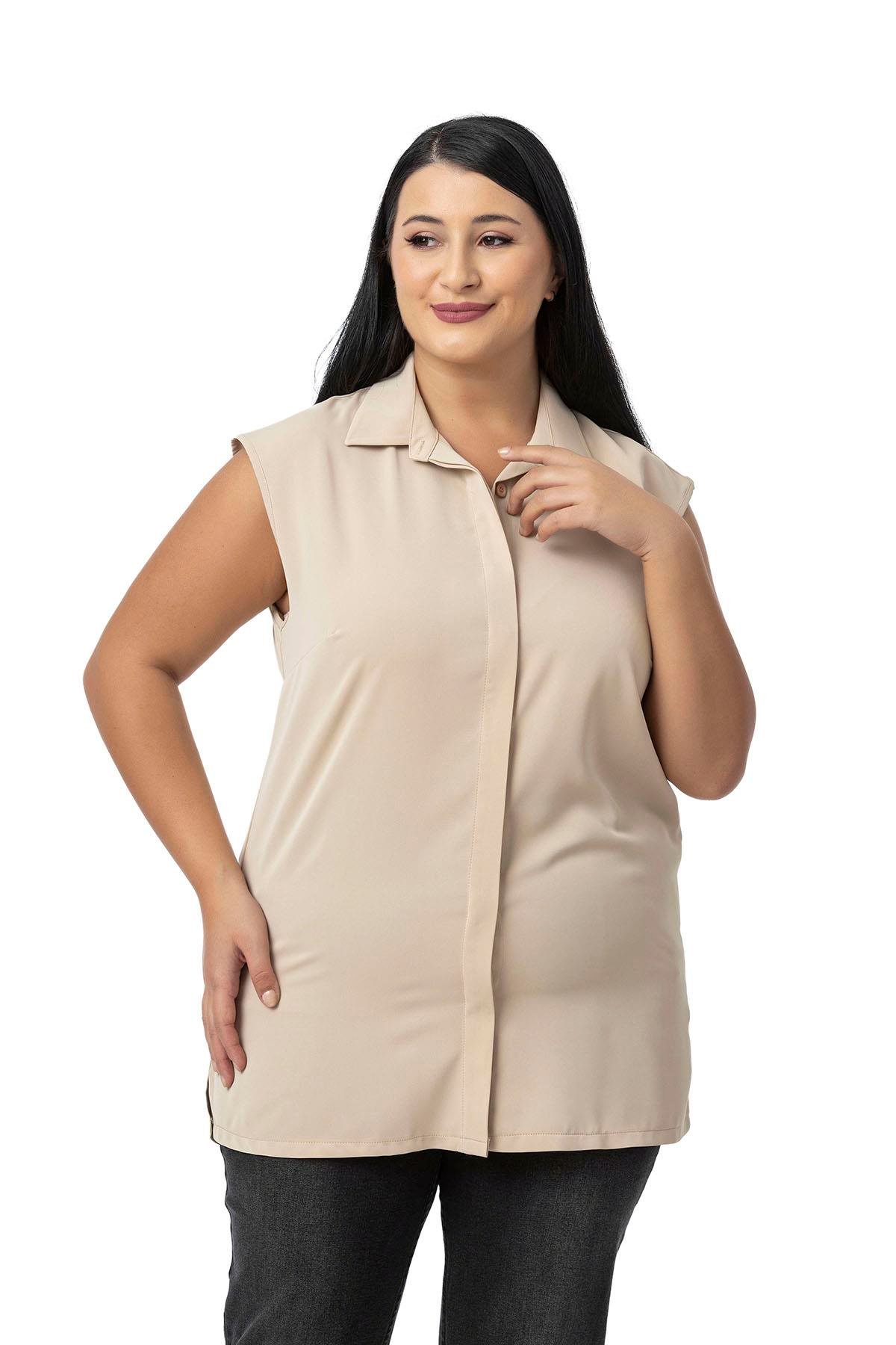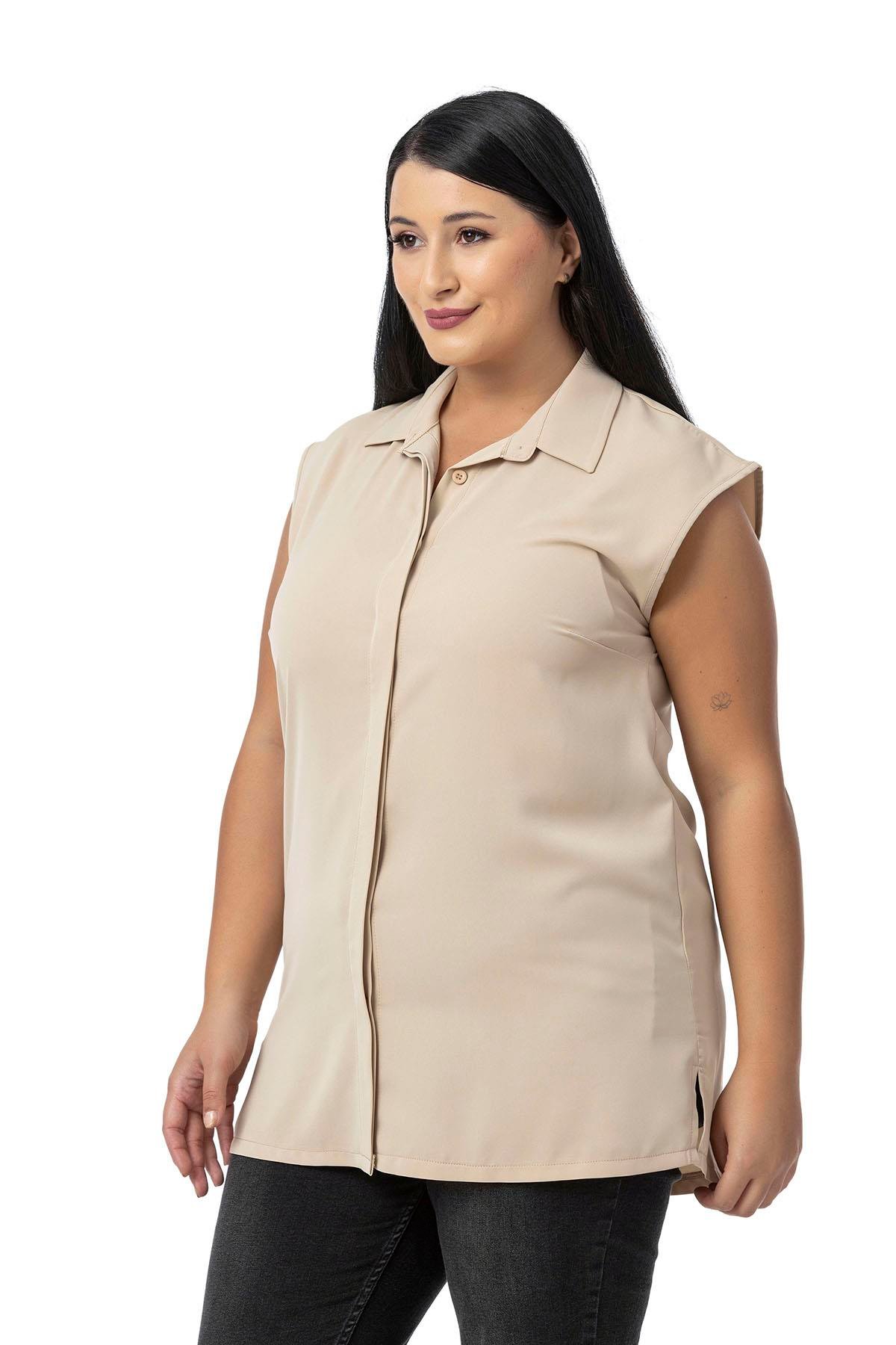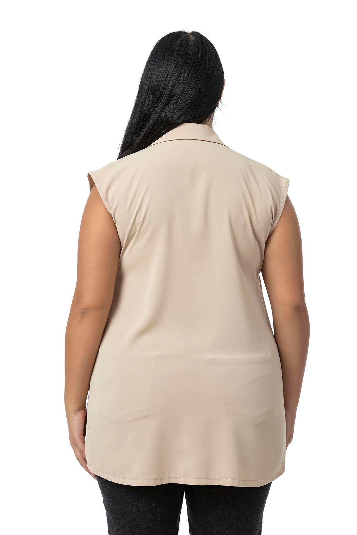 Büyük beden gizli düğmeli yandan yırtmaçlı kolsuz gömlek.