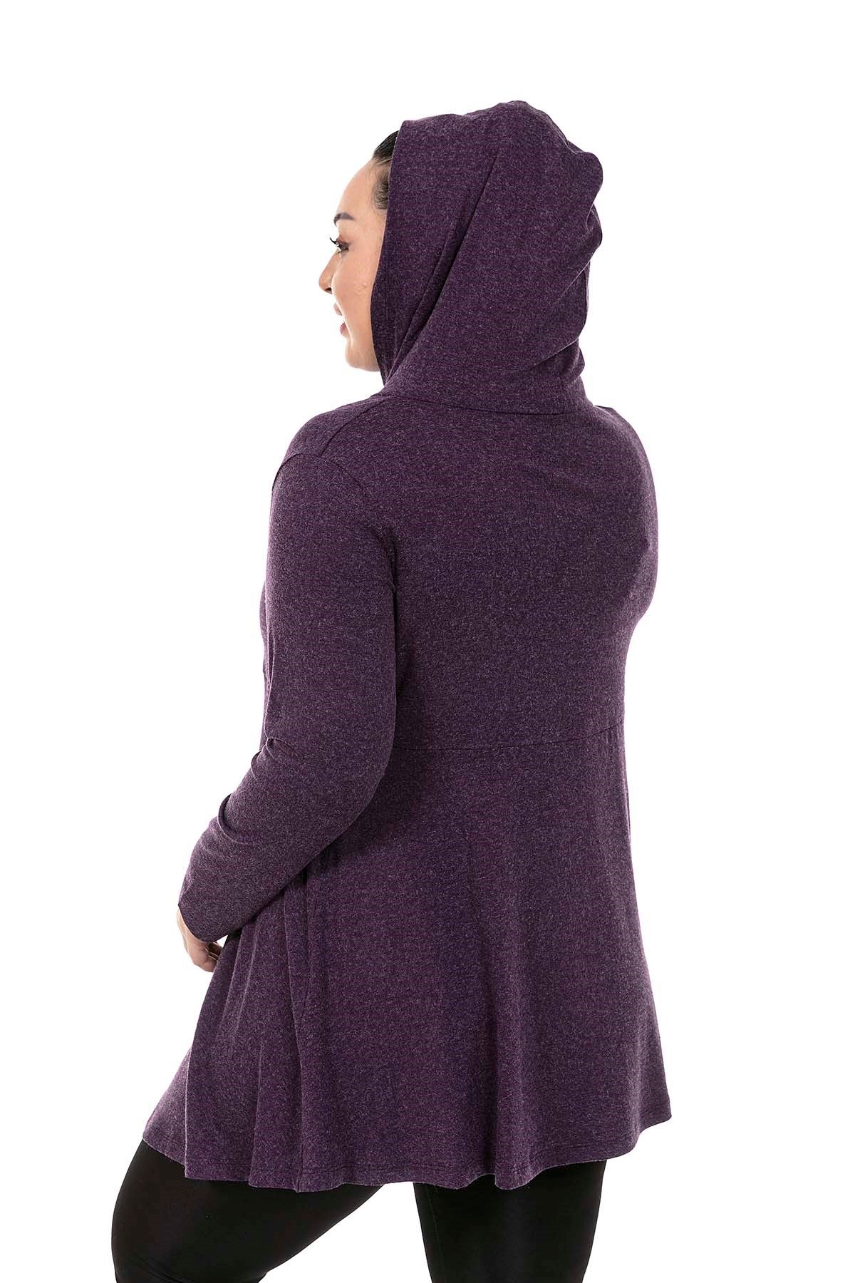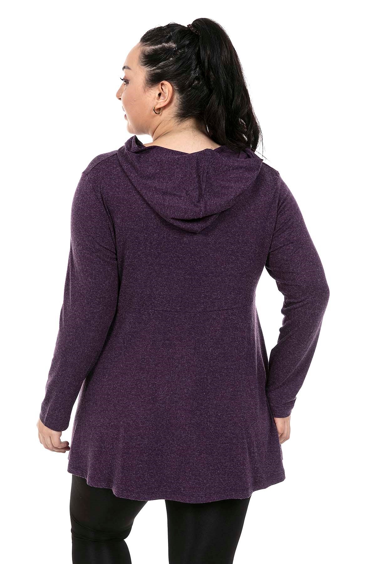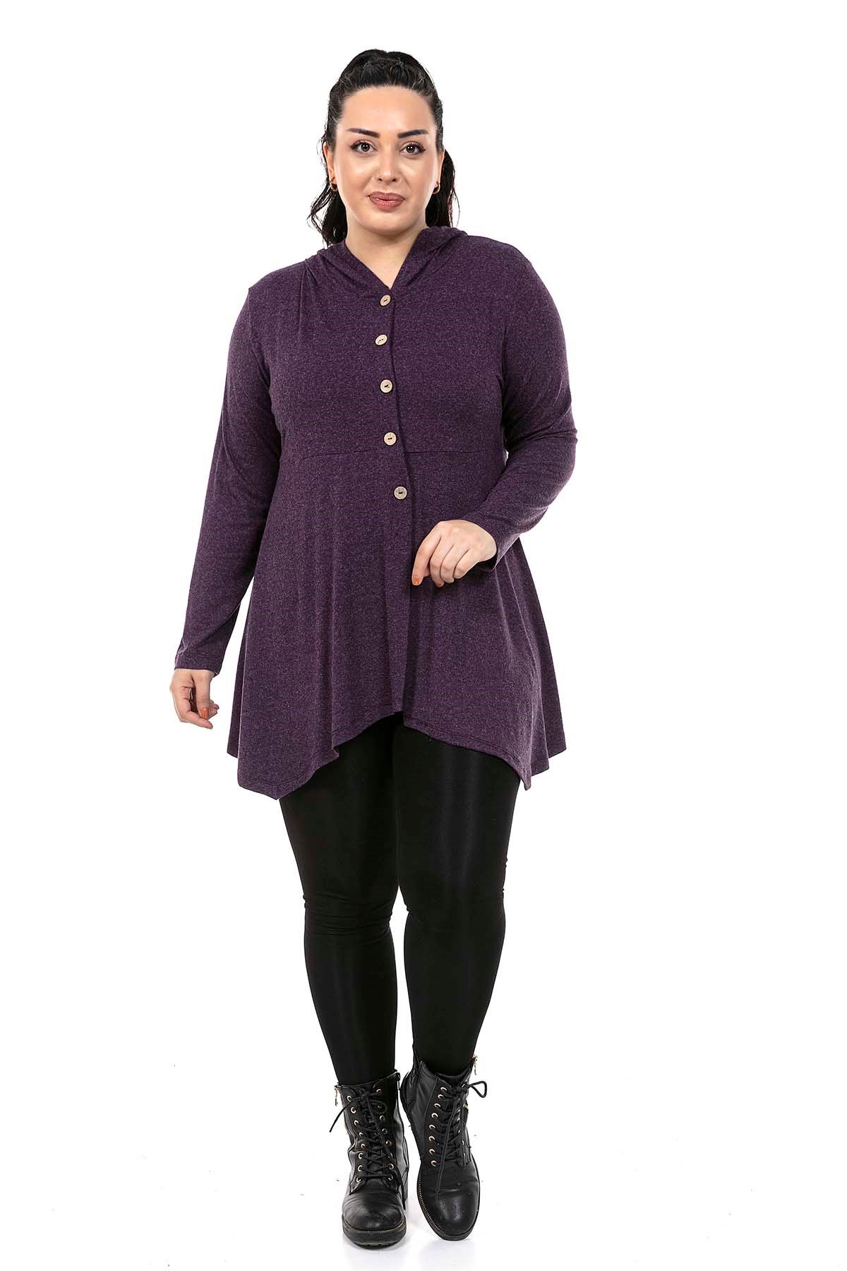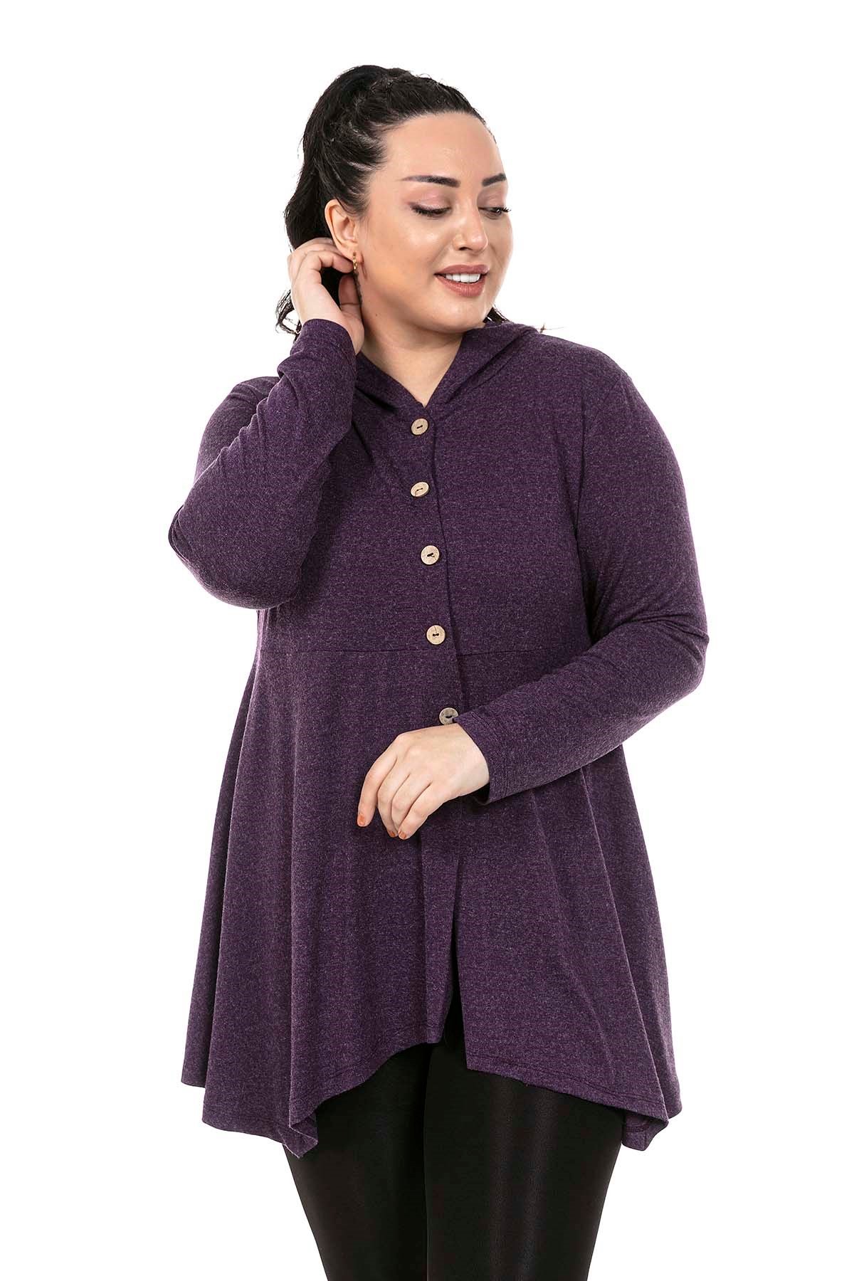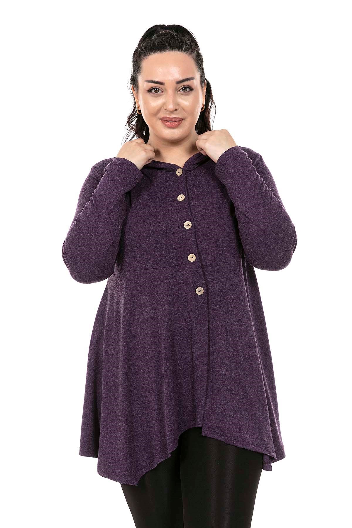 Büyük beden asimetrik kesim kapüşonlu sahte düğme detaylı yün viskon bluz.