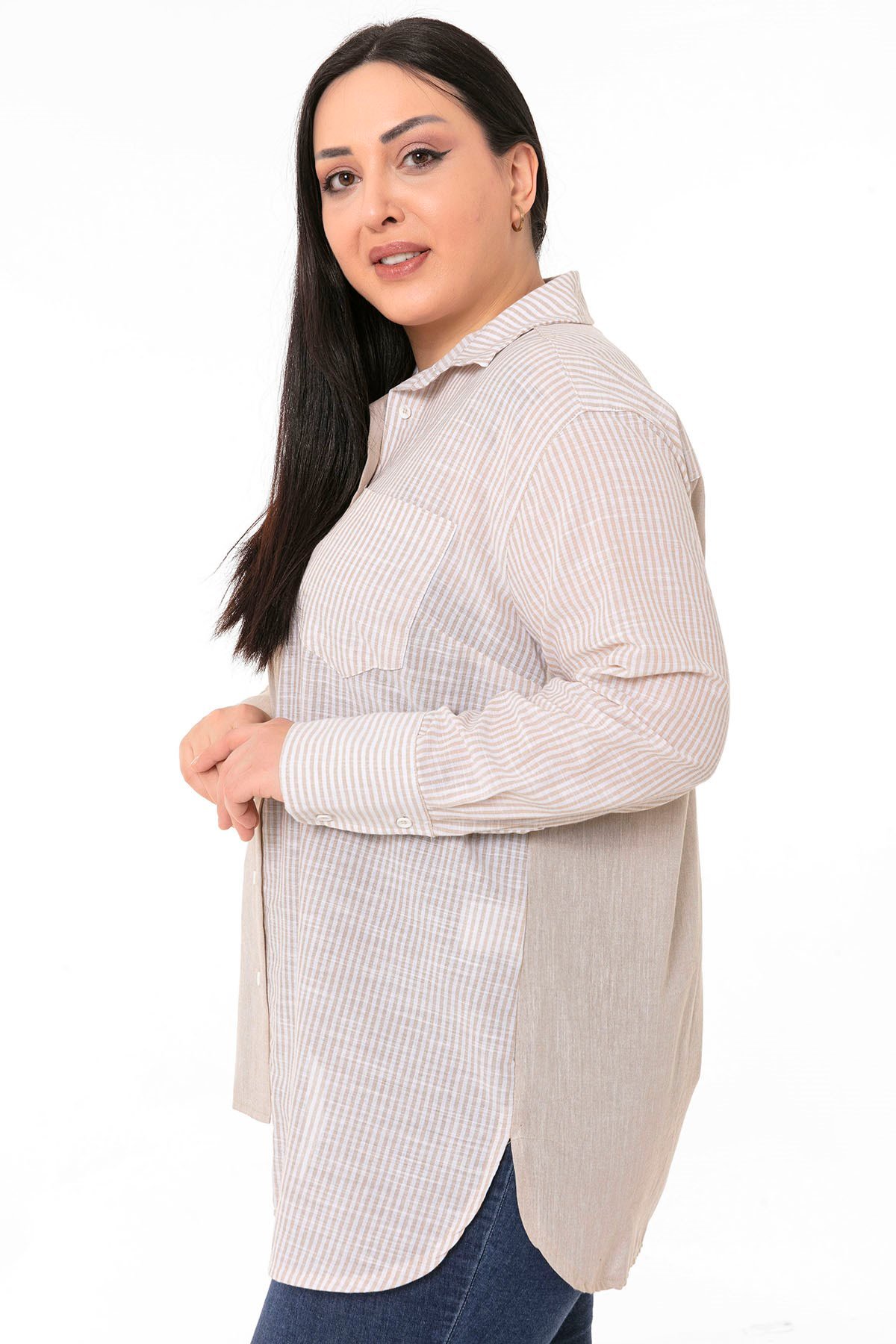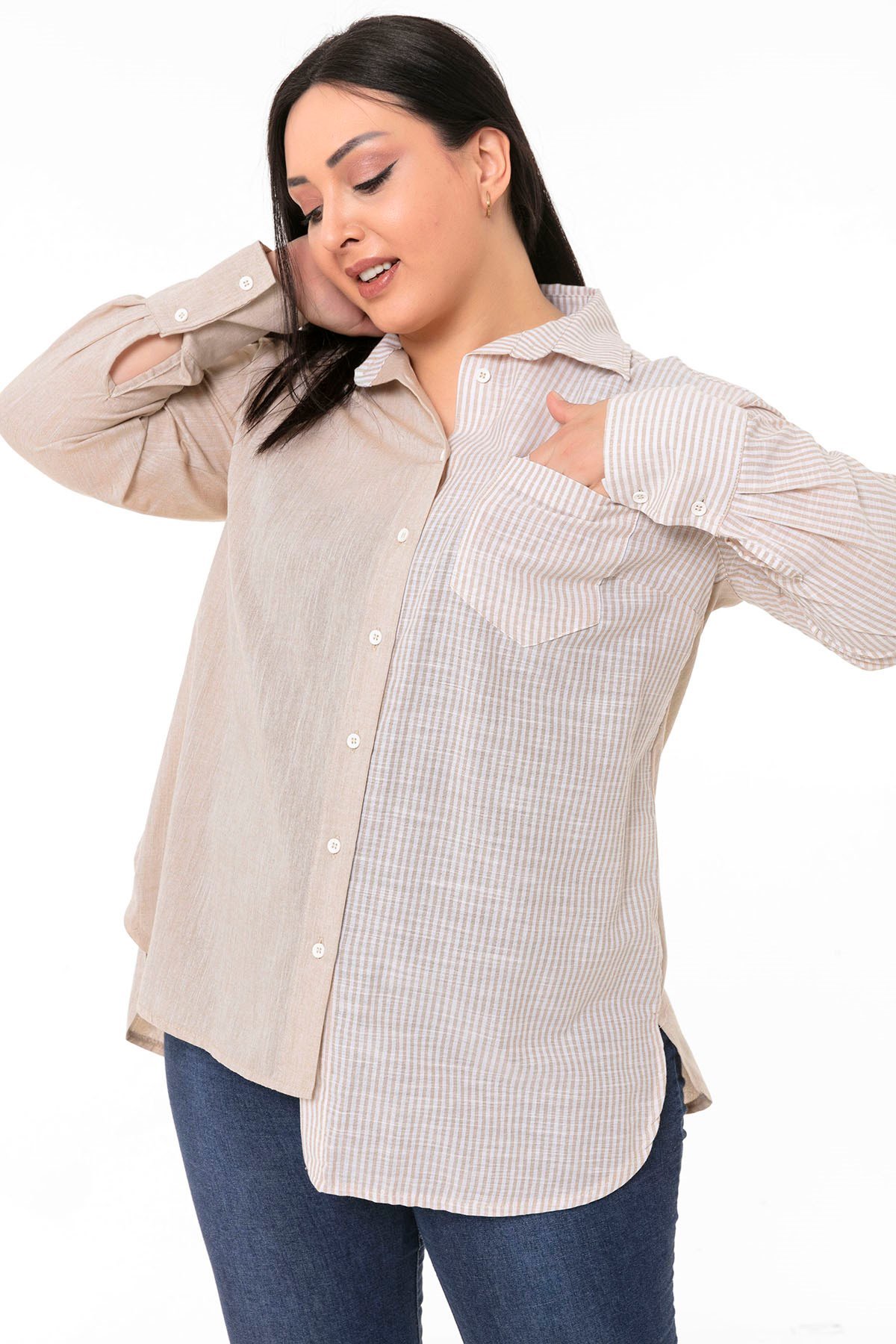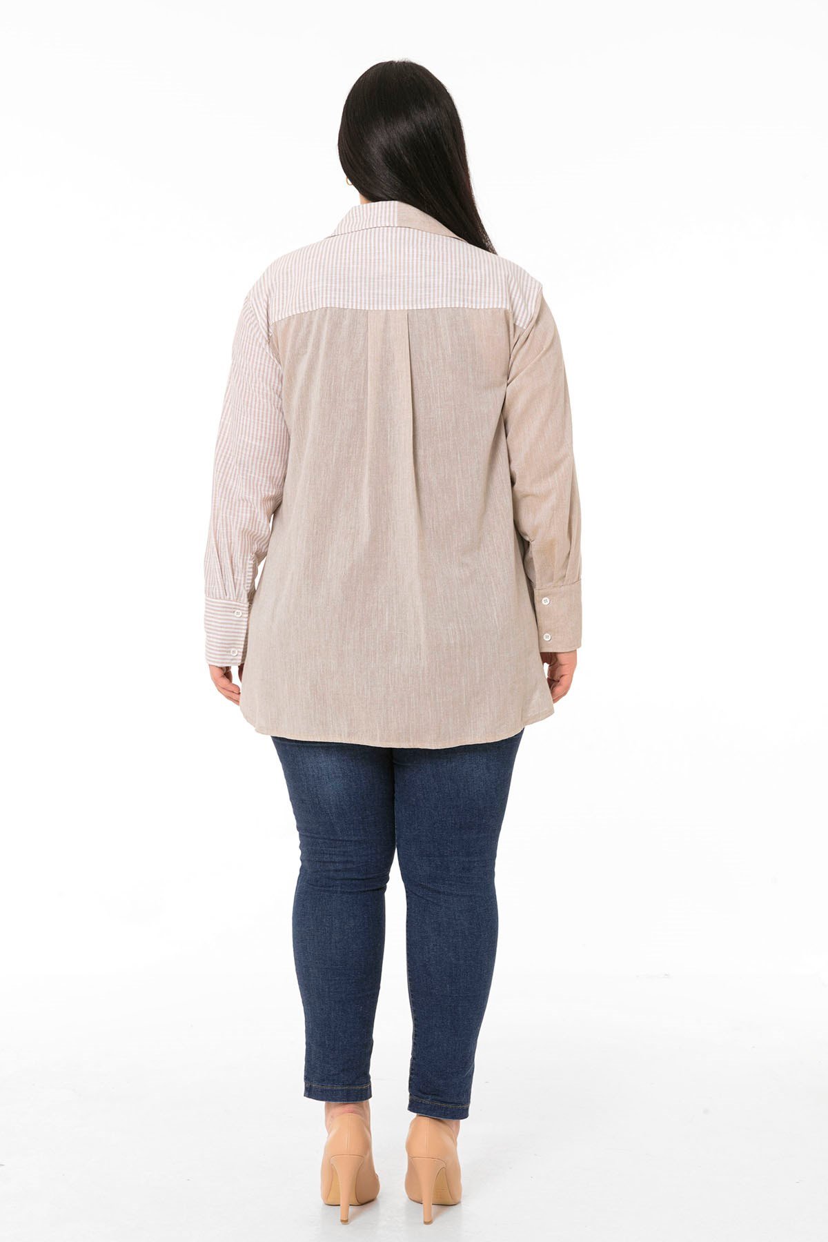 Büyük Beden Asimetrik Kesim Yanları Yırtmaçlı Manşetli Robalı Çizgili ve Düz Kumaş Garnili Bej Gömlek