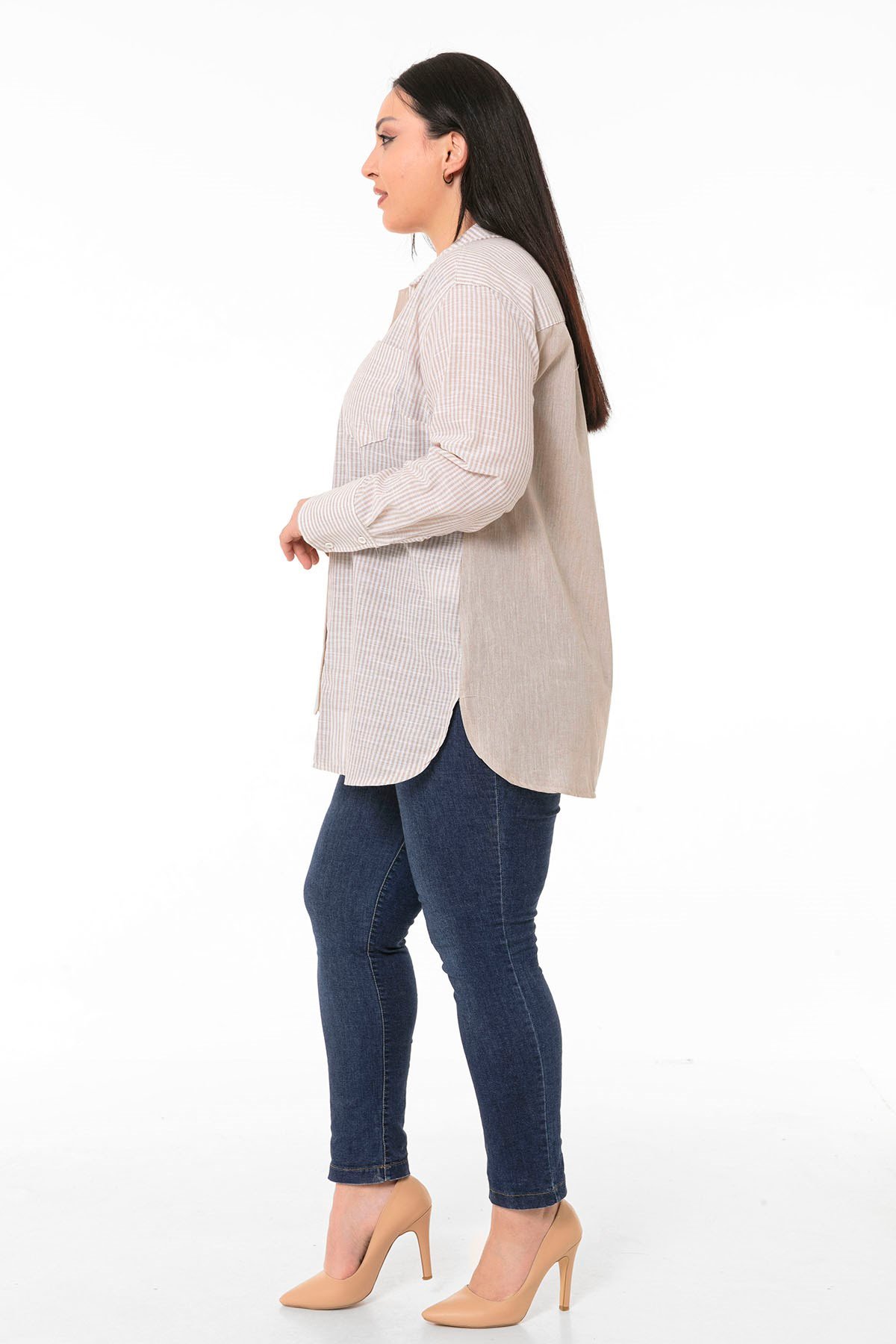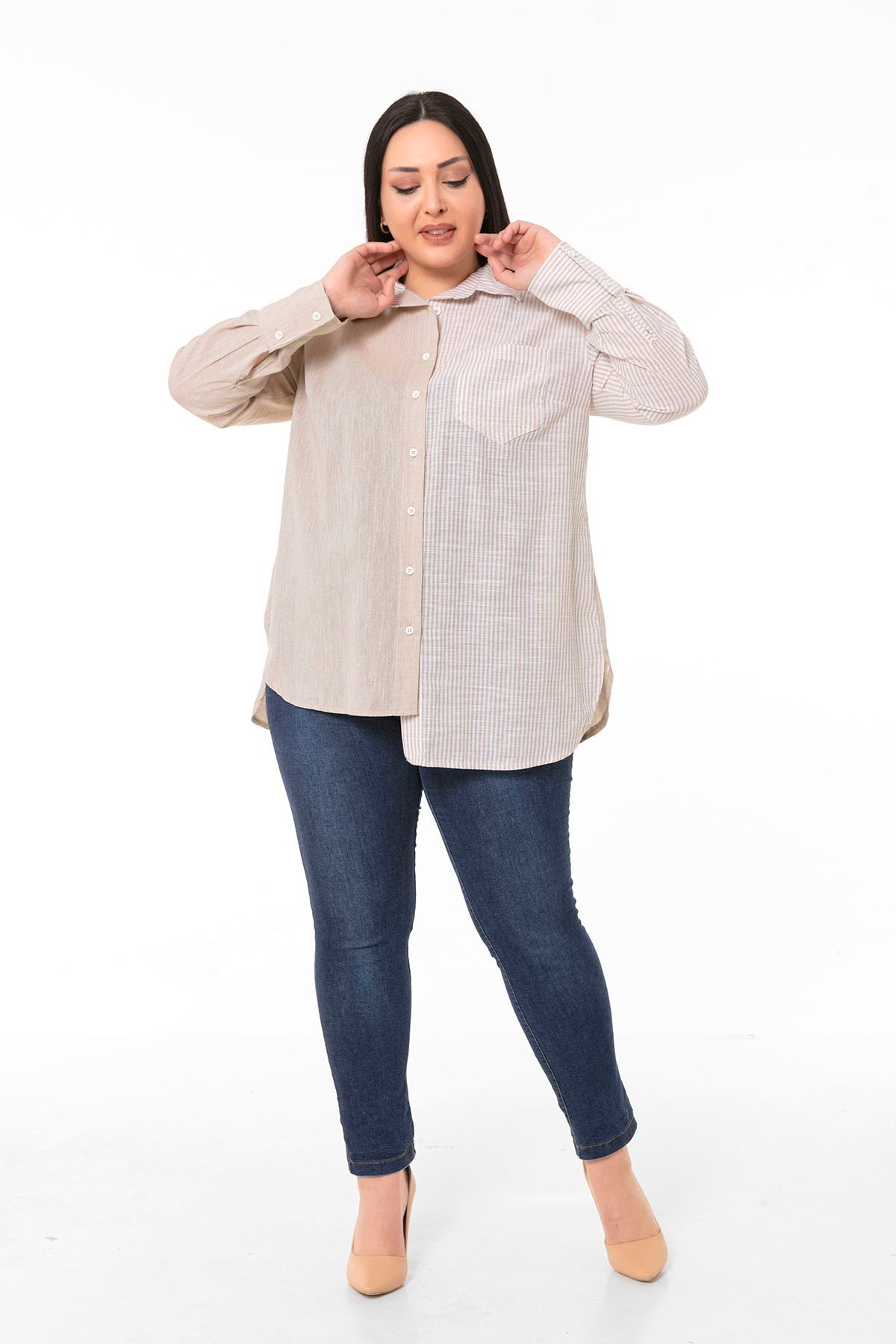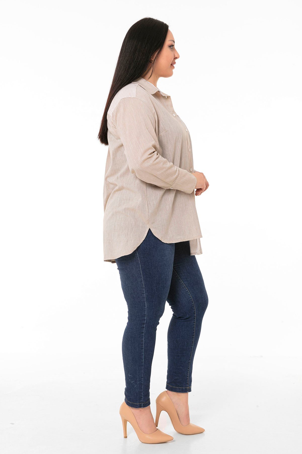 Büyük Beden Asimetrik Kesim Yanları Yırtmaçlı Manşetli Robalı Çizgili ve Düz Kumaş Garnili Bej Gömlek