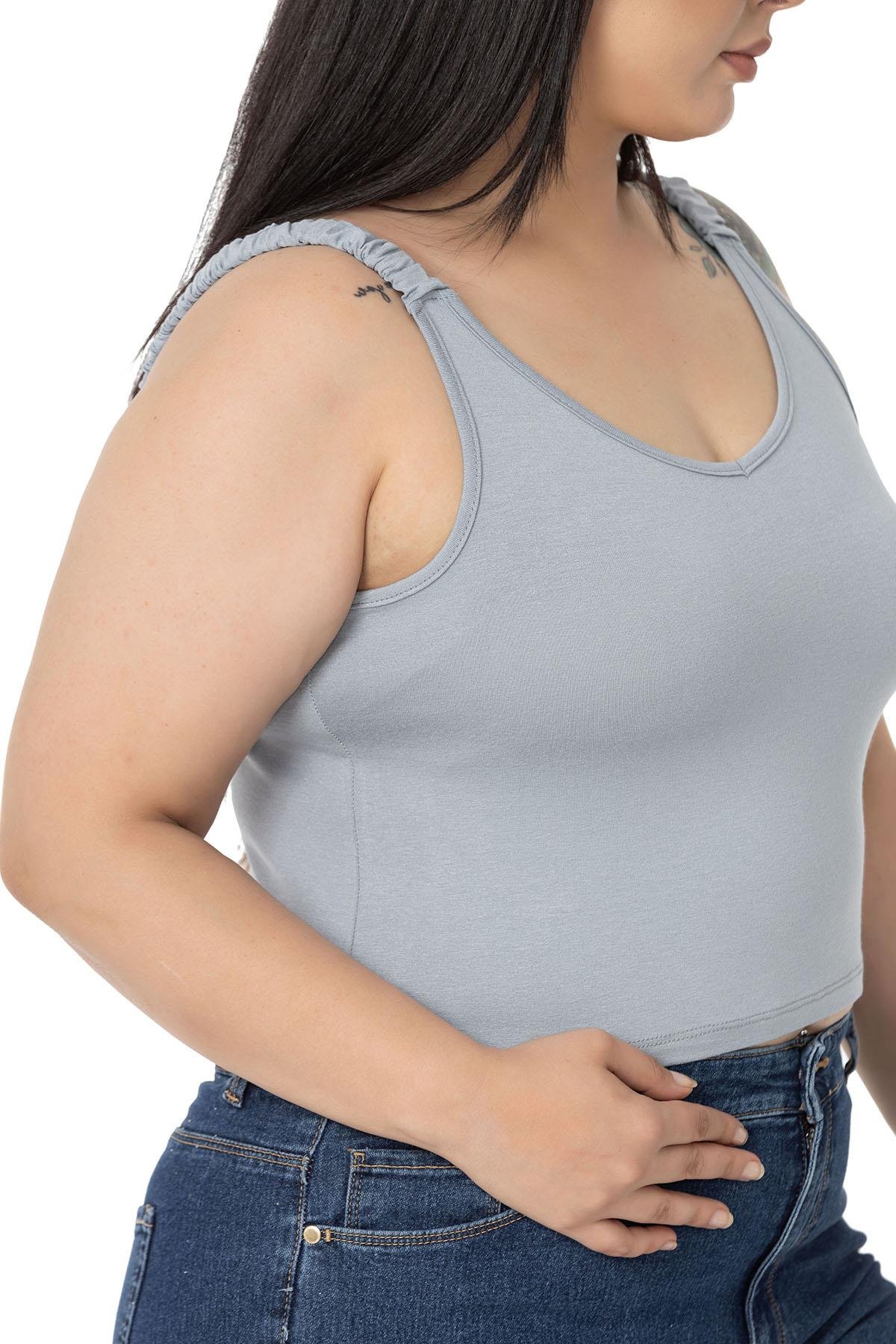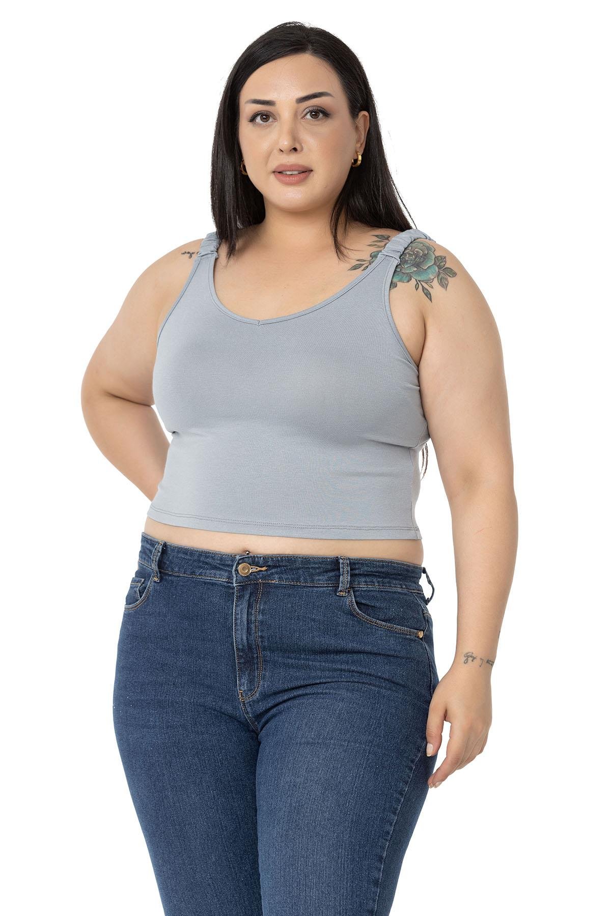 Büyük Beden Askıları Büzgülü Drapeli Crop Gri Body