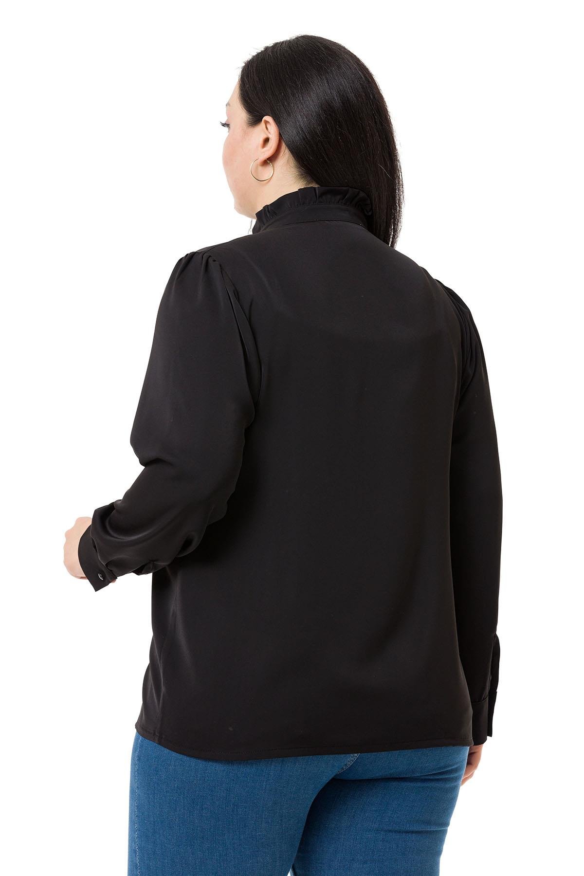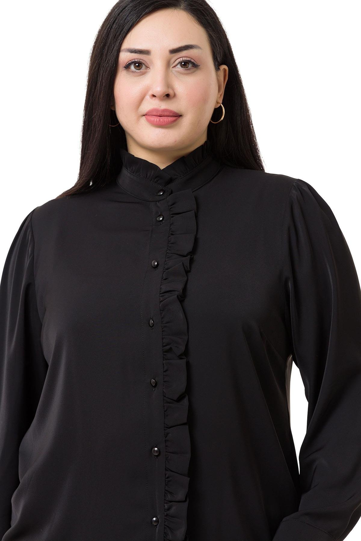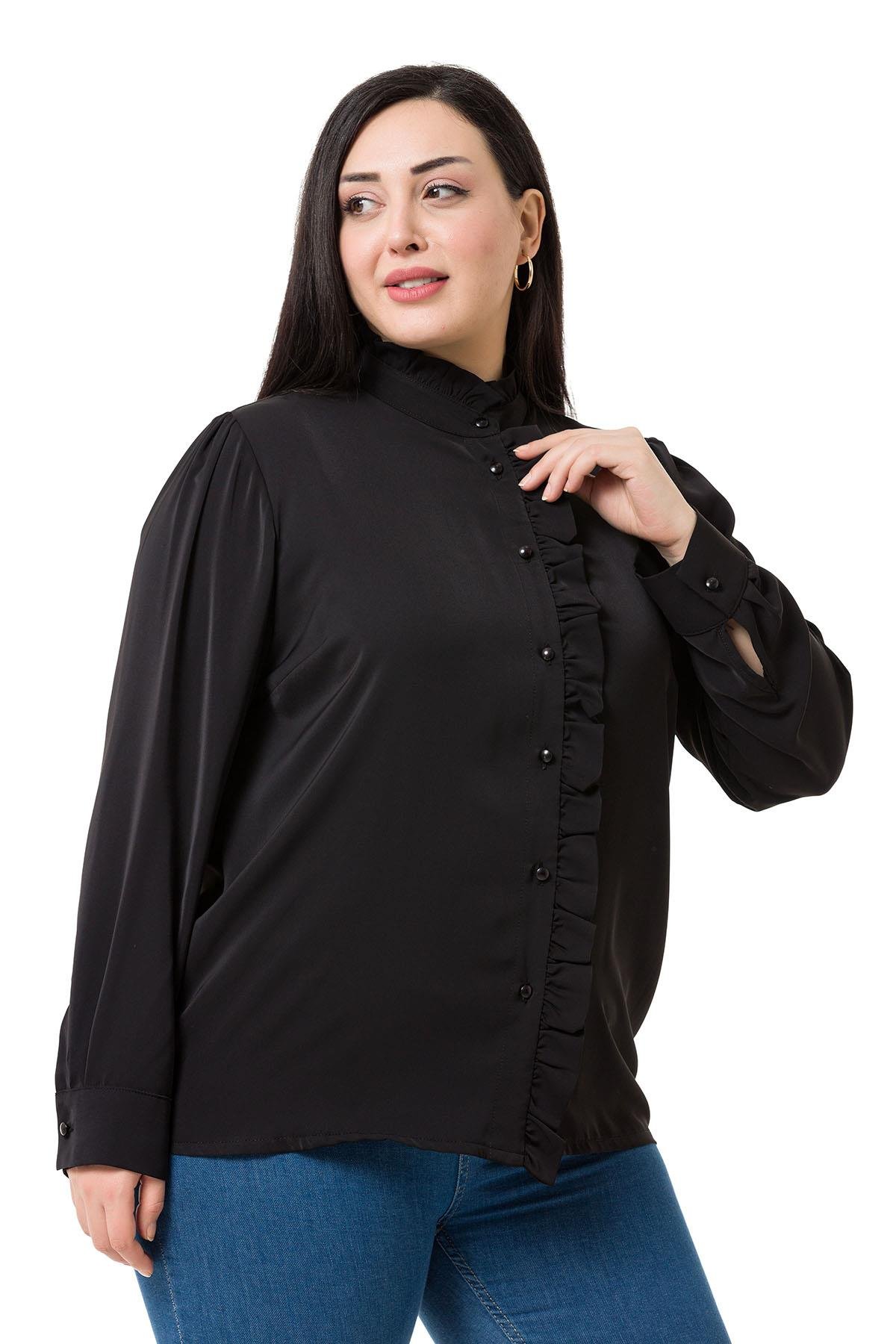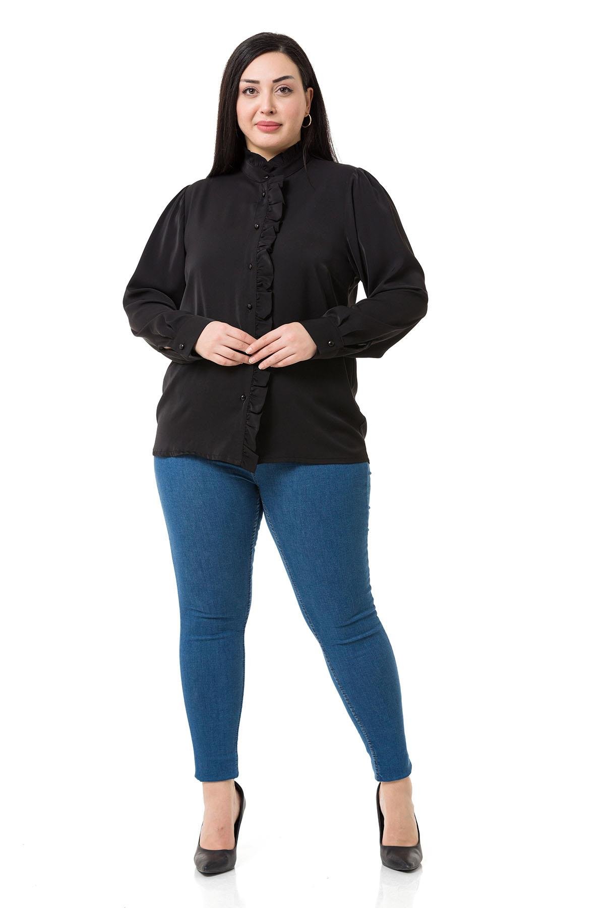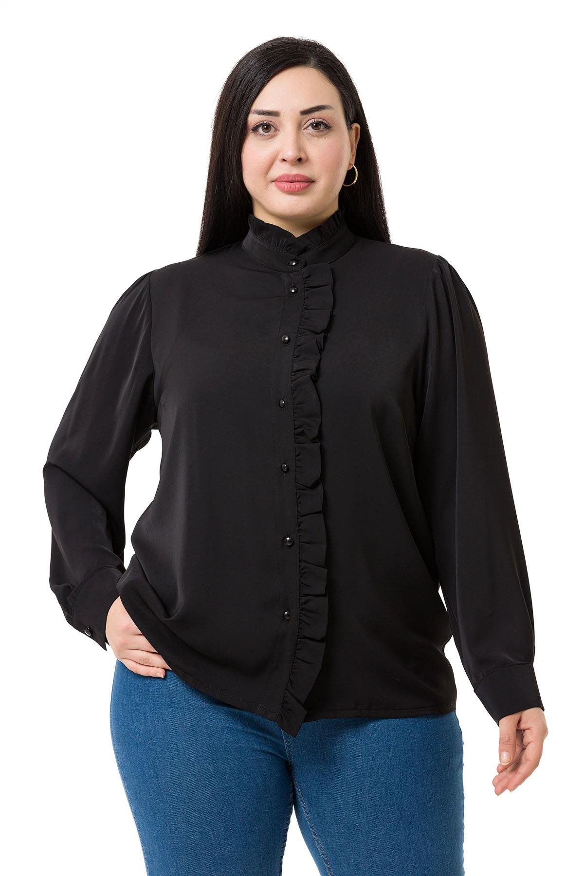 Büyük beden hakim yaka ön patı ve yakası fırfırlı manşetli uzun kollu gömlek.