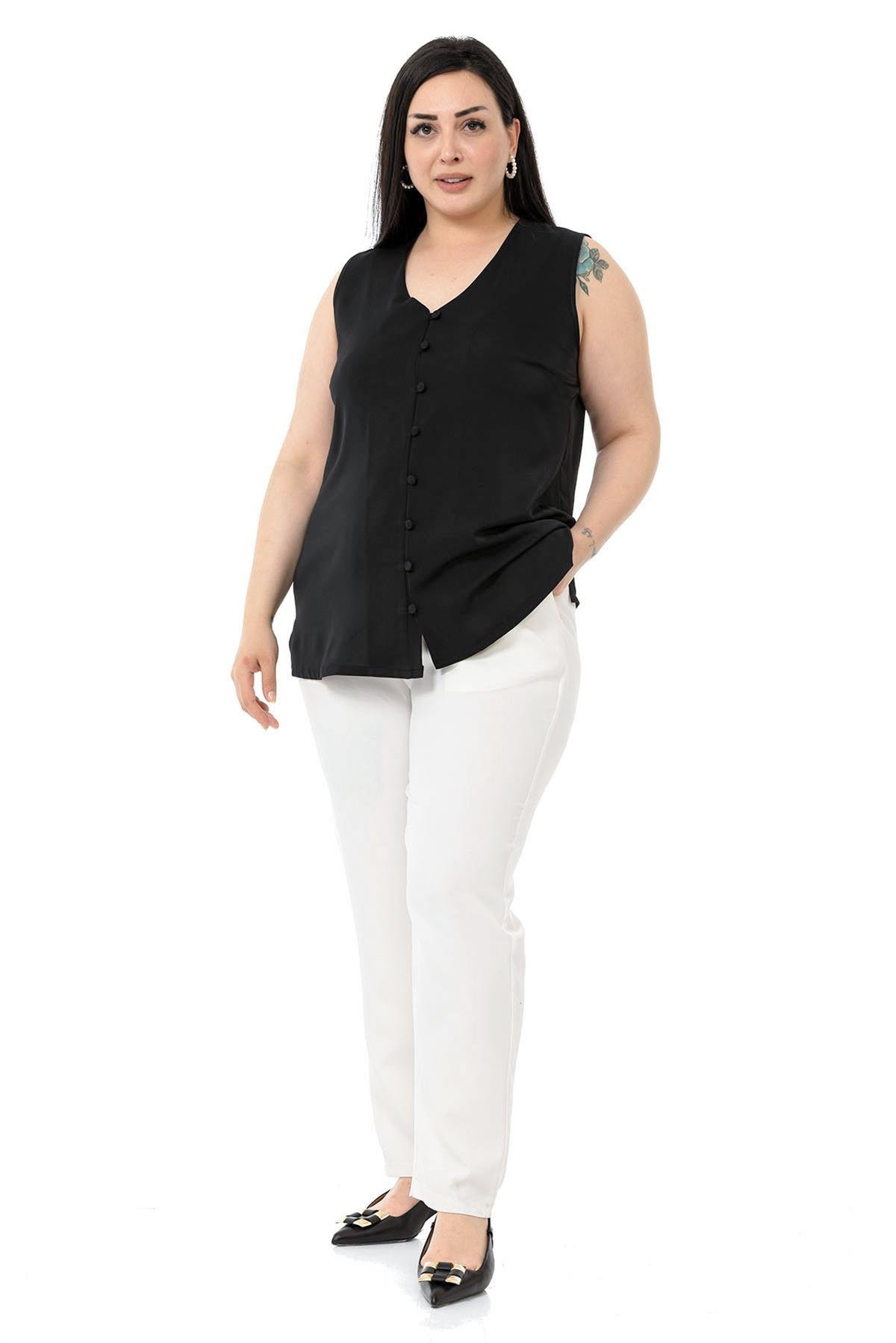 Büyük beden kaplama düğmeli yanı yırtmaçlı kolsuz gömlek.