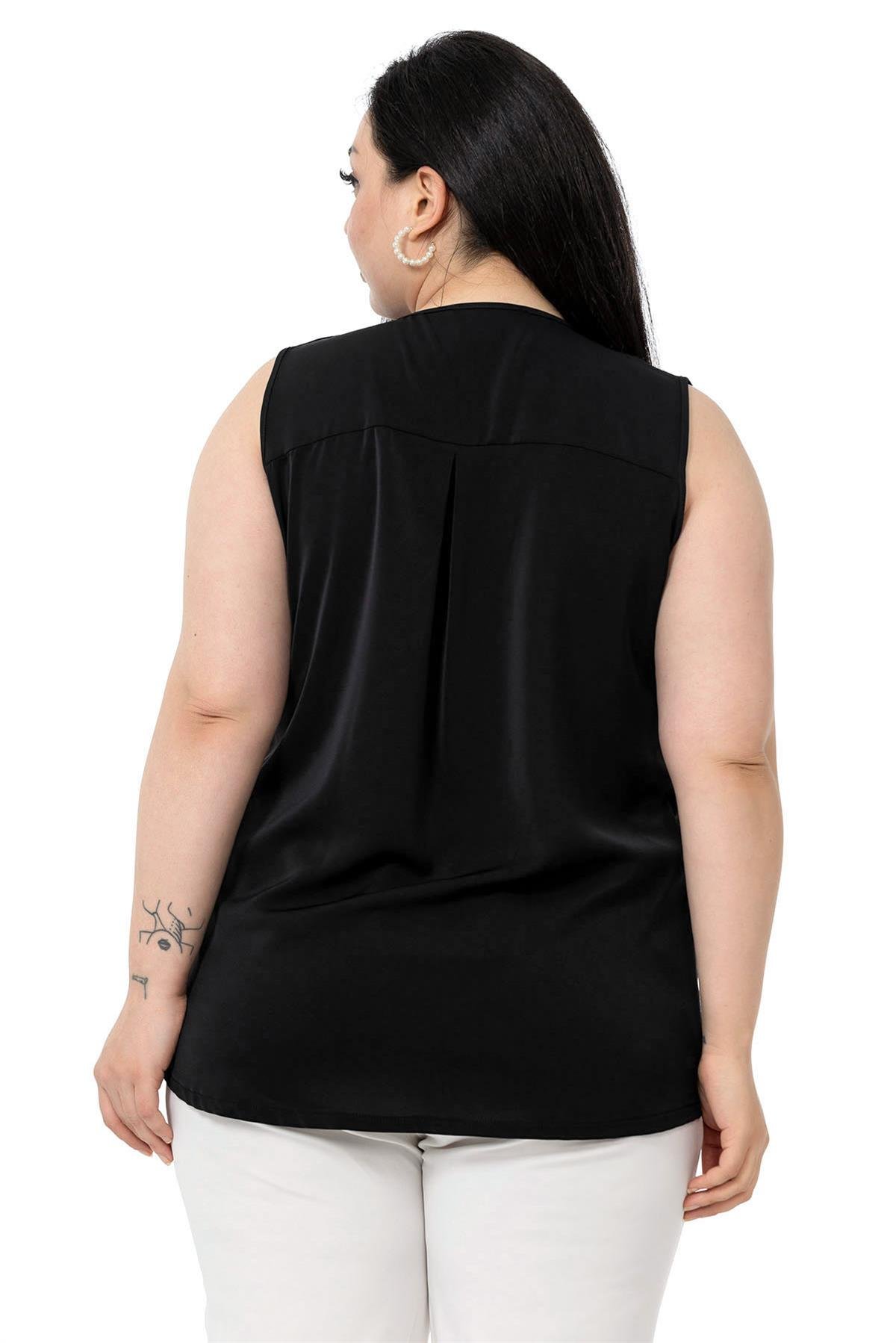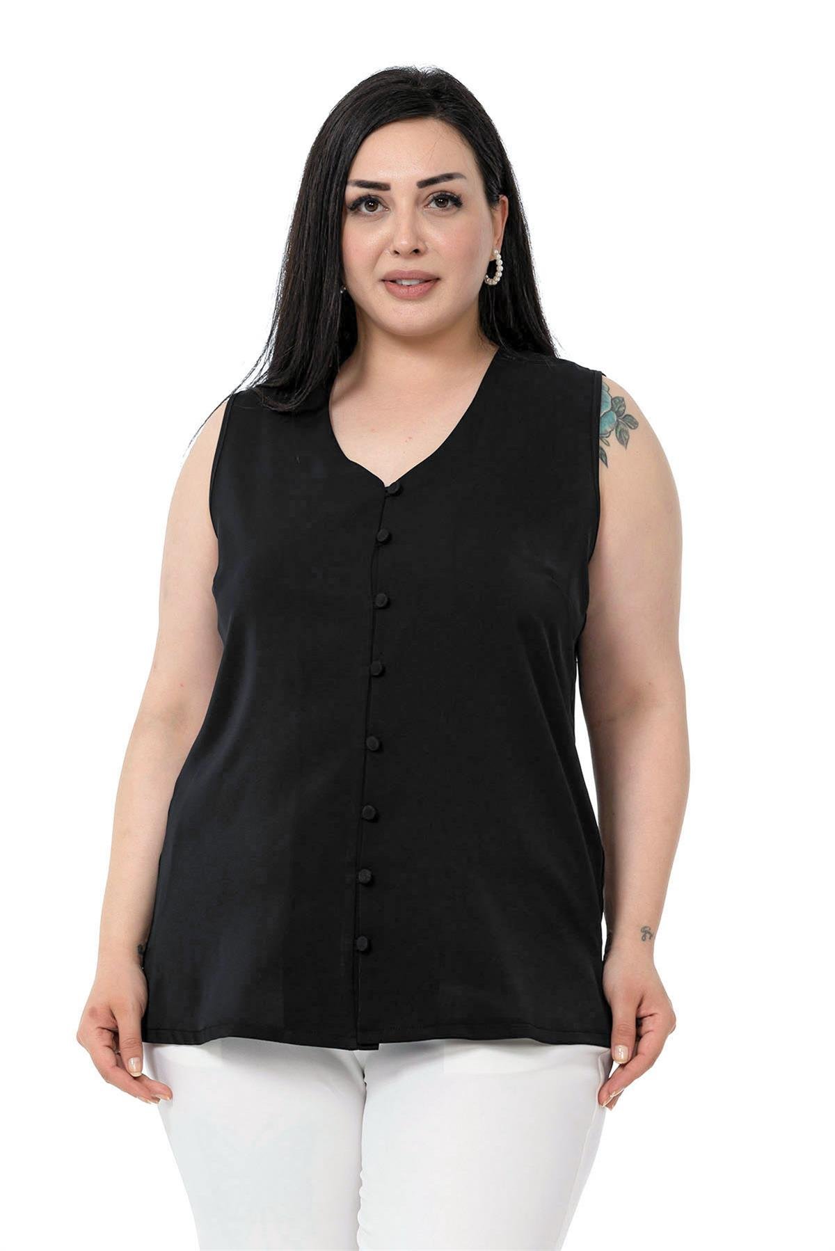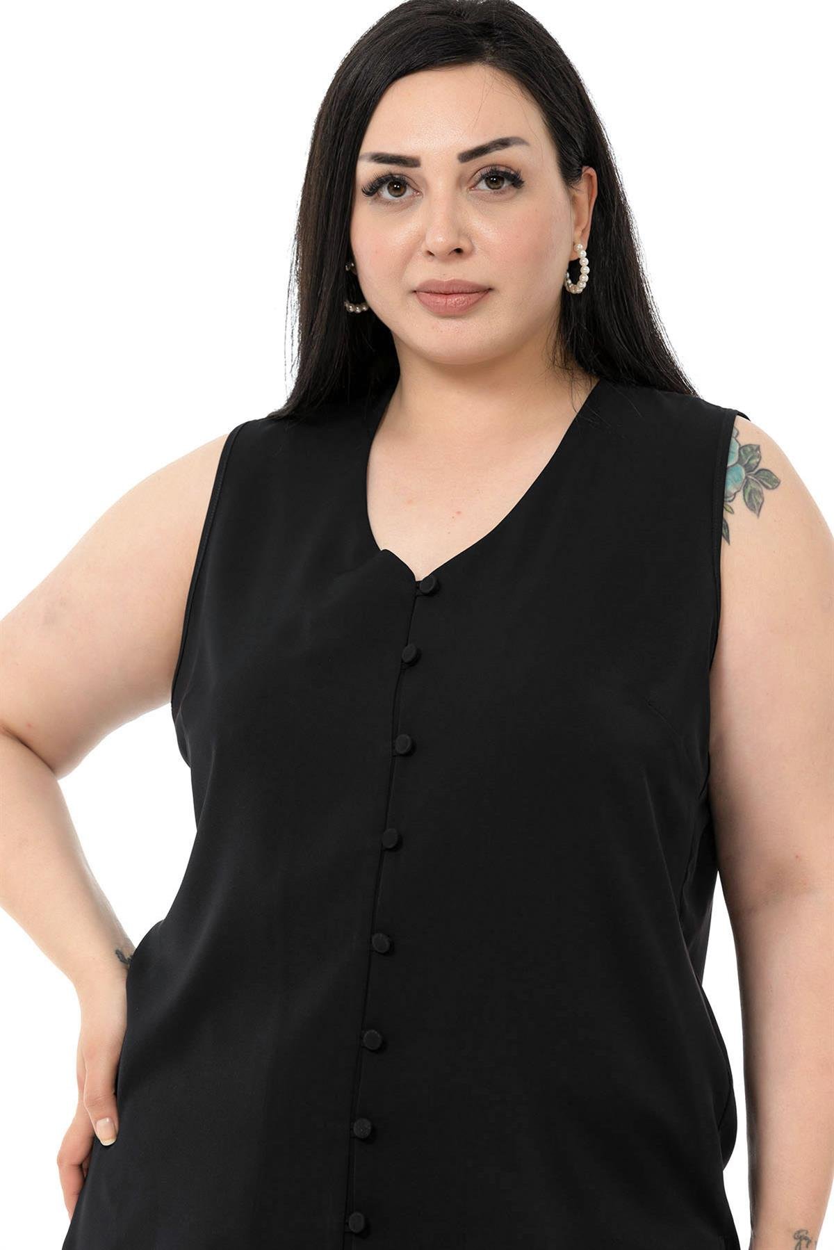 Büyük Beden Kaplama Düğmeli Yanı Yırtmaçlı Kolsuz Siyah Gömlek