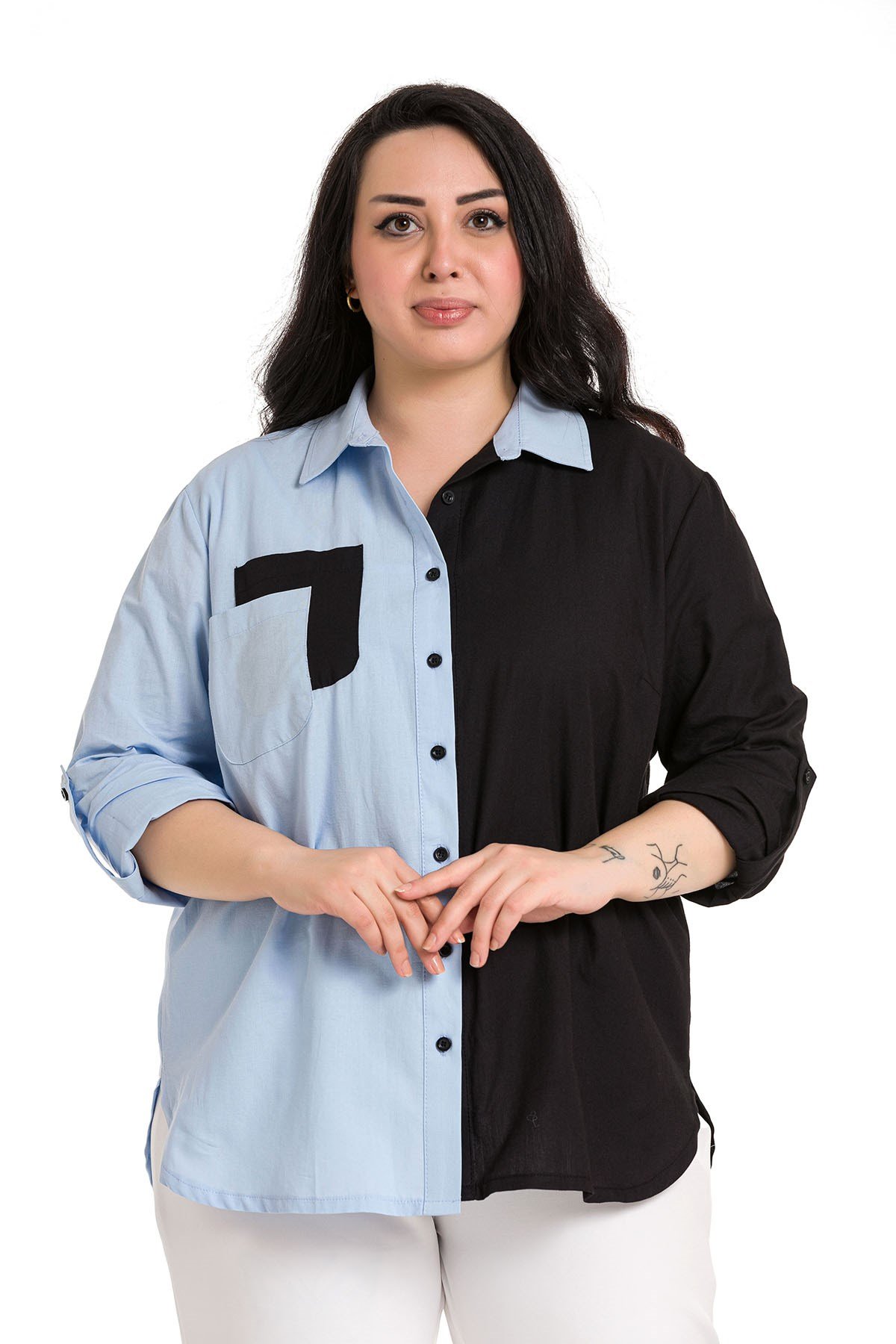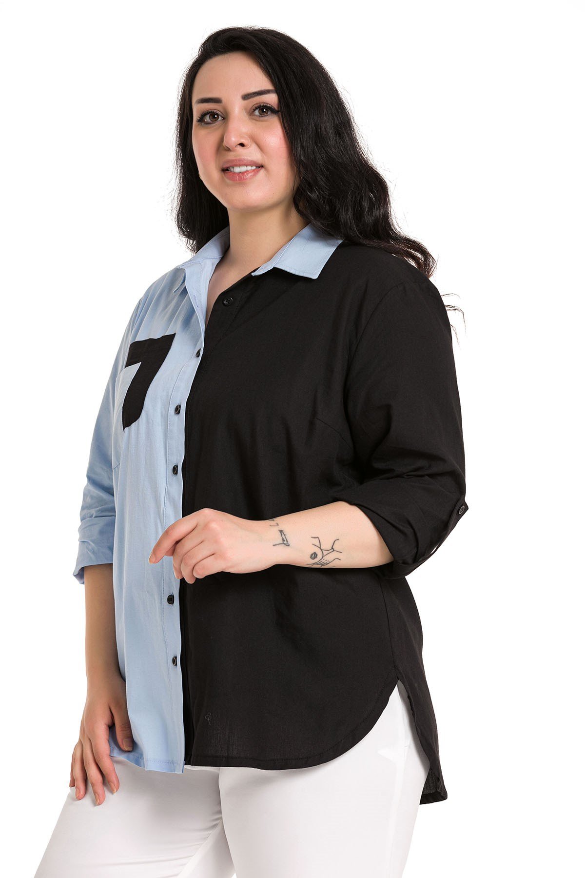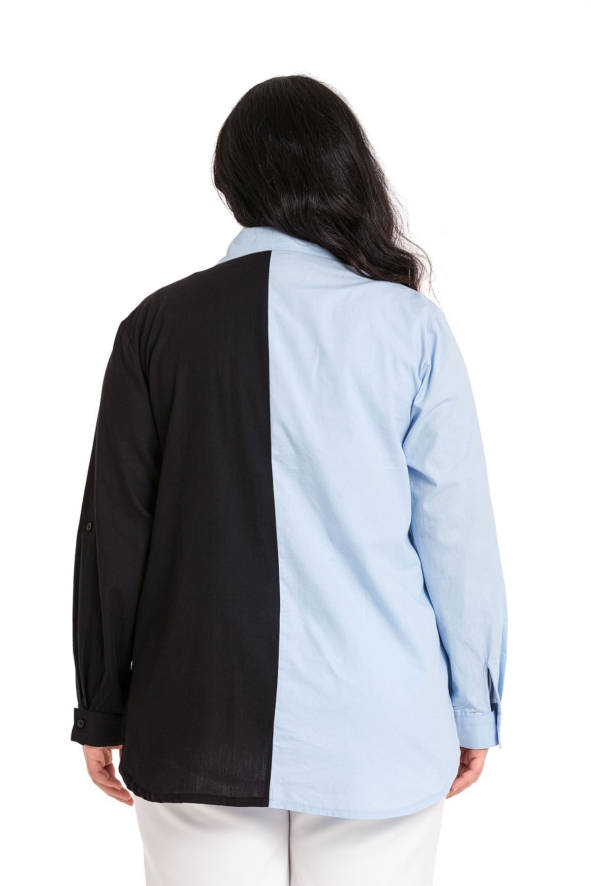 Büyük beden katlamalı kollu cep detaylı asimetrik iki renkli gömlek.