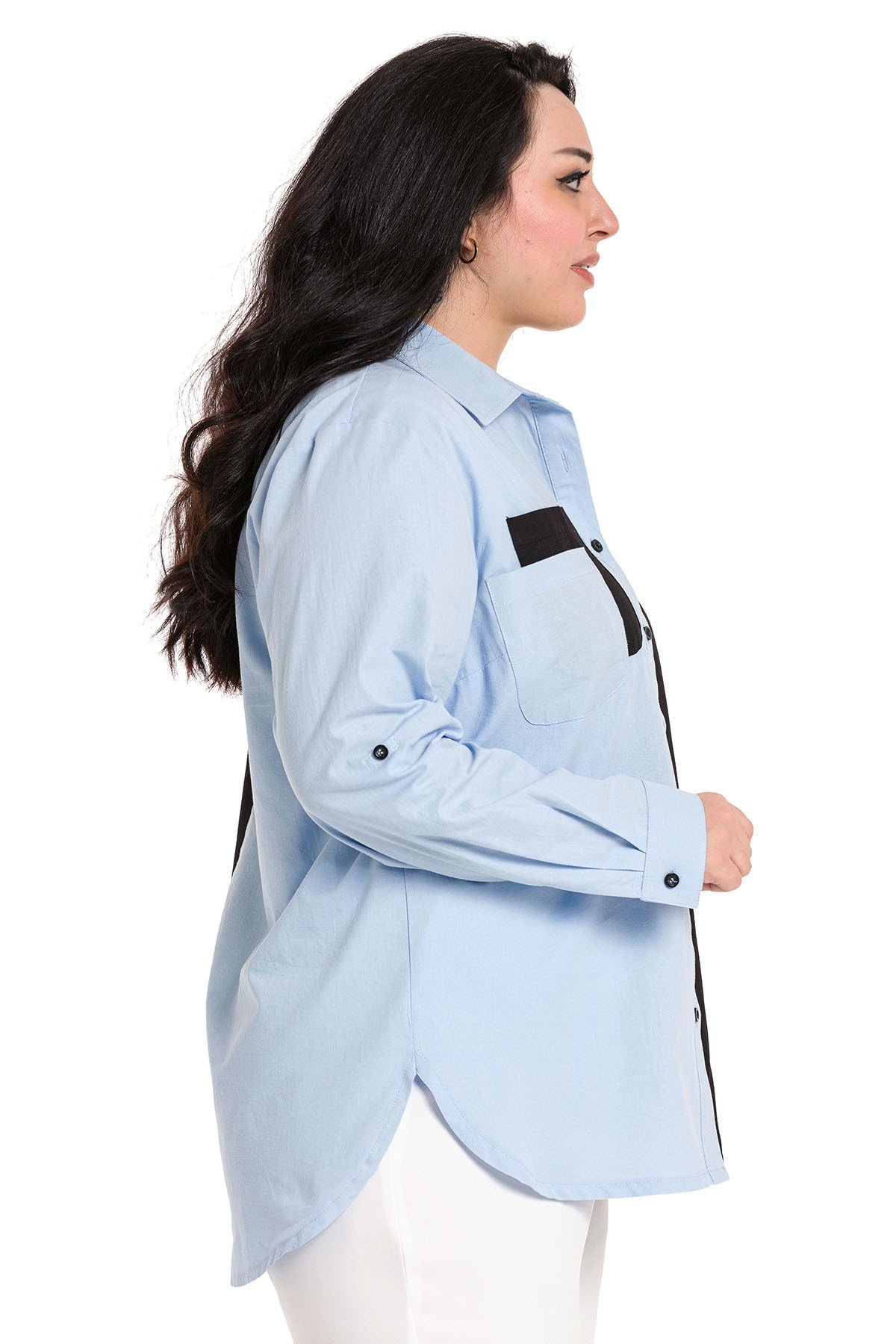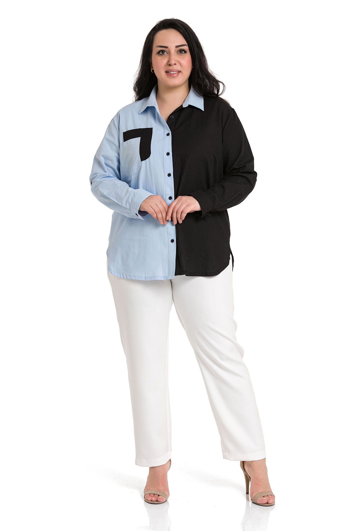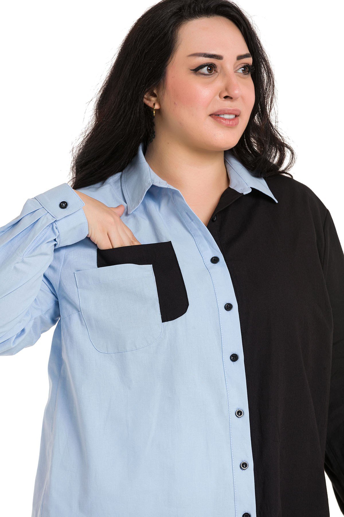 Büyük beden katlamalı kollu cep detaylı asimetrik iki renkli gömlek.