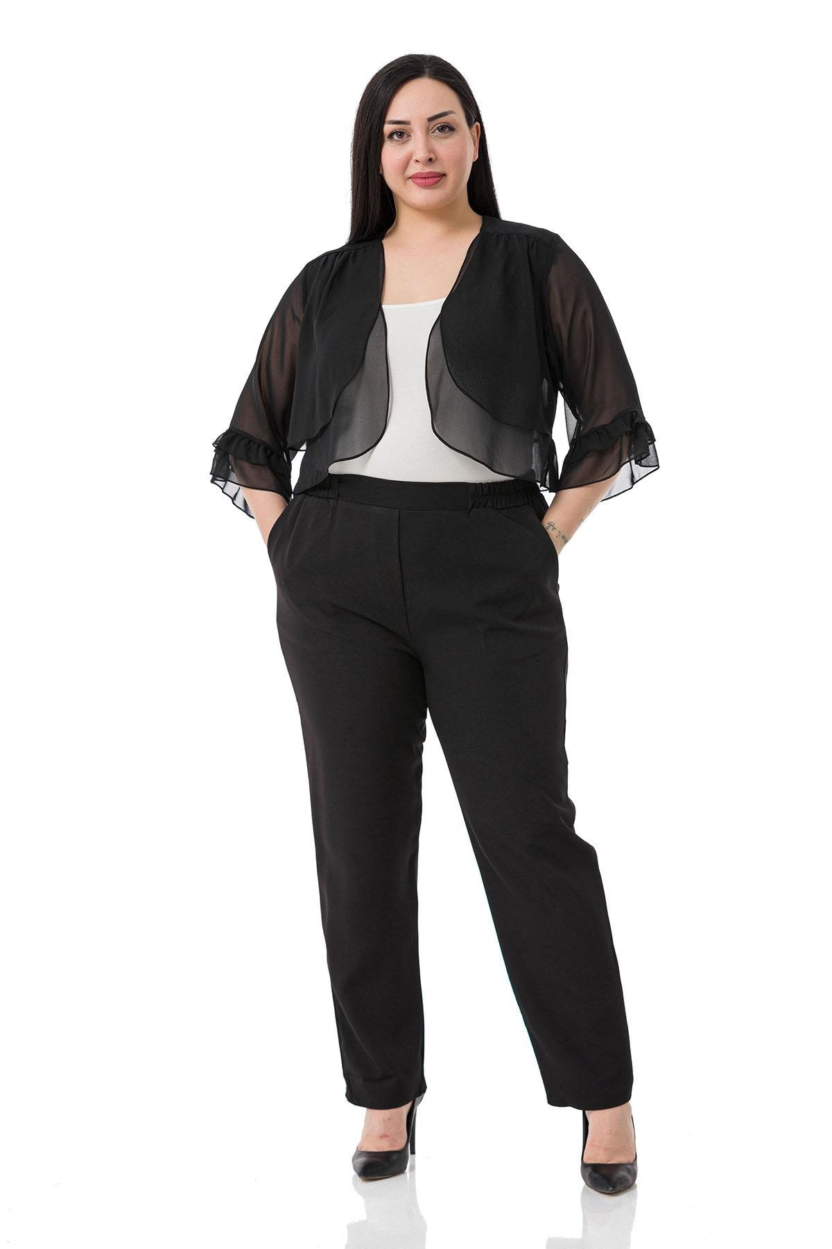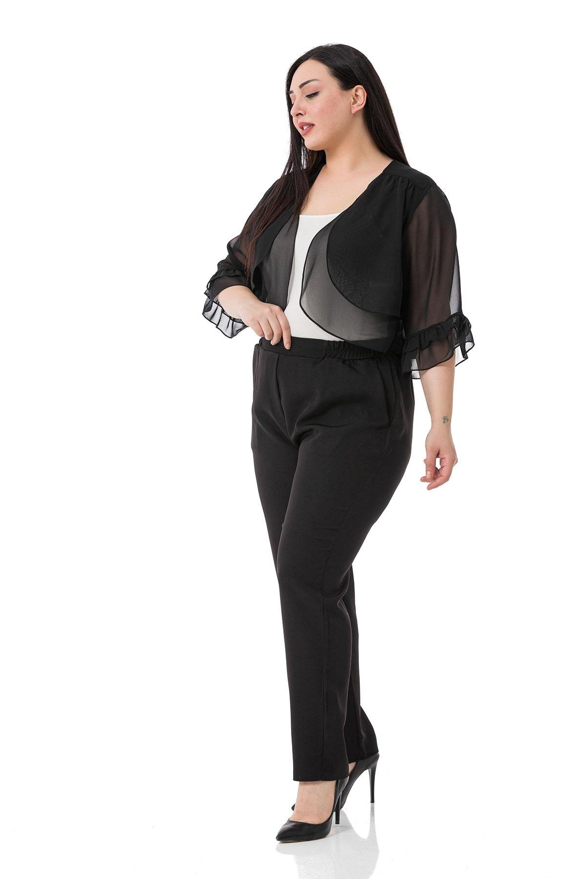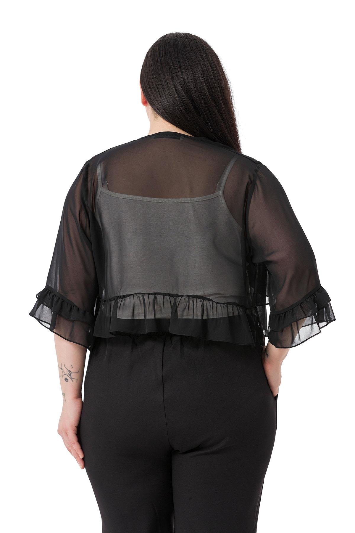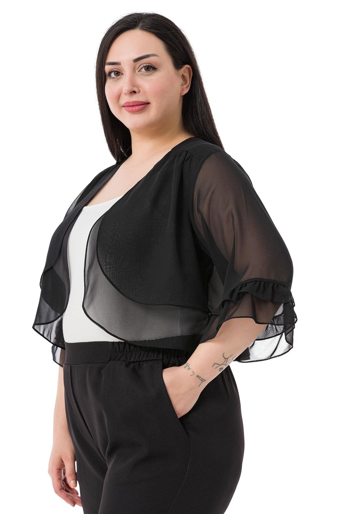 Büyük beden önü çift kat kolu ve arkası fırfır detaylı robası büzgülü şifon bolero.