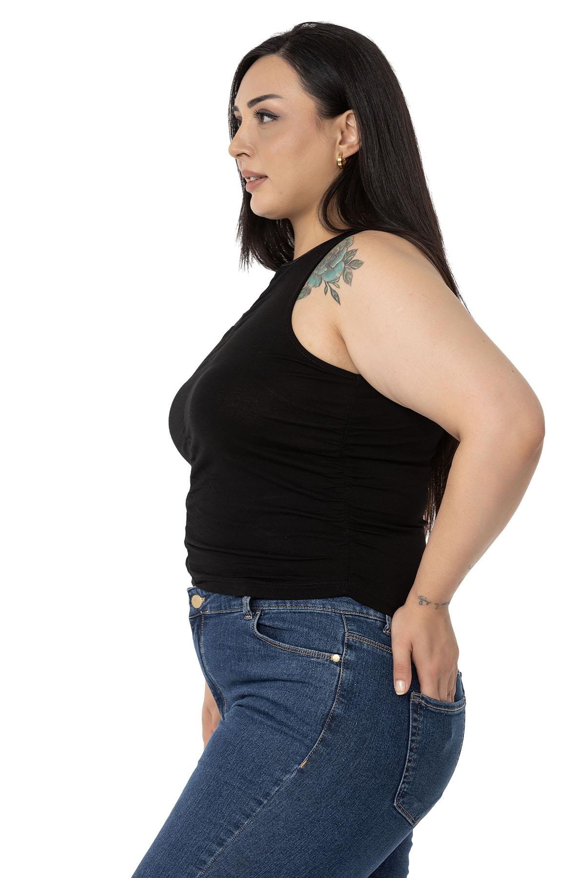 Büyük beden önü ve yanları drapeli halter yaka kısa viskon body.
