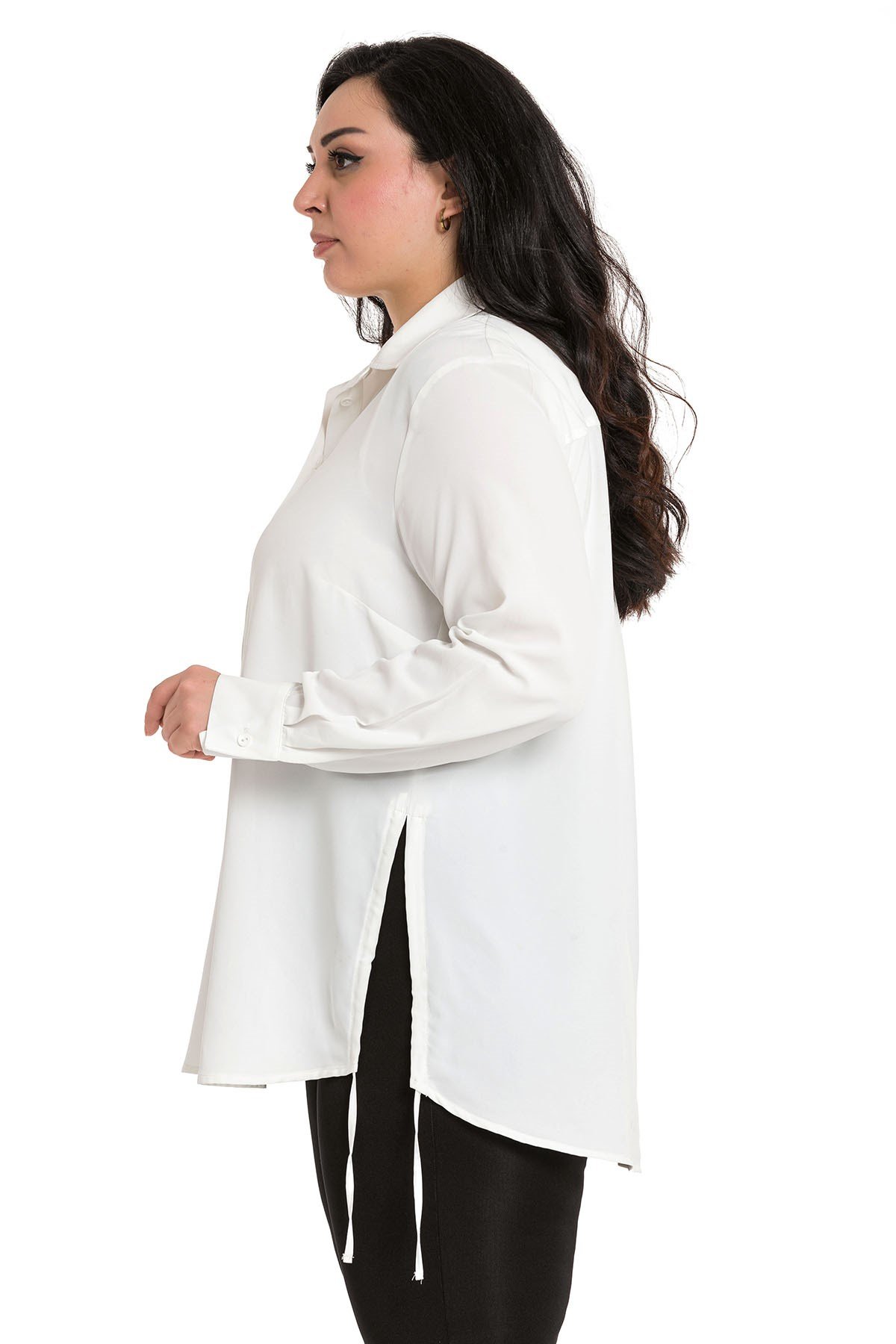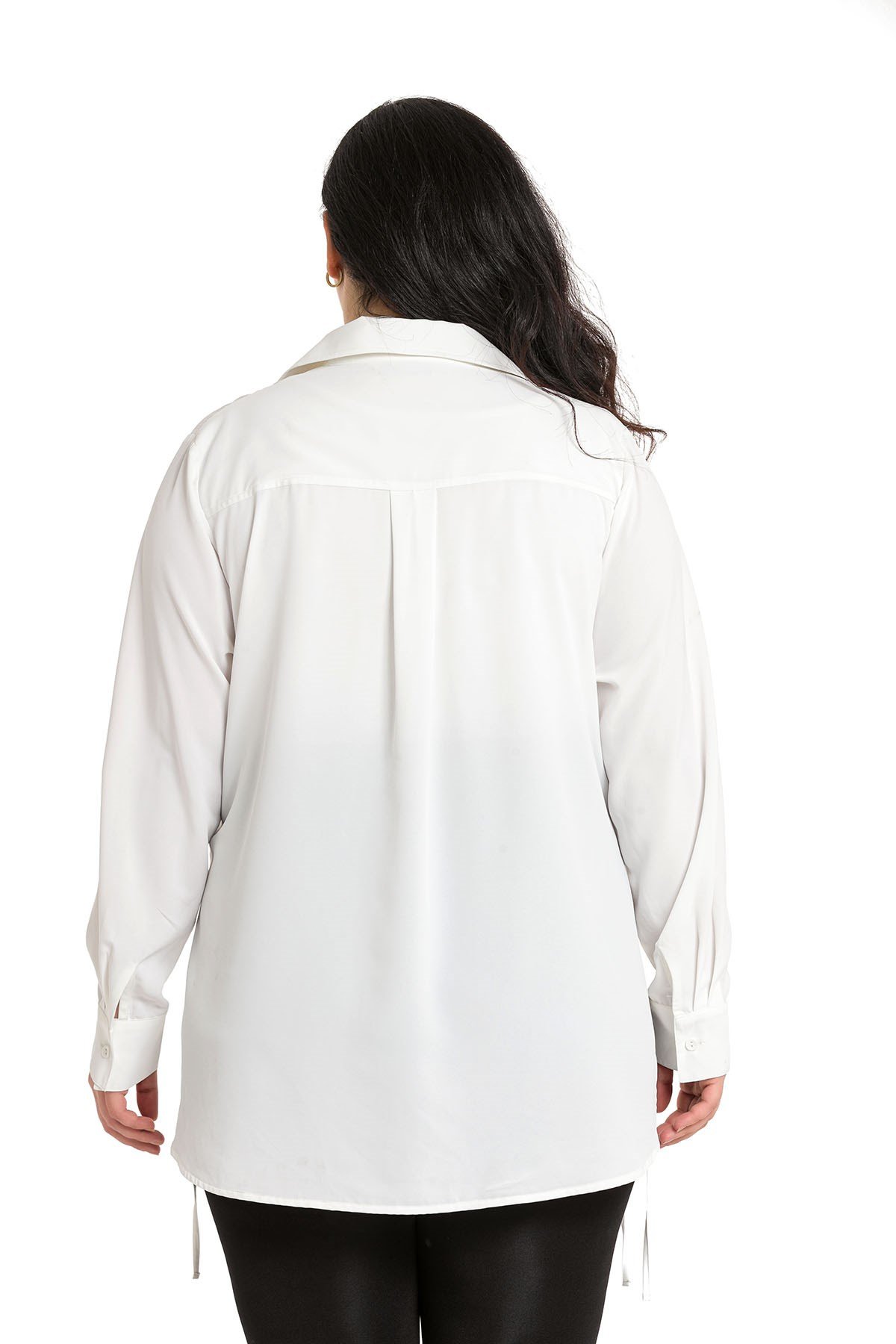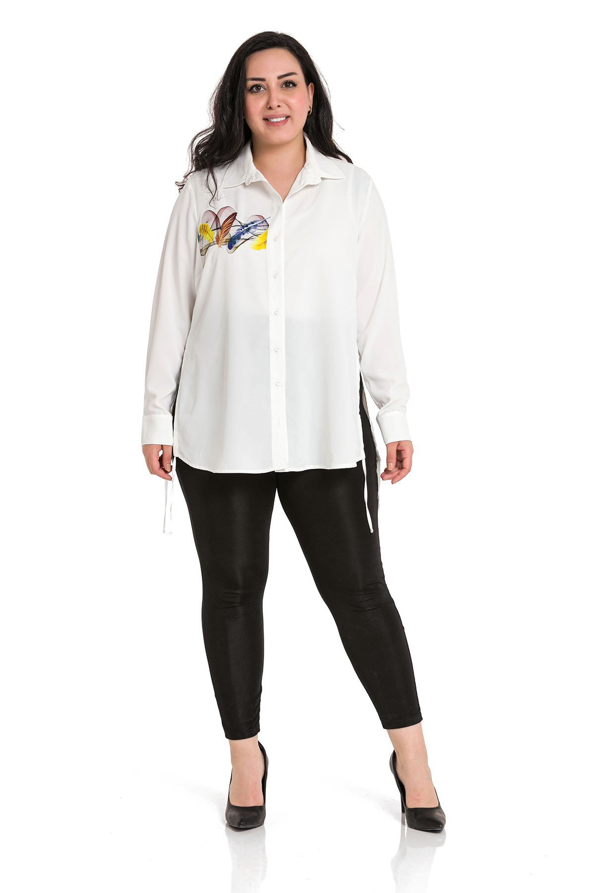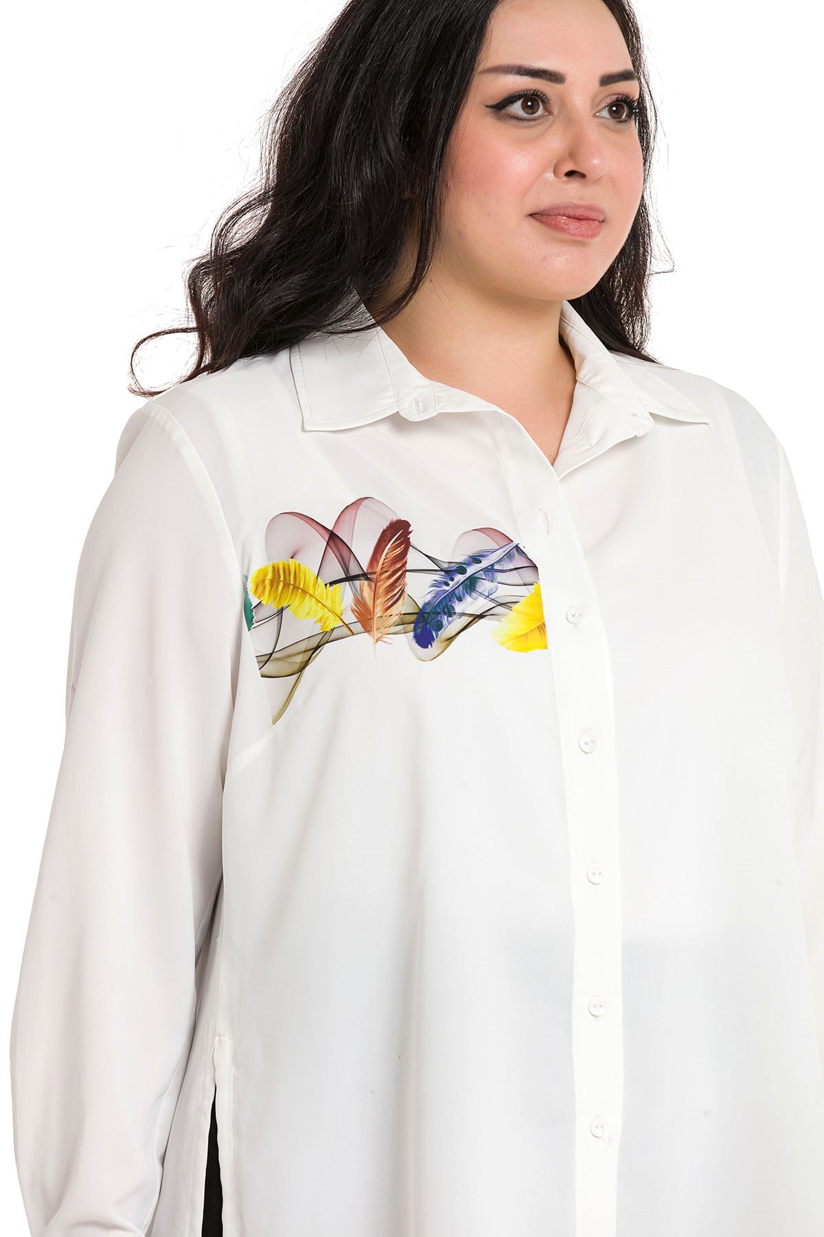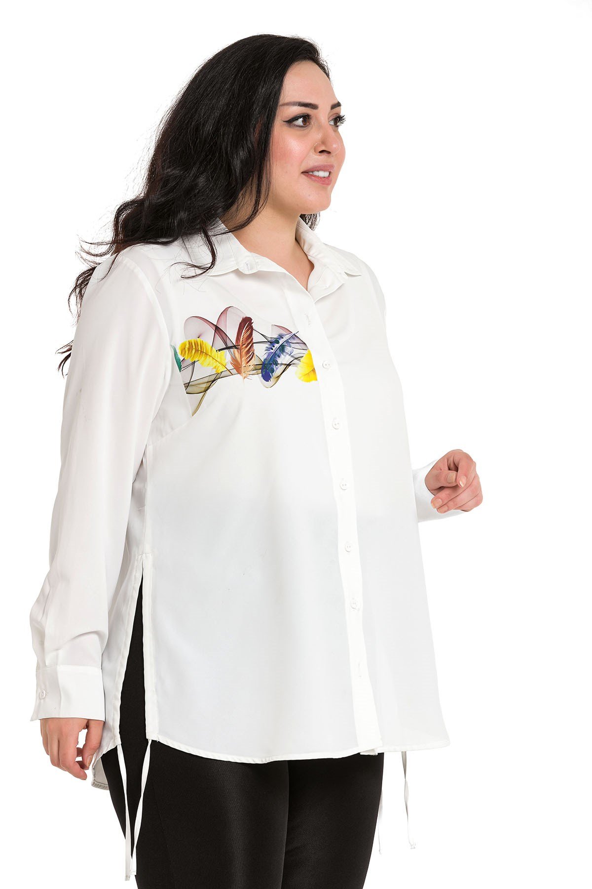 Büyük Beden Yaprak Baskılı Yanları Bağlama Detaylı Bayan Beyaz Gömlek