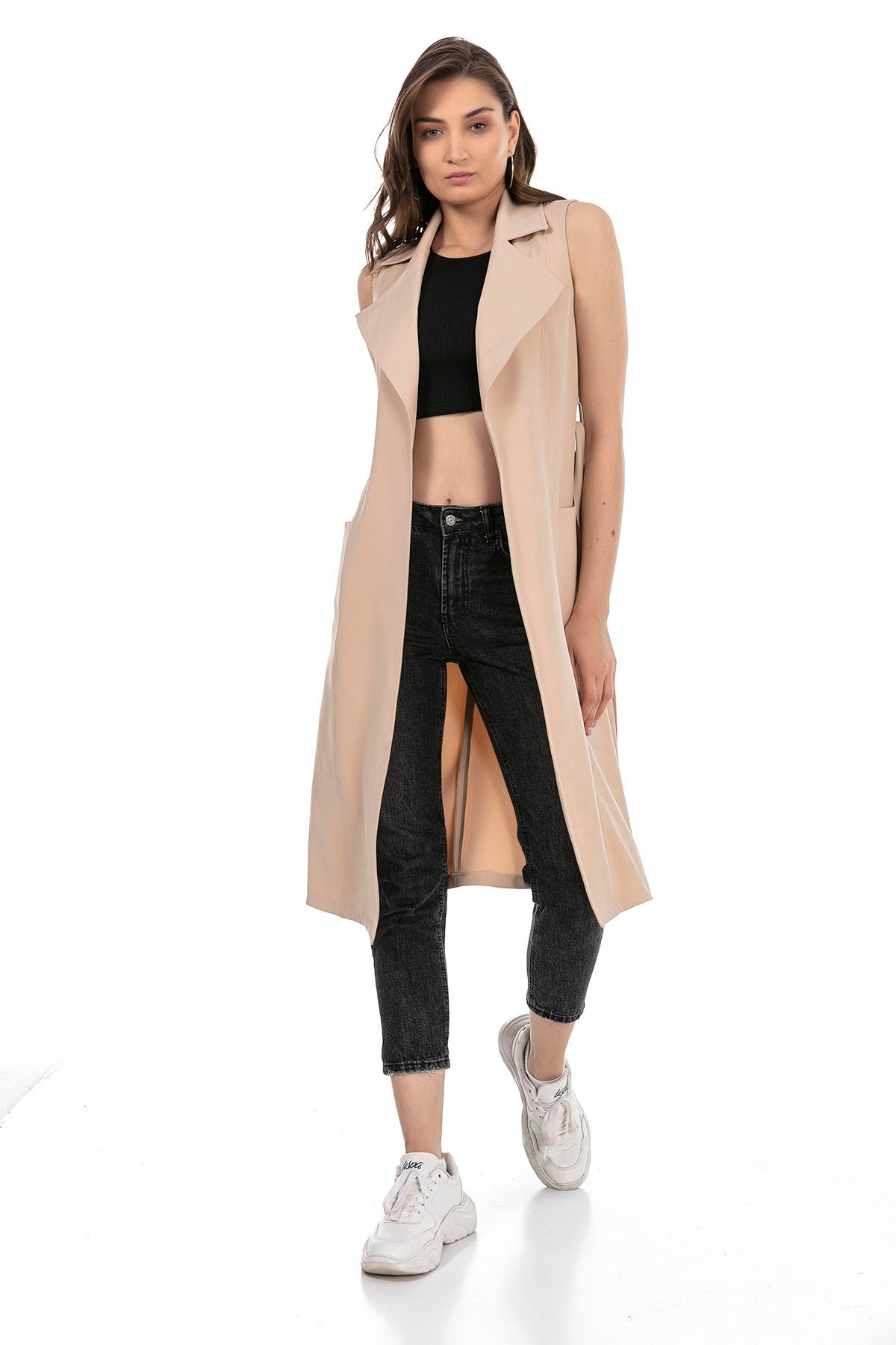 Classic Collar Midi Length Beige Vest with Pockets and Belt