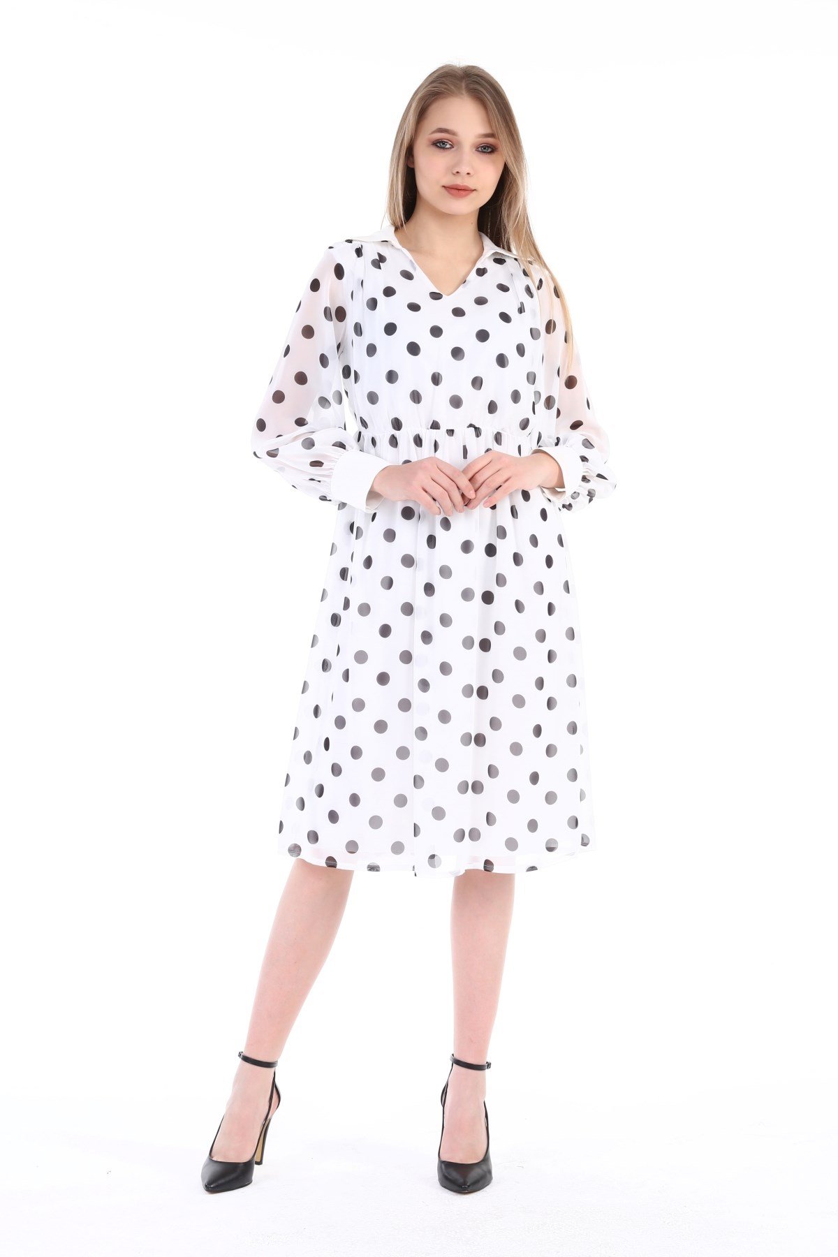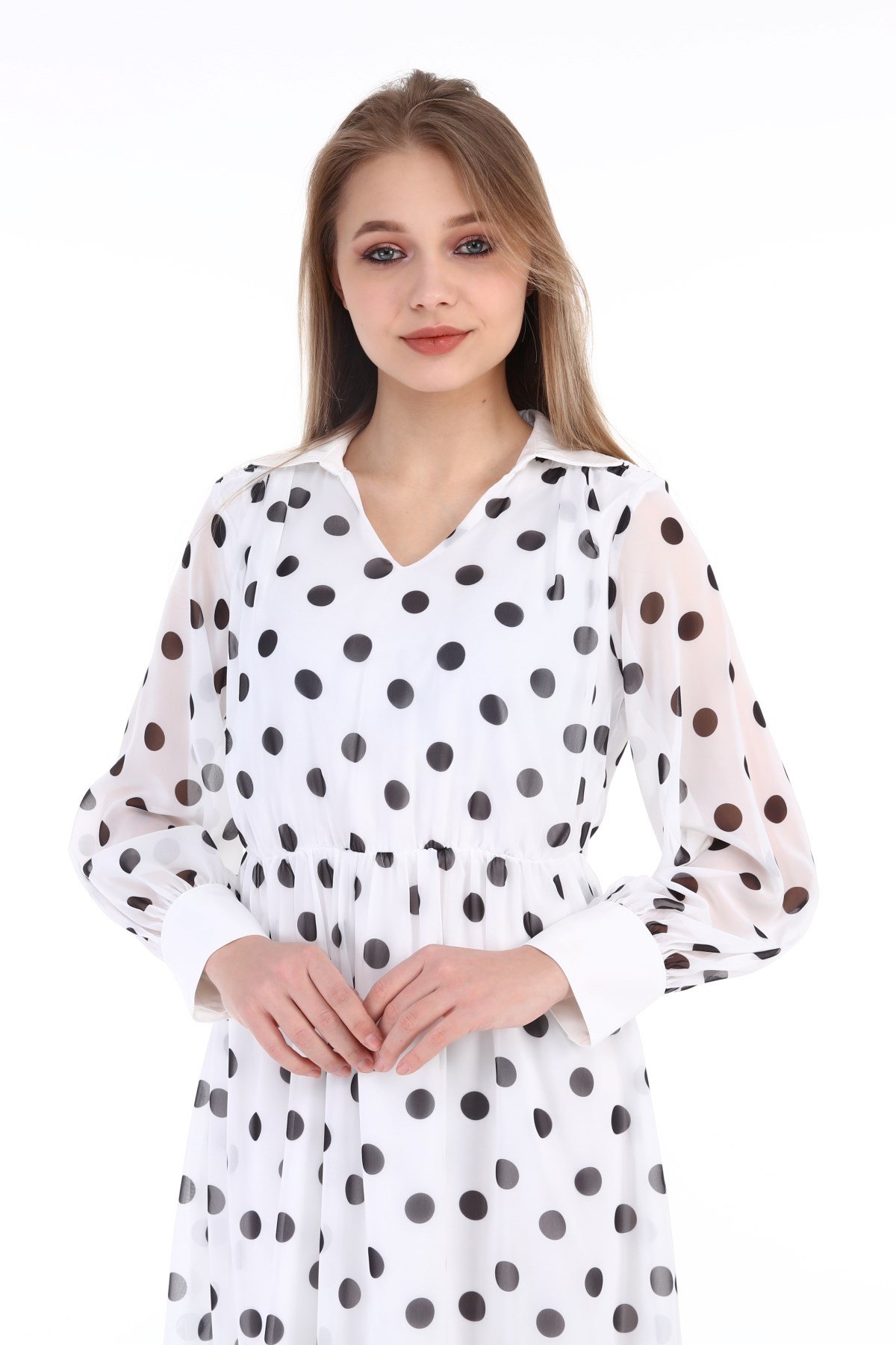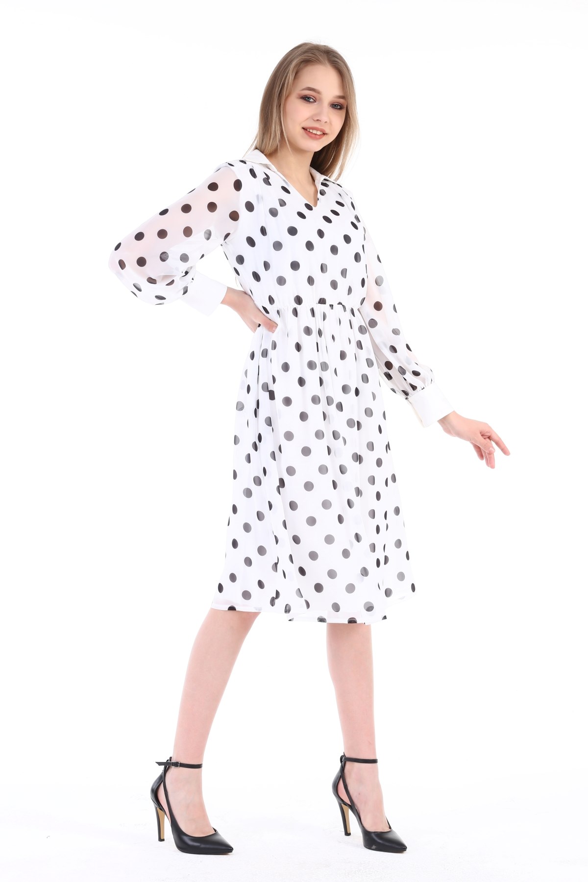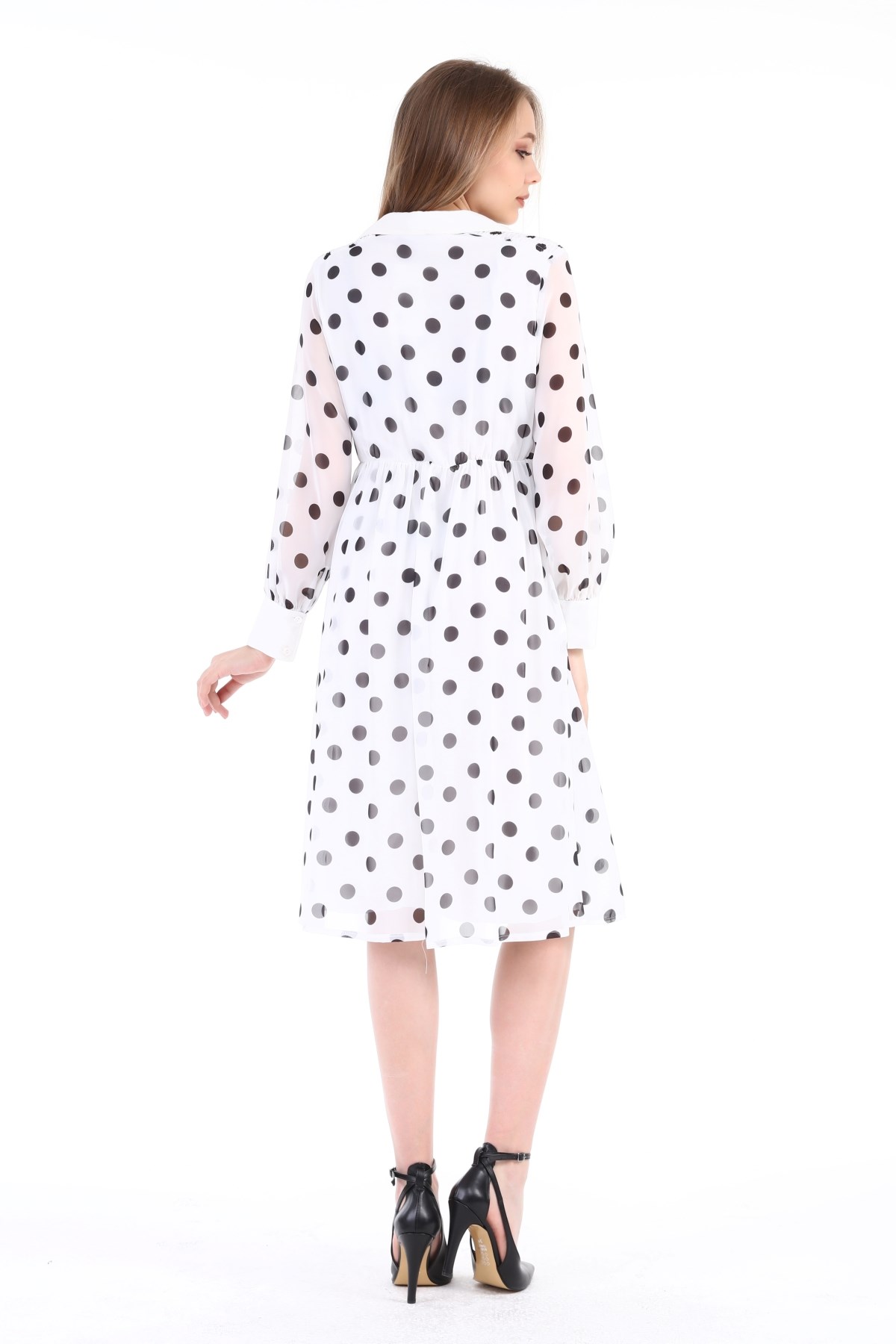 Shirt collar, gathered shoulders, cuff detail, lined chiffon polka dot dress.
