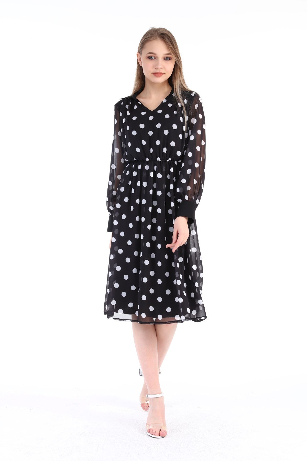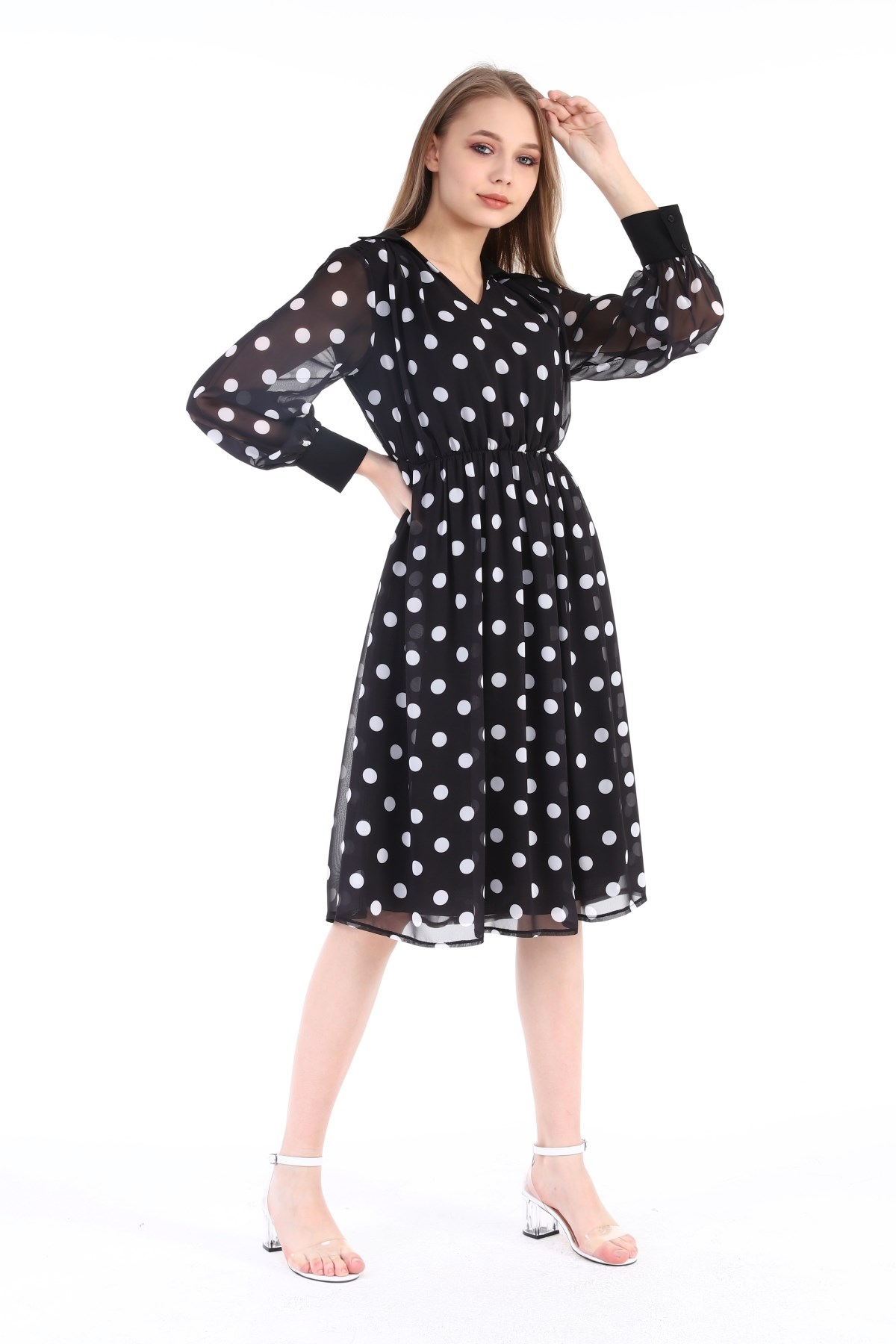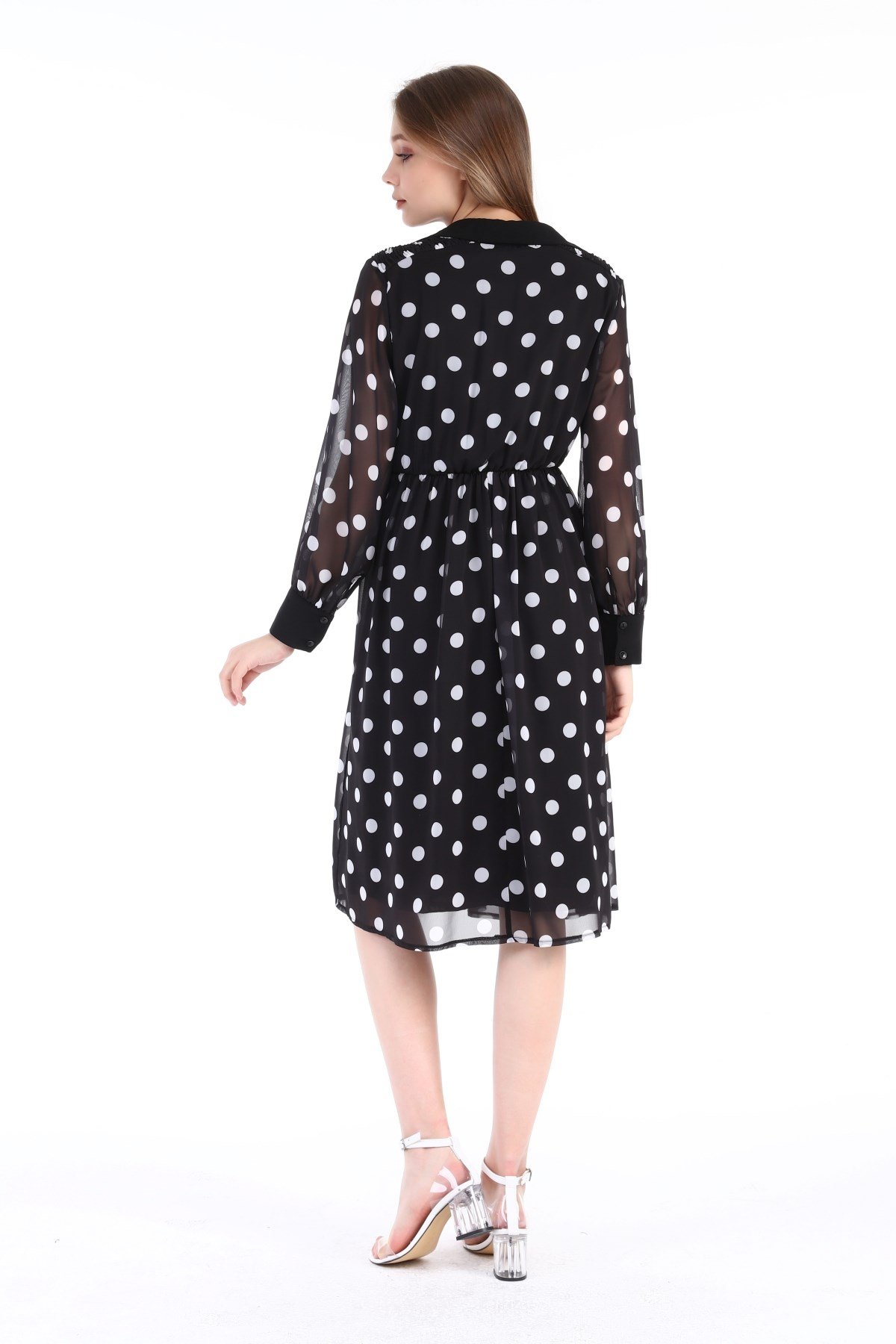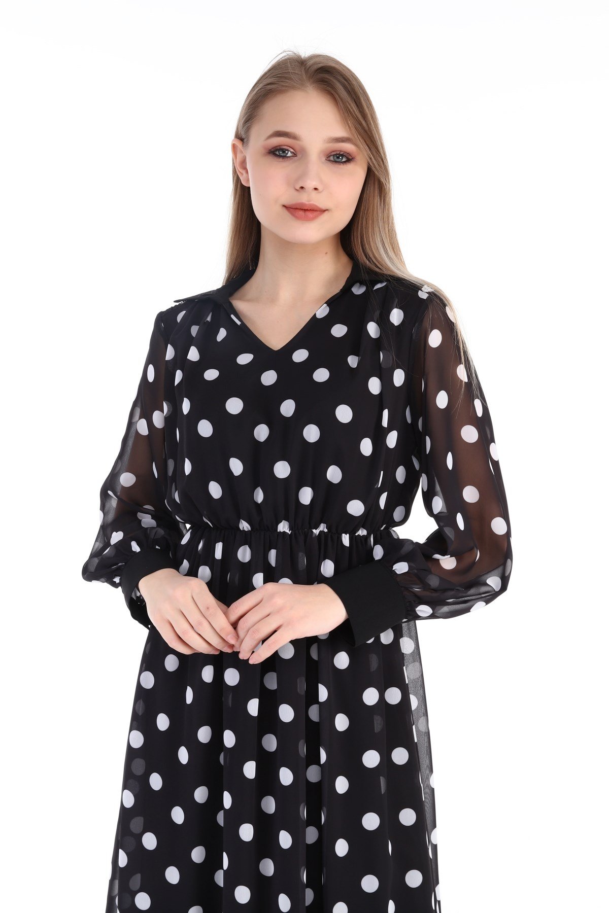 Shirt Collar Shoulder Ruffle Detailed Cuffed Lined Chiffon Polka Dot Black Dress