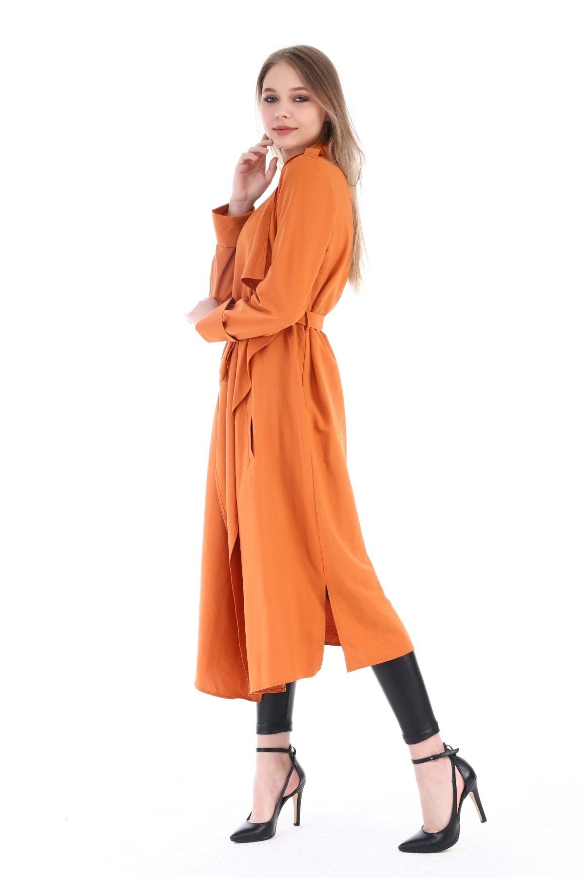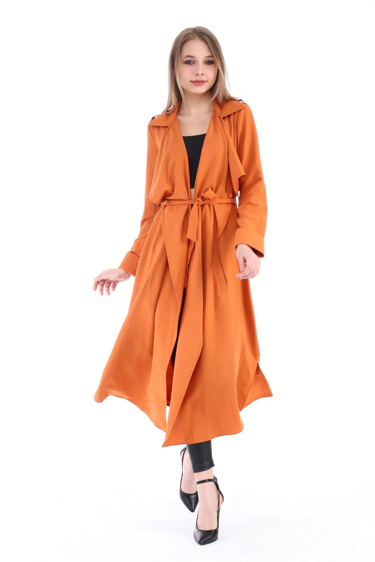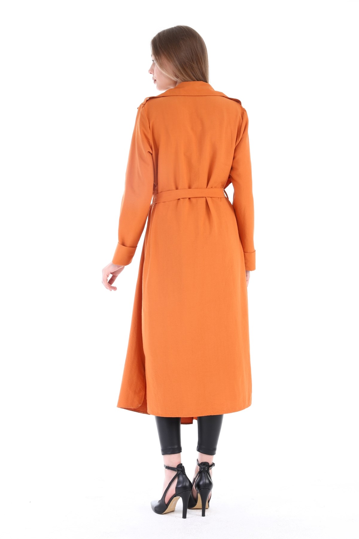 Long Claret Brick Women's Jacket with Epaulettes, Slits on the Sides and a Belt
