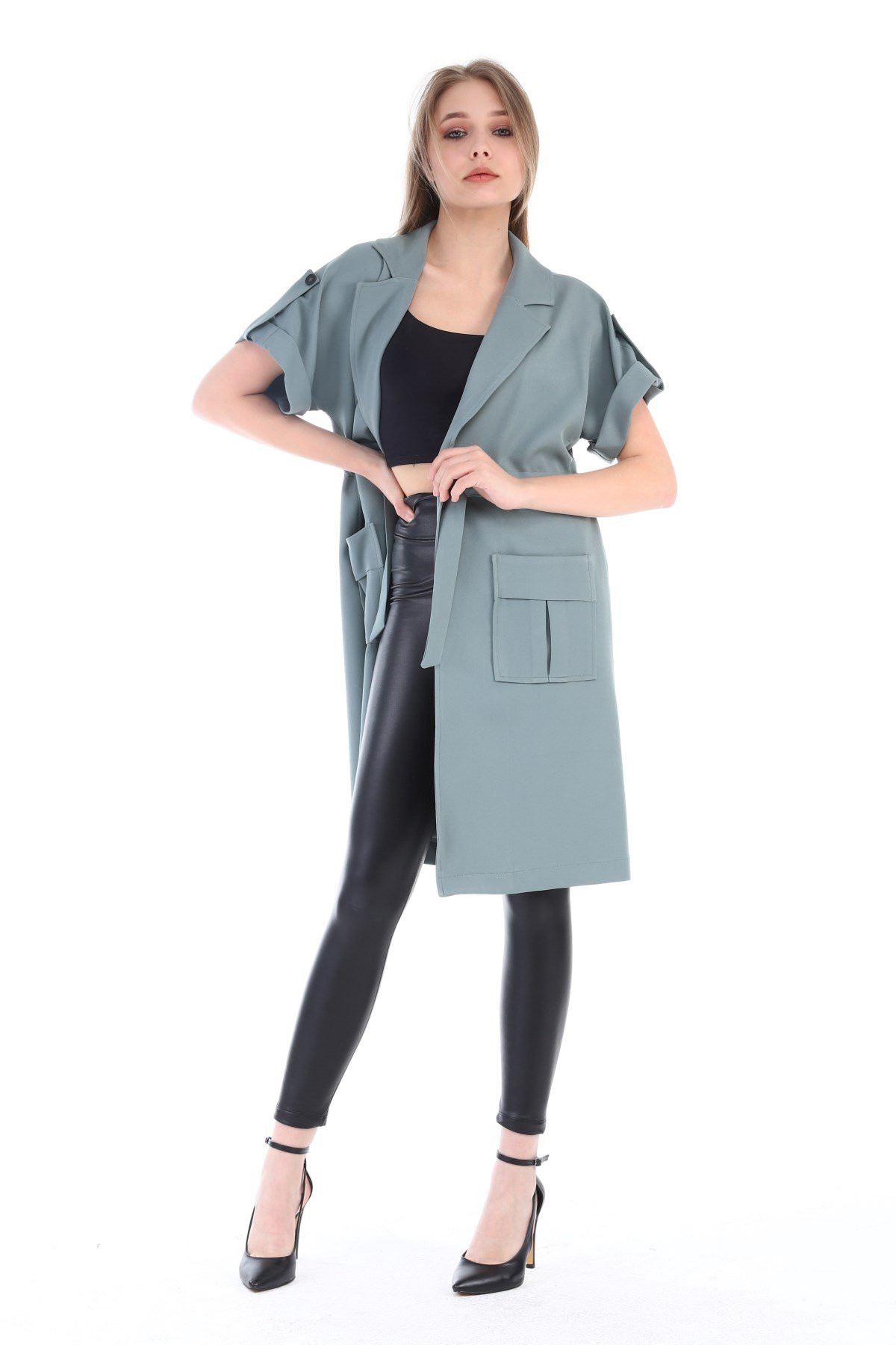 Mono collar, tunnel waist, pockets, epaulettes, short sleeve unlined vest.