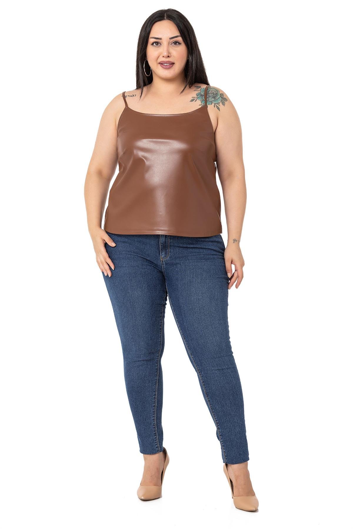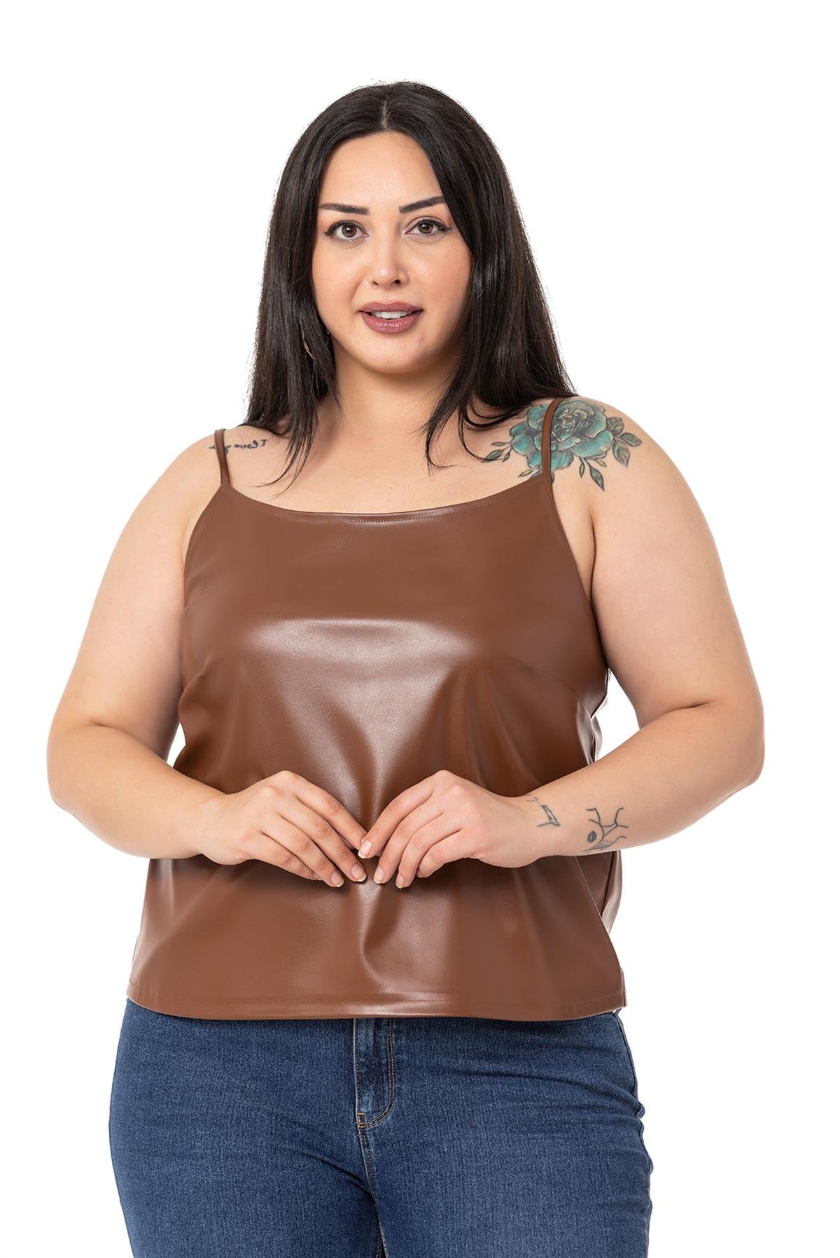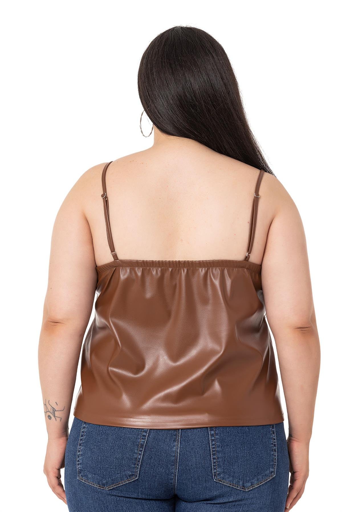 Large size adjustable thin straps elasticated back faux leather blouse.