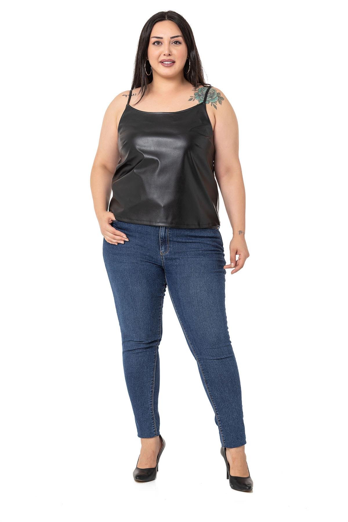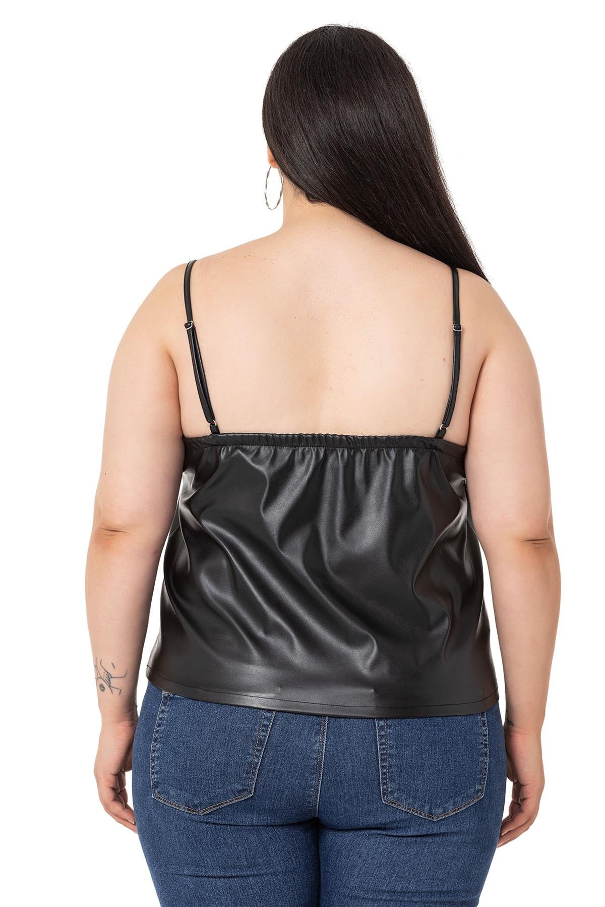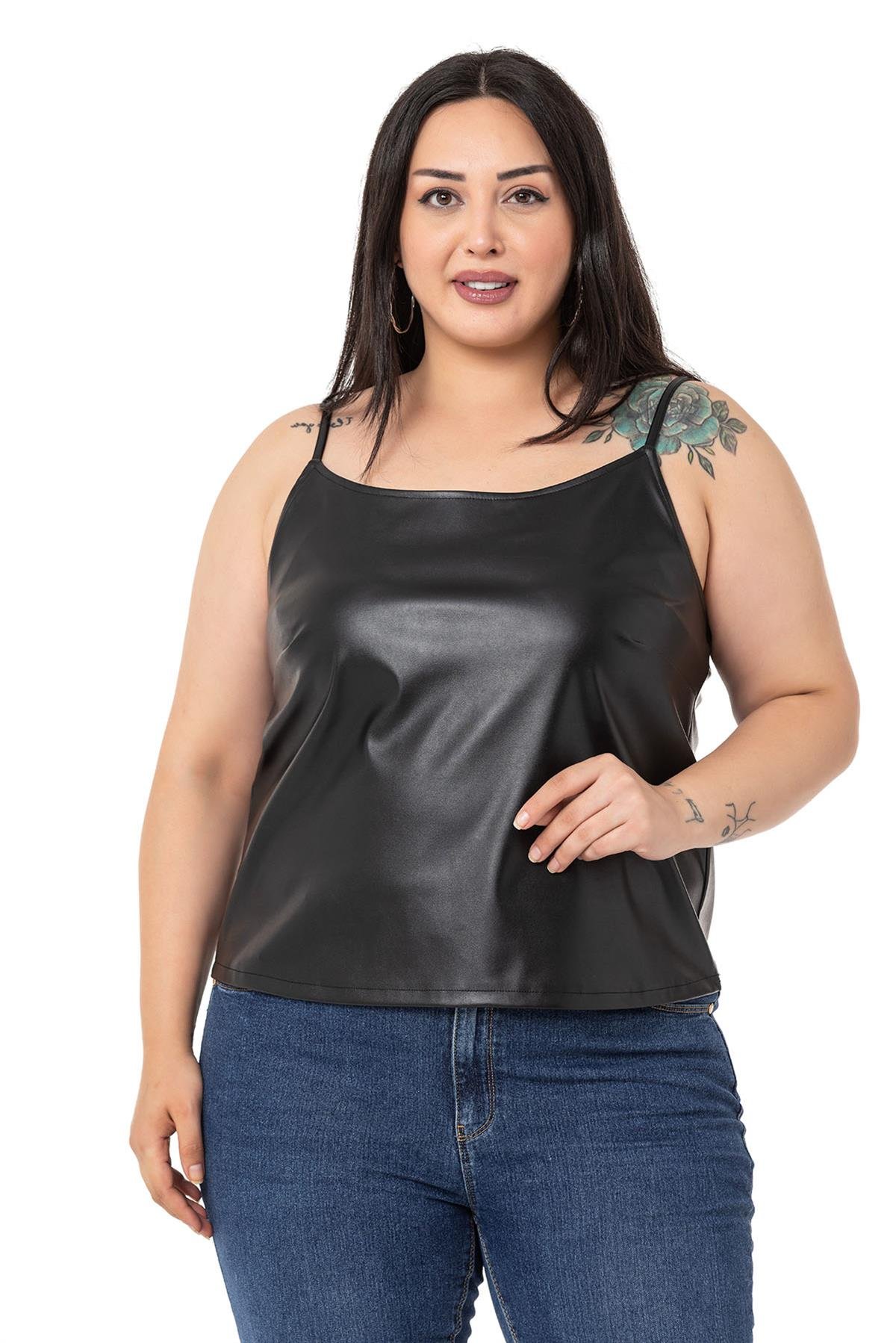 Large size adjustable thin straps elasticated back faux leather blouse.