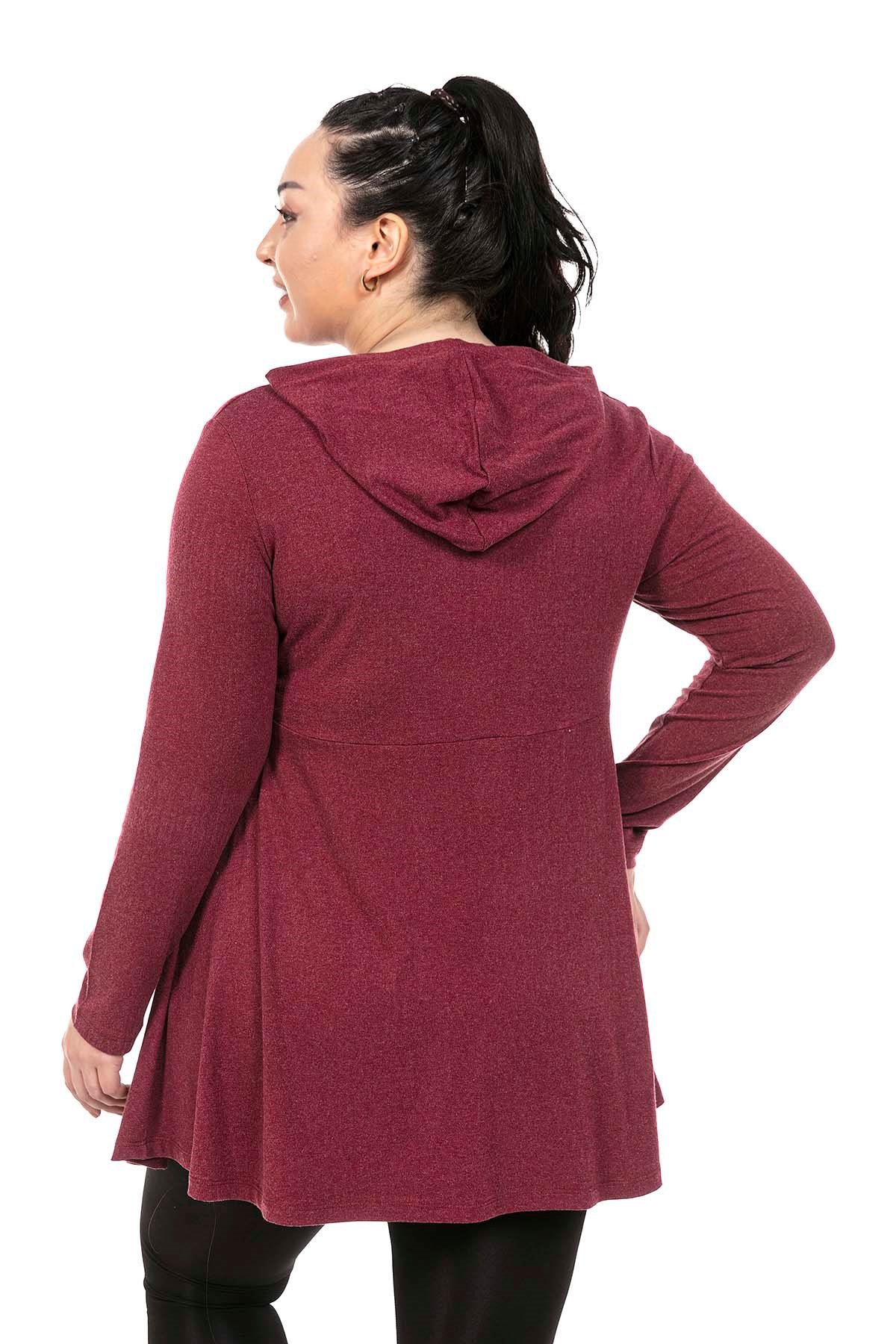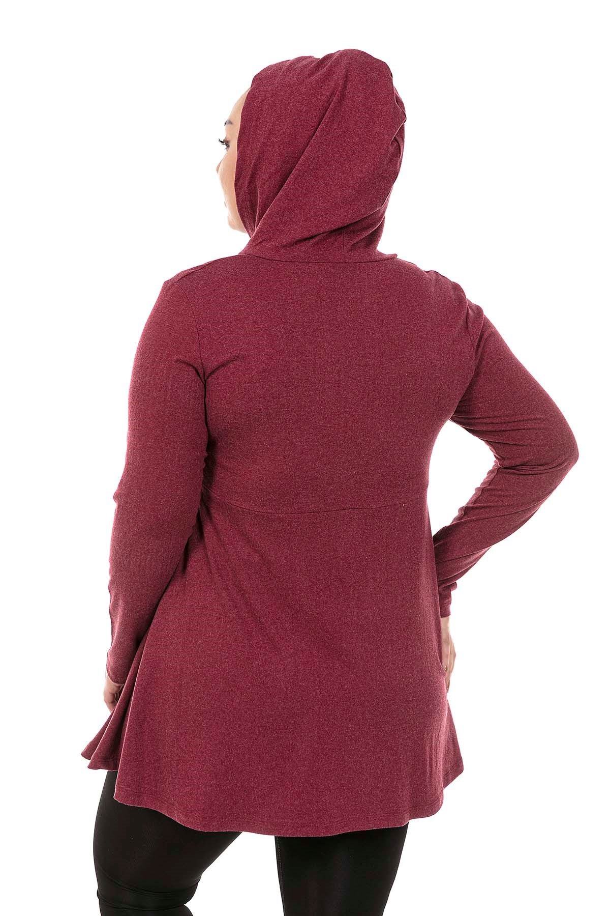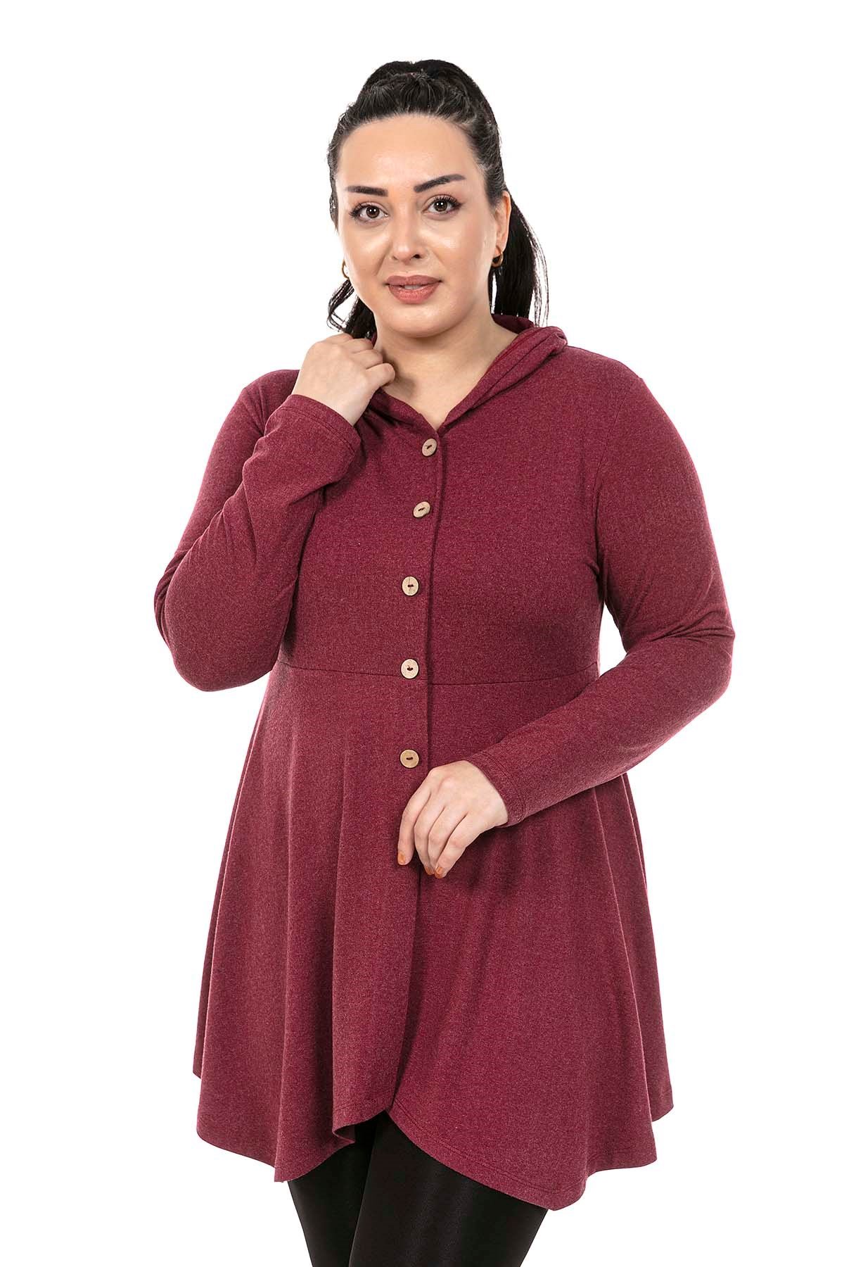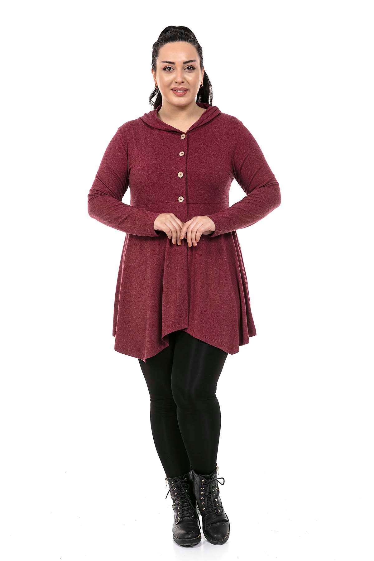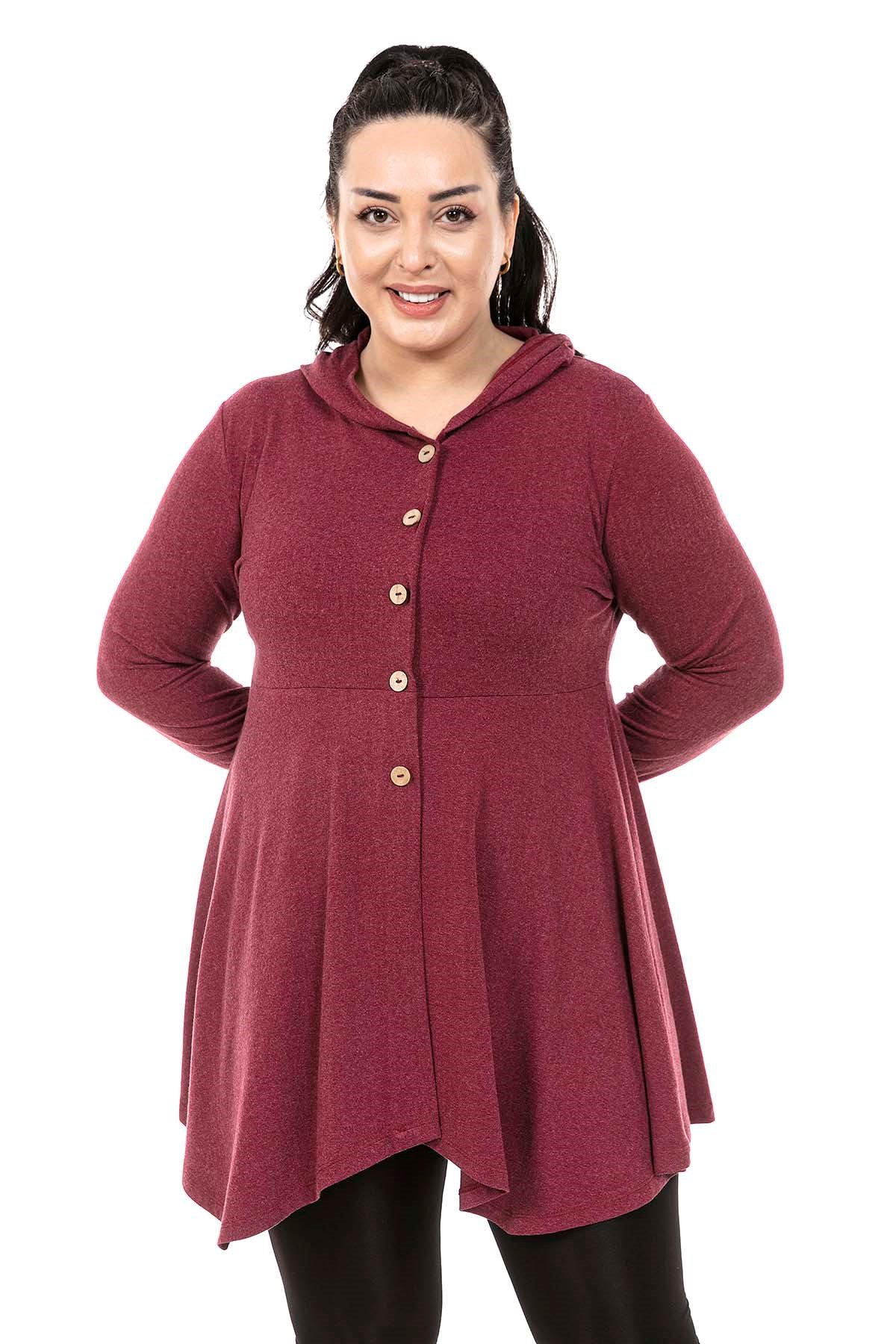 Plus Size Asymmetrical Cut Hooded Fake Button Detailed Wool Viscose Burgundy Blouse
