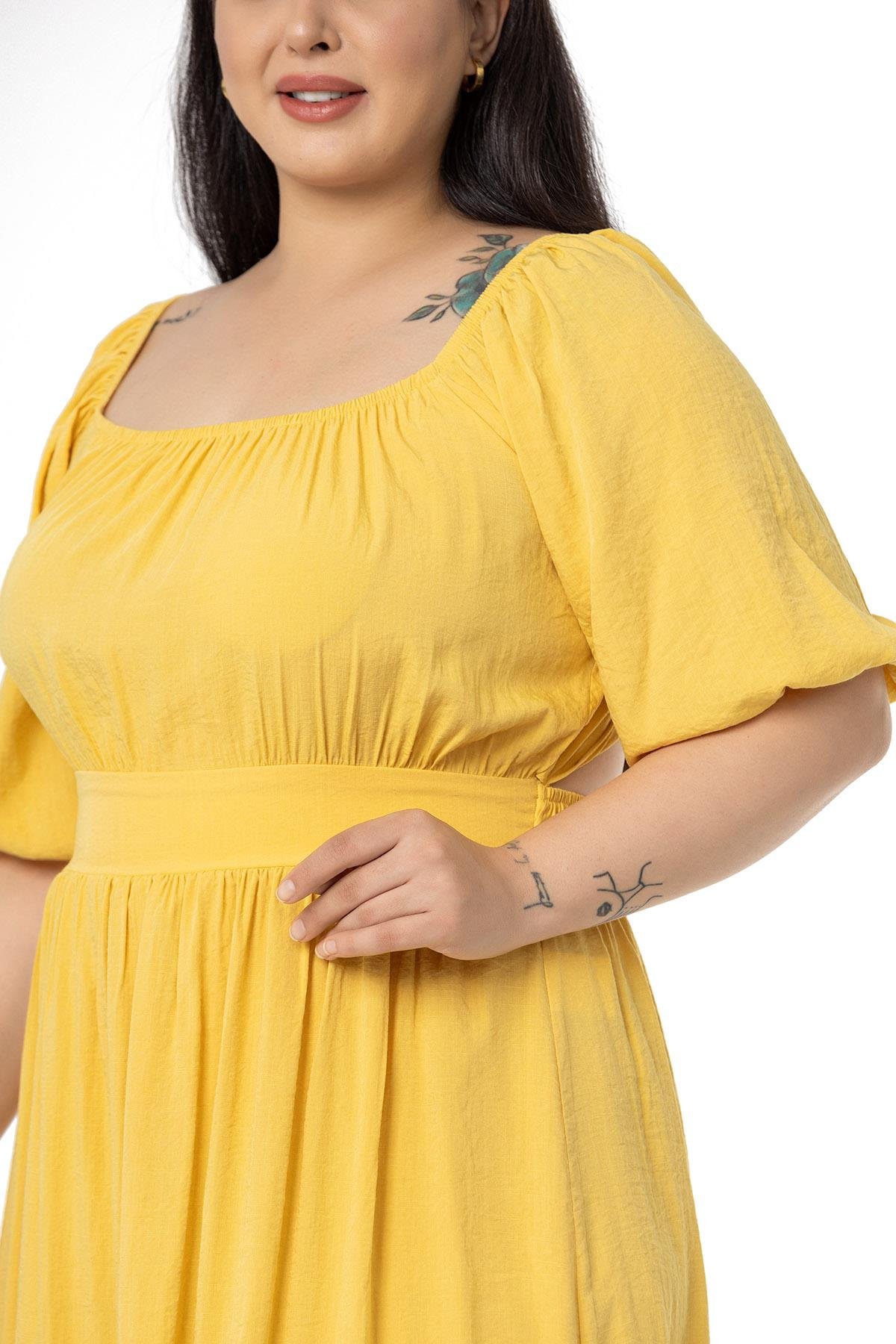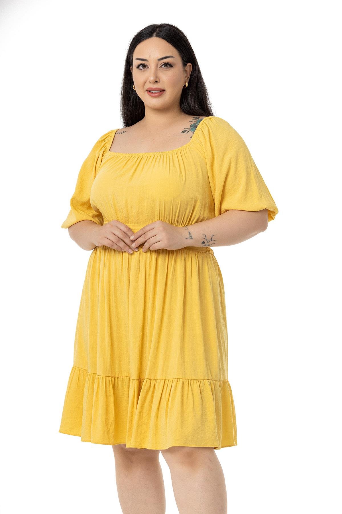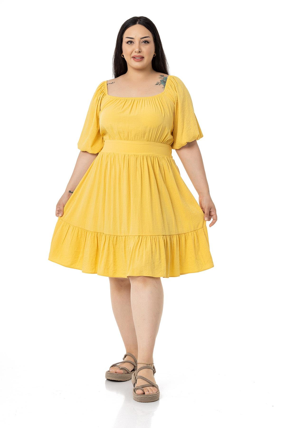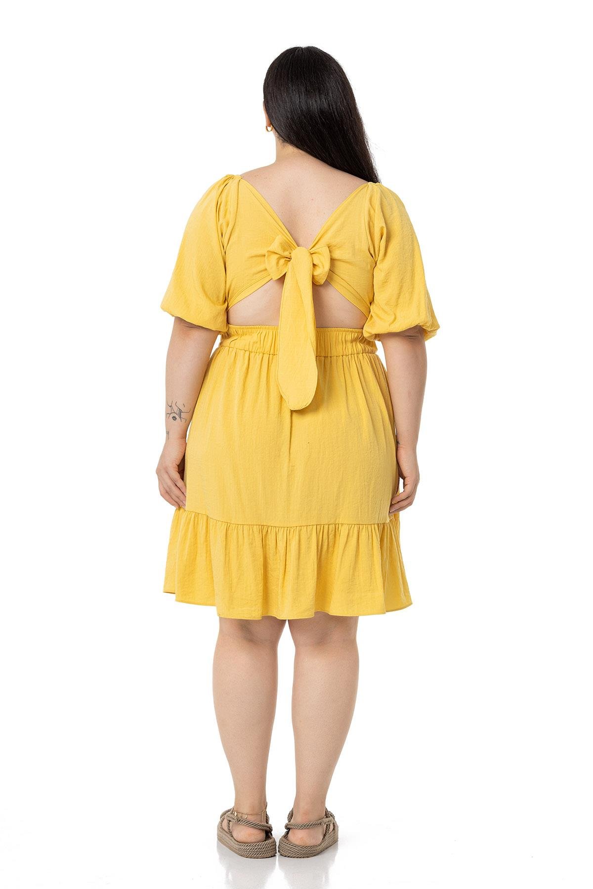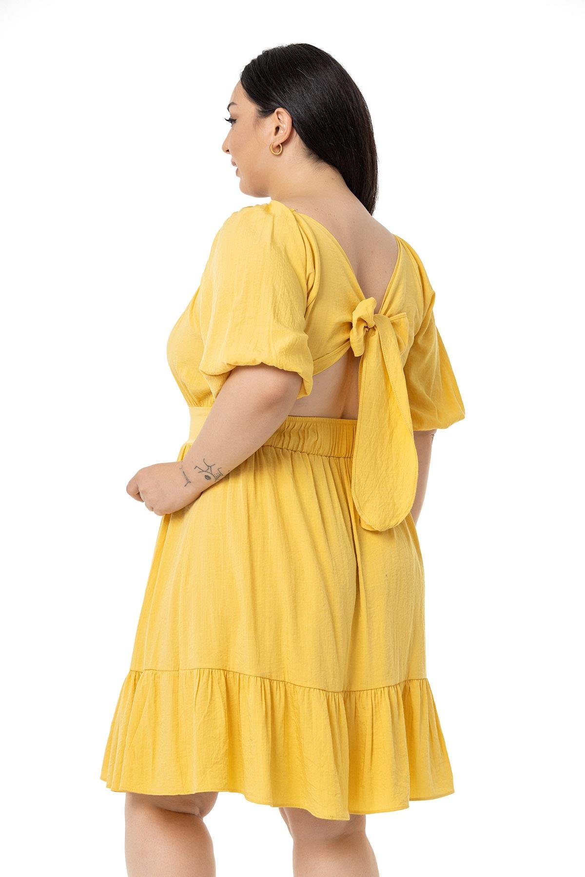 Large size short dress with low-cut back, elasticated cuffs and neckline, ruffled skirt, elasticated waist at the back, bodice at the front.