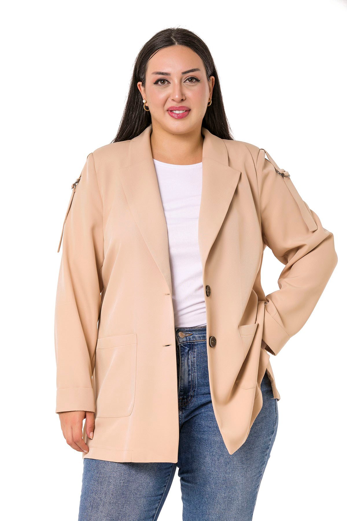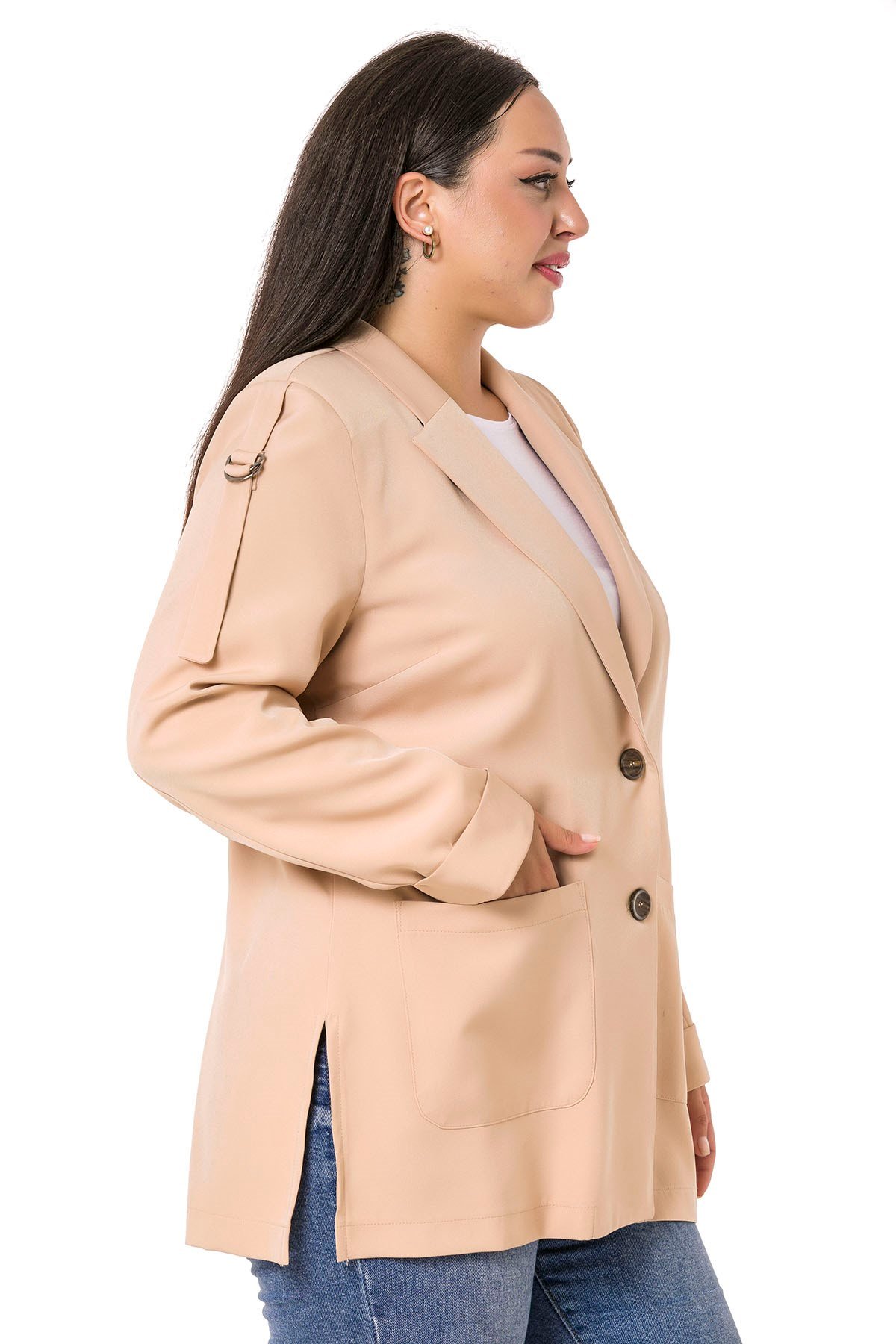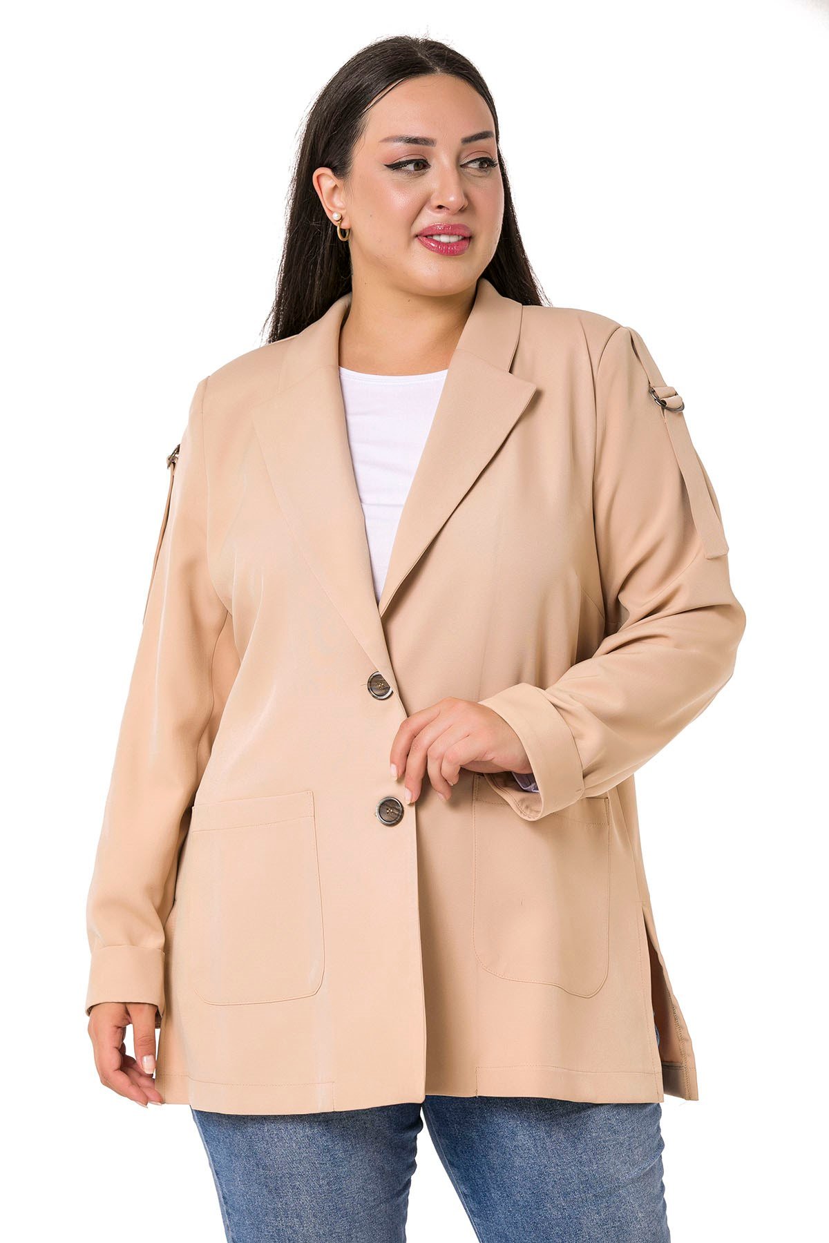 Plus size, unlined jacket with double-folded cuffs, shoulder straps and D-buckle details, side slits and bag pockets.