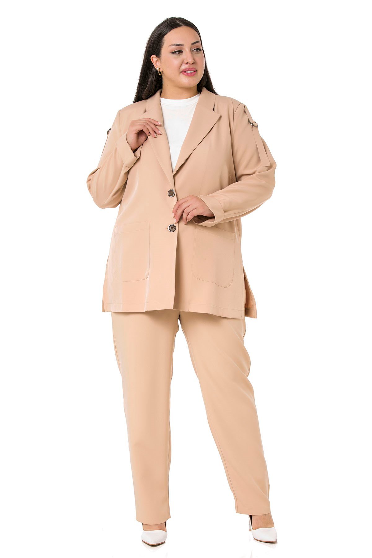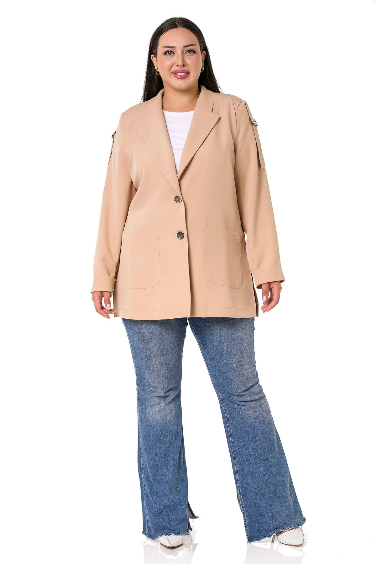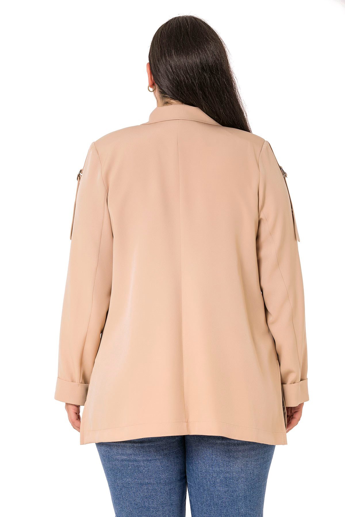 Plus size, unlined jacket with double-folded cuffs, shoulder straps and D-buckle details, side slits and bag pockets.