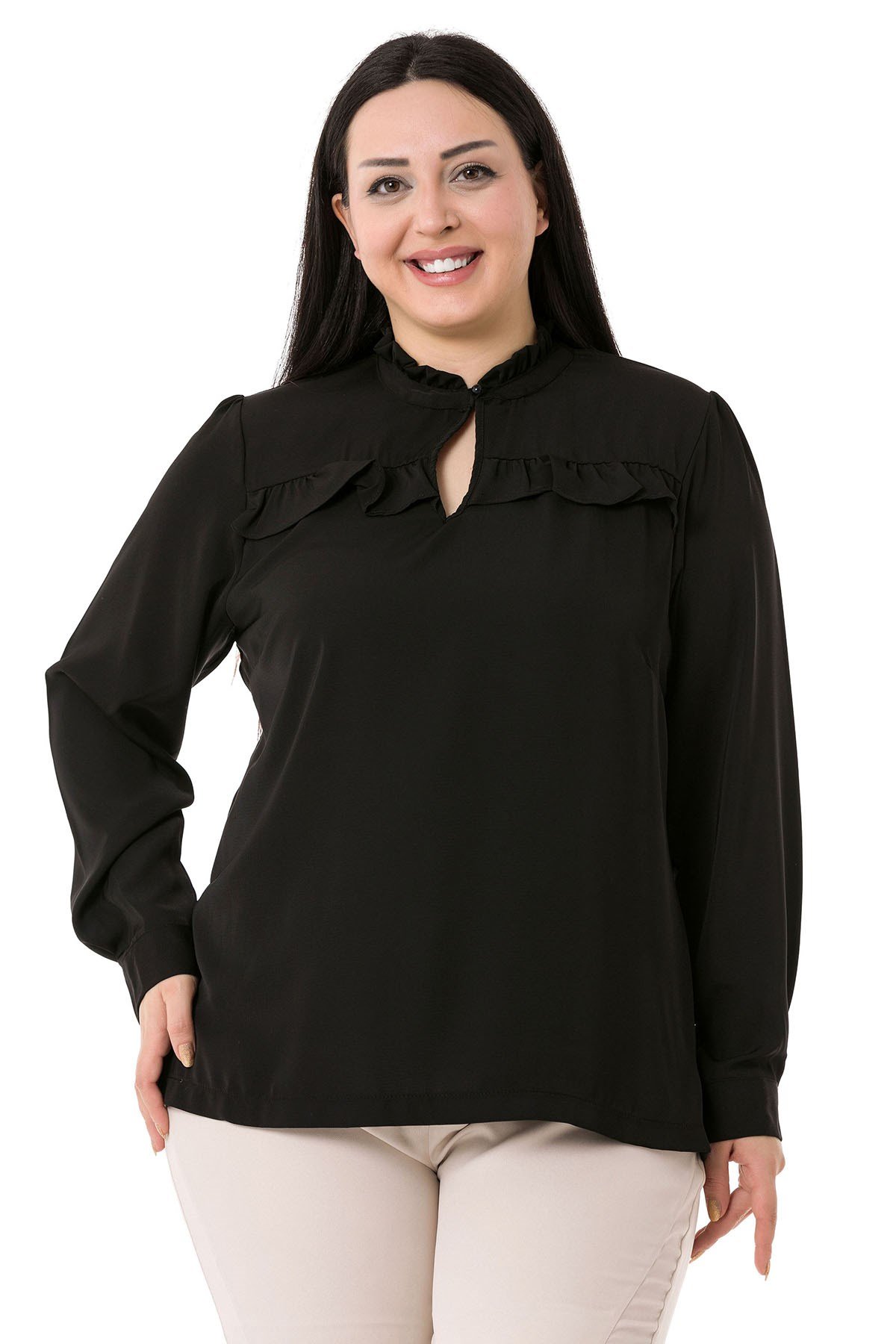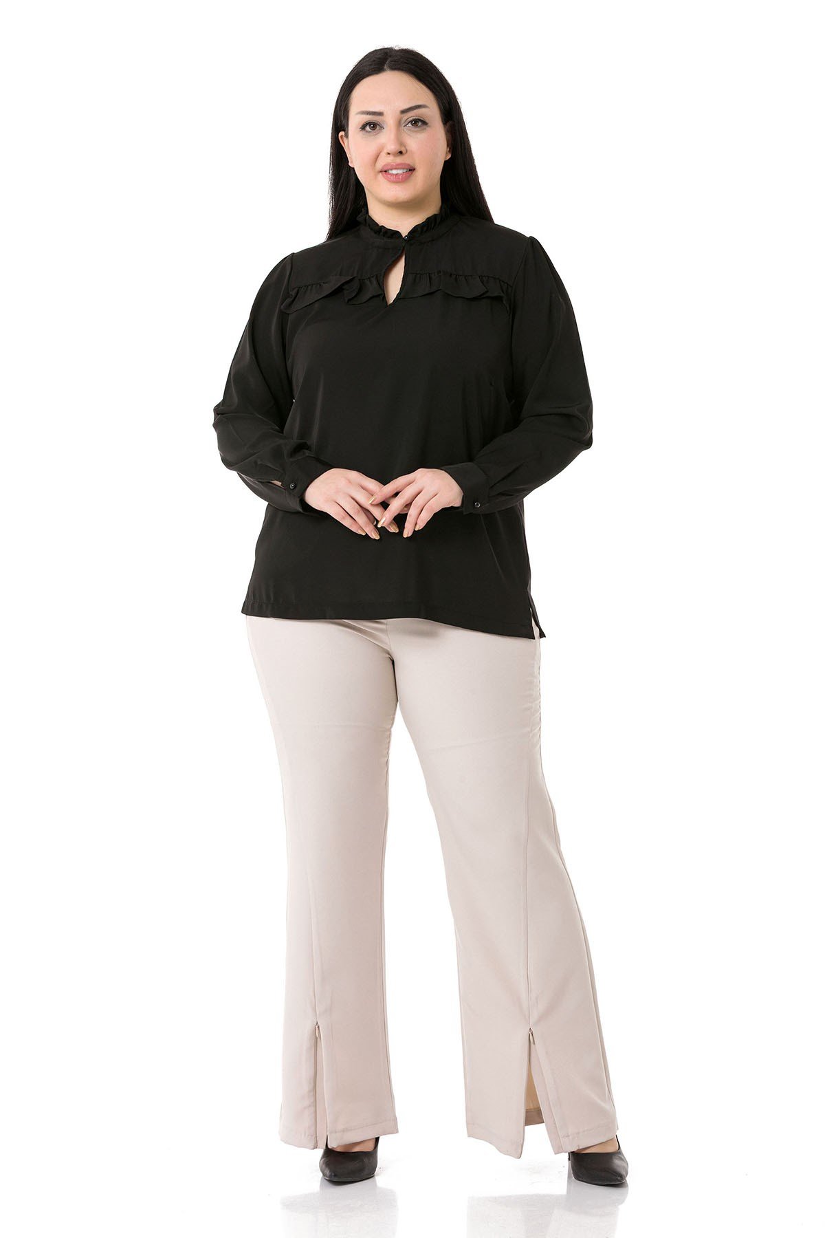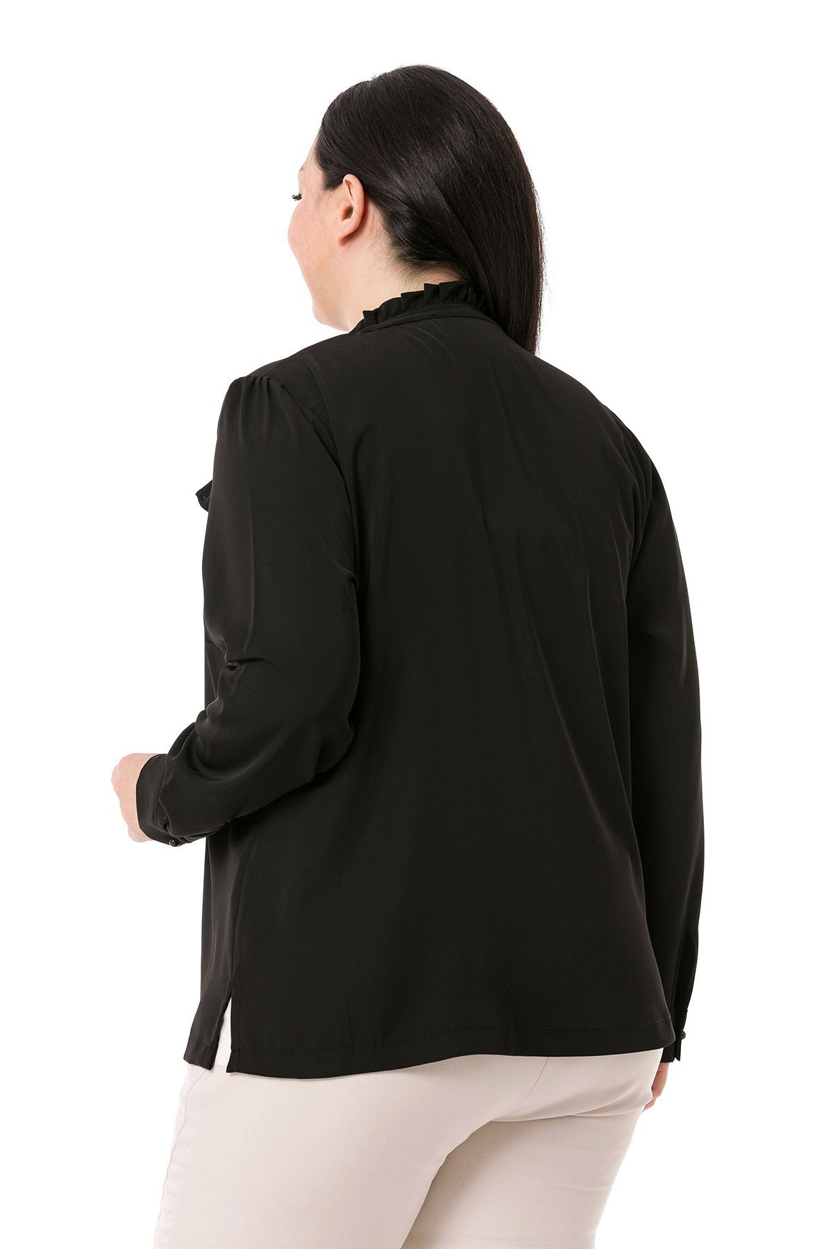 Long-sleeved blouse with a large size collar and ruffle detail on the chest, and a slit on the side.