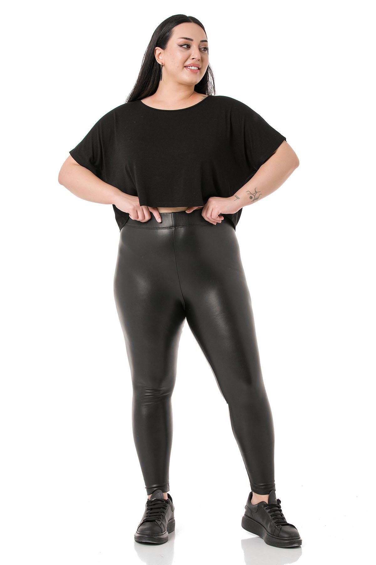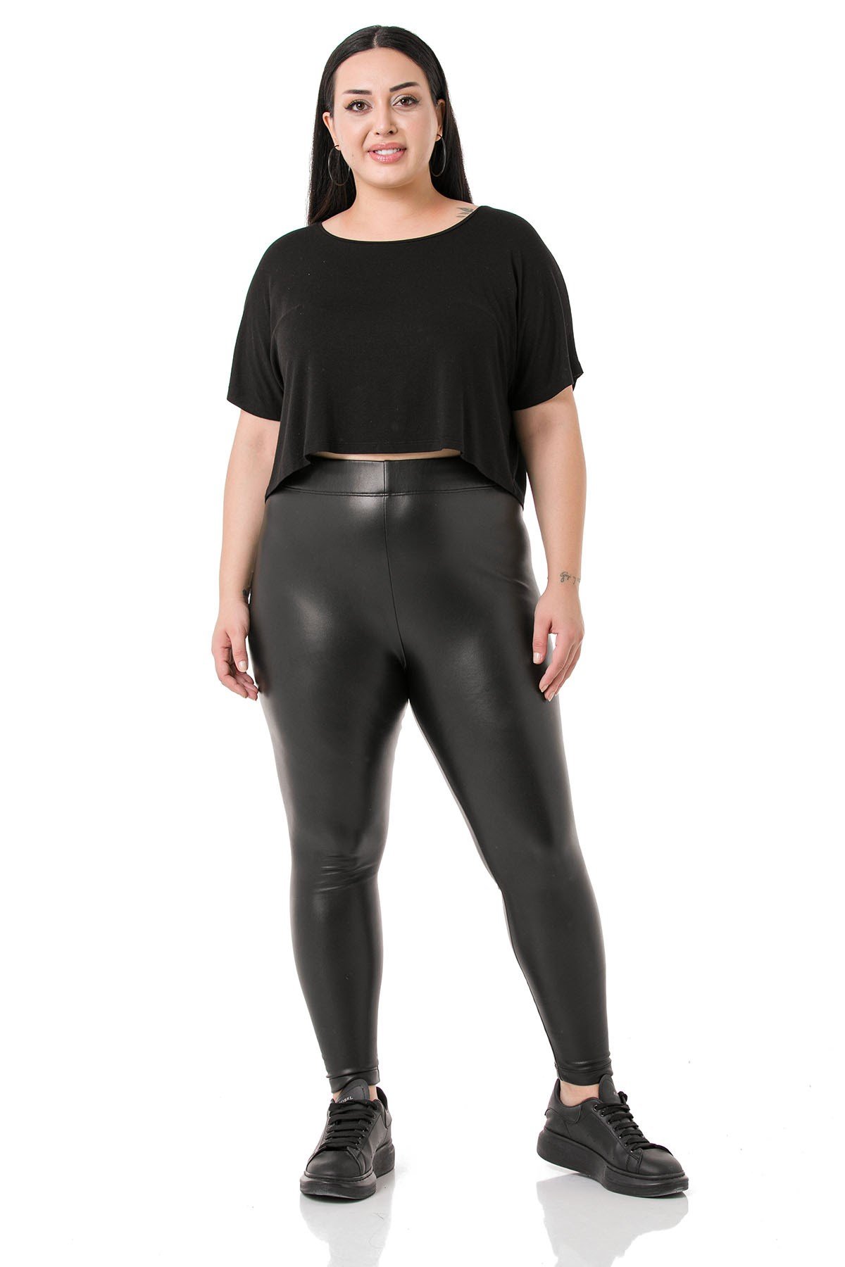 Large size, ankle-length faux leather leggings with an elasticated waist.