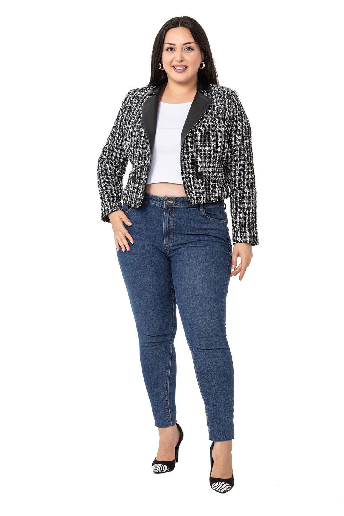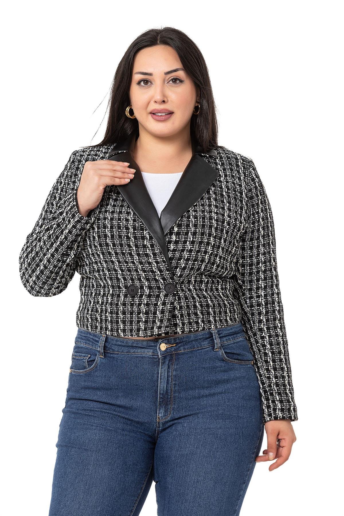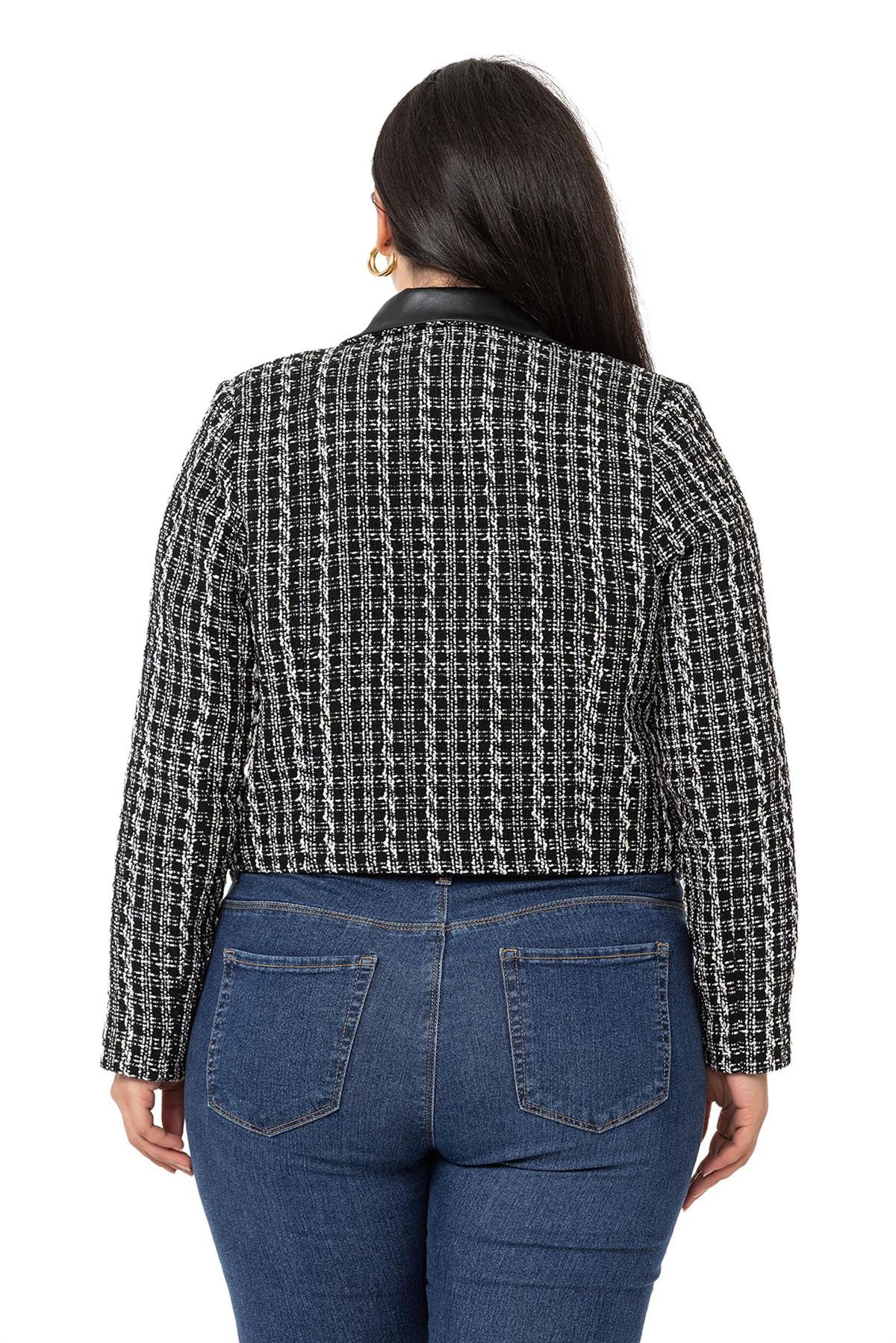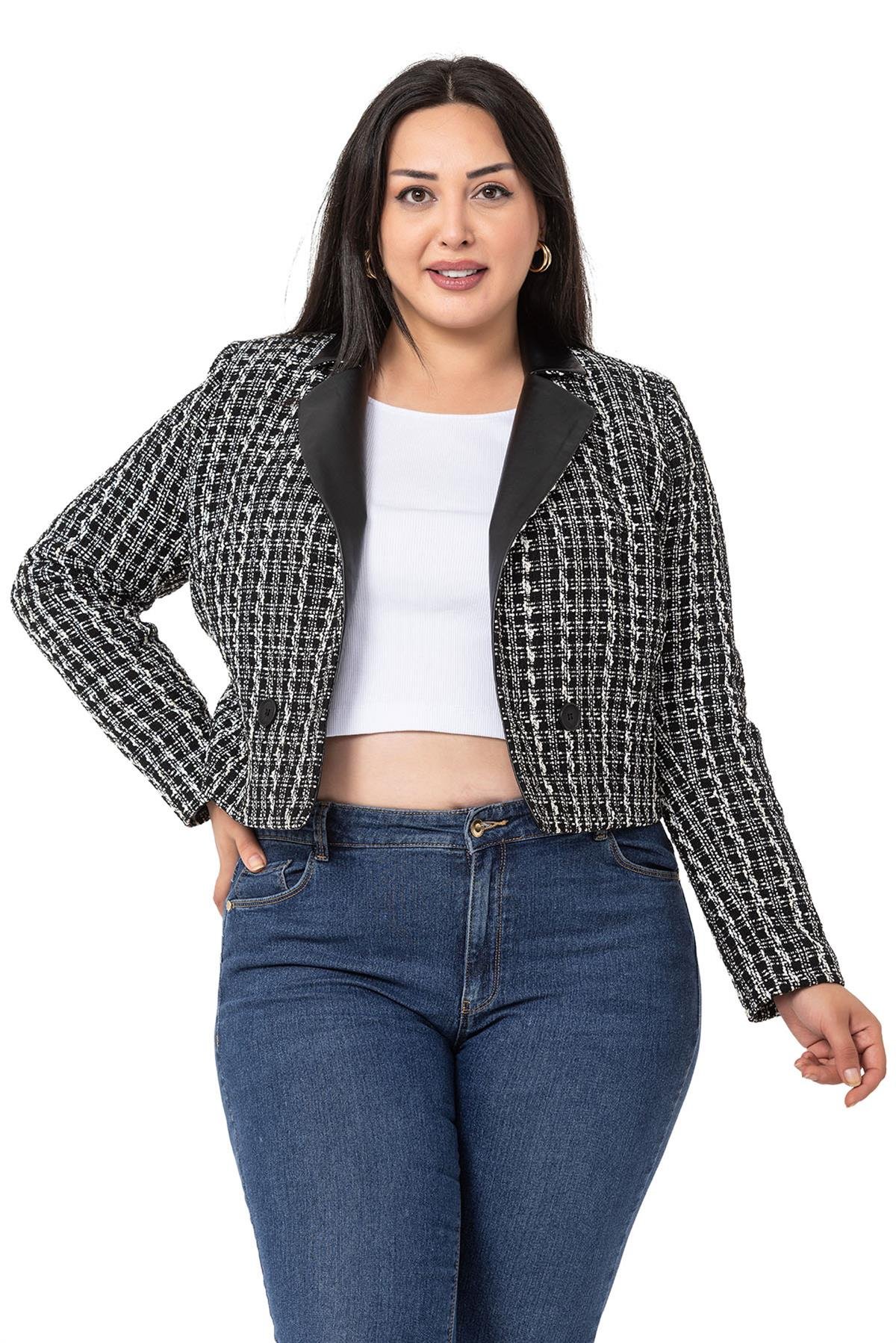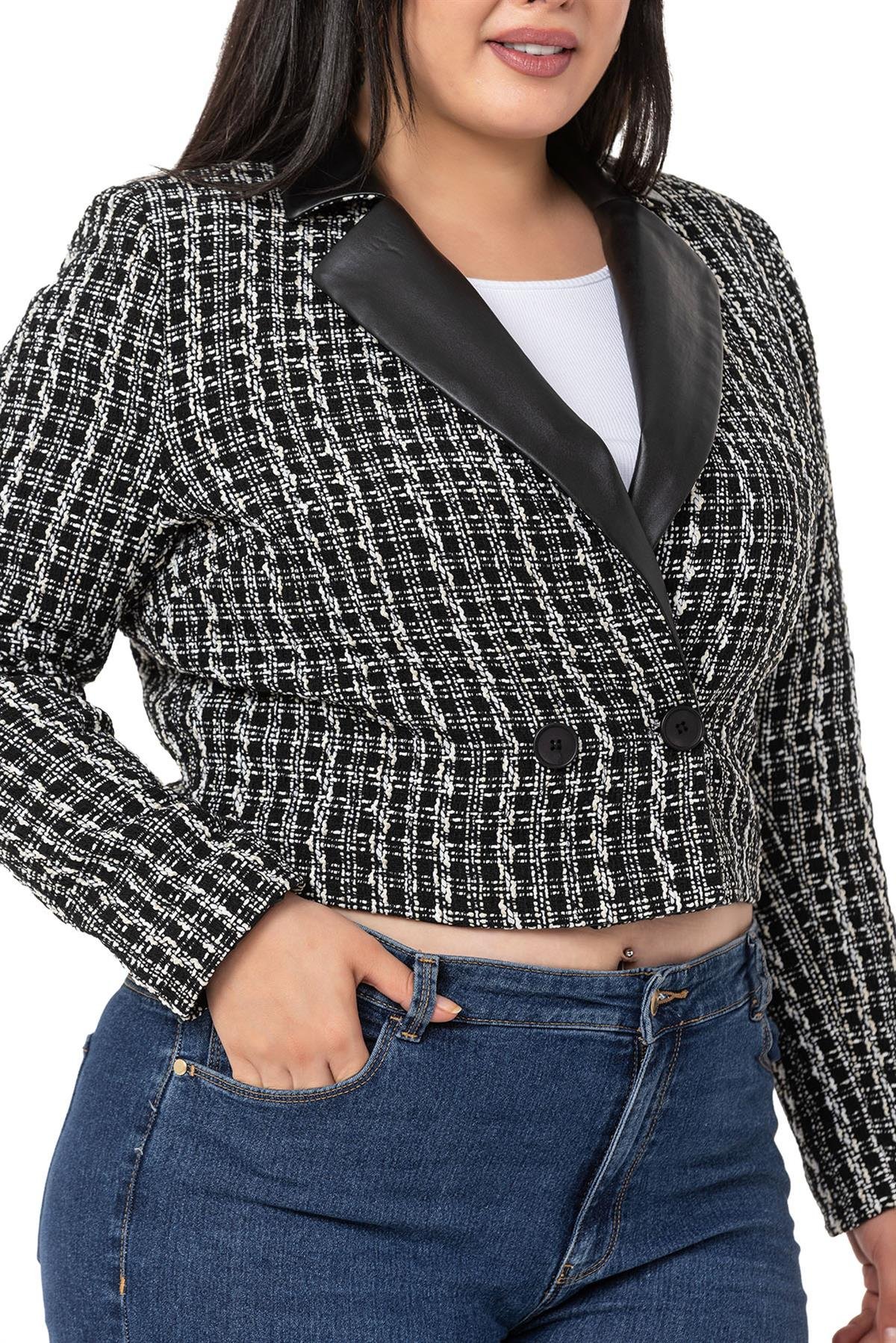 Plus size, double-breasted, faux leather-lined short channel jacket.