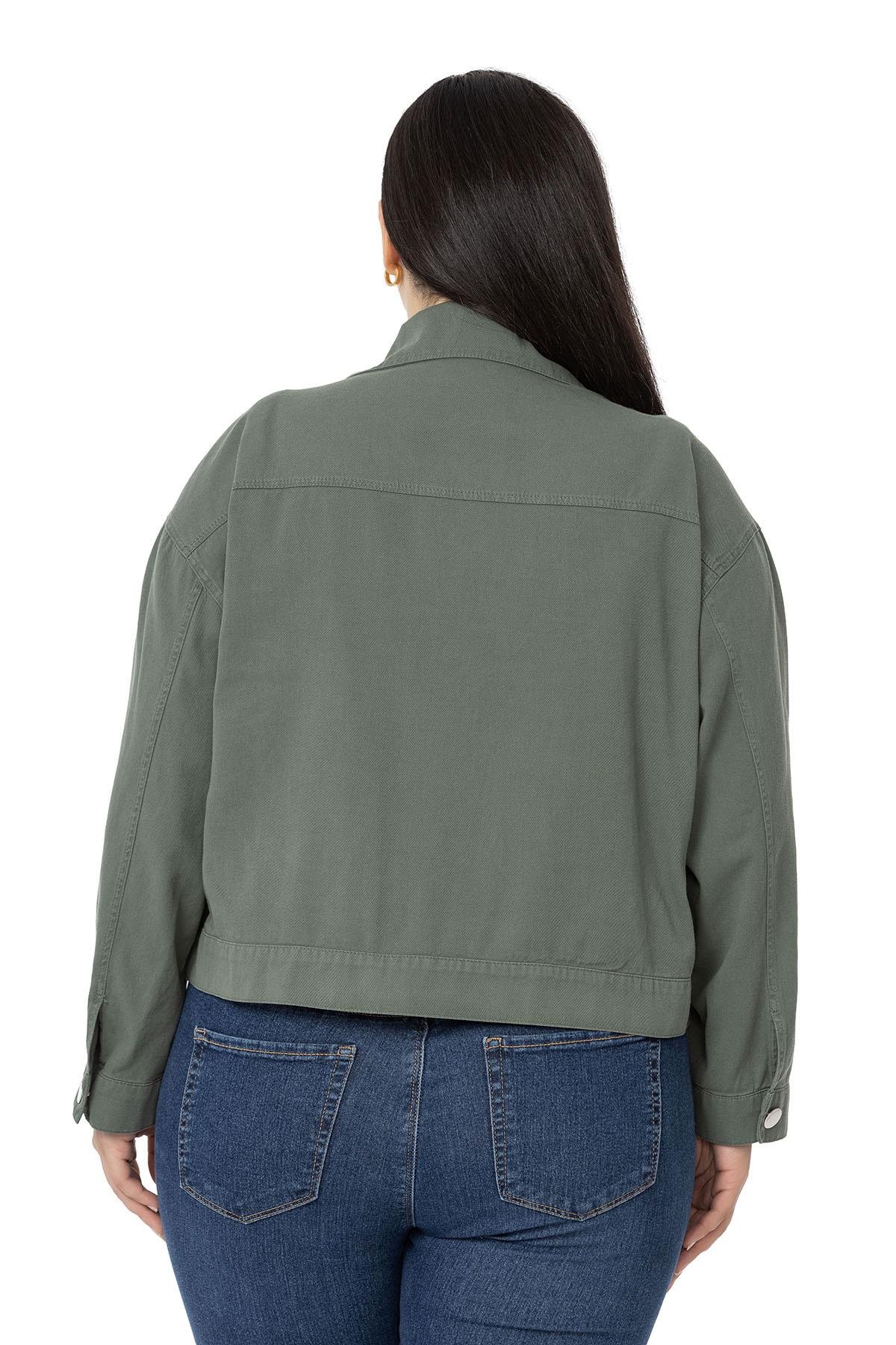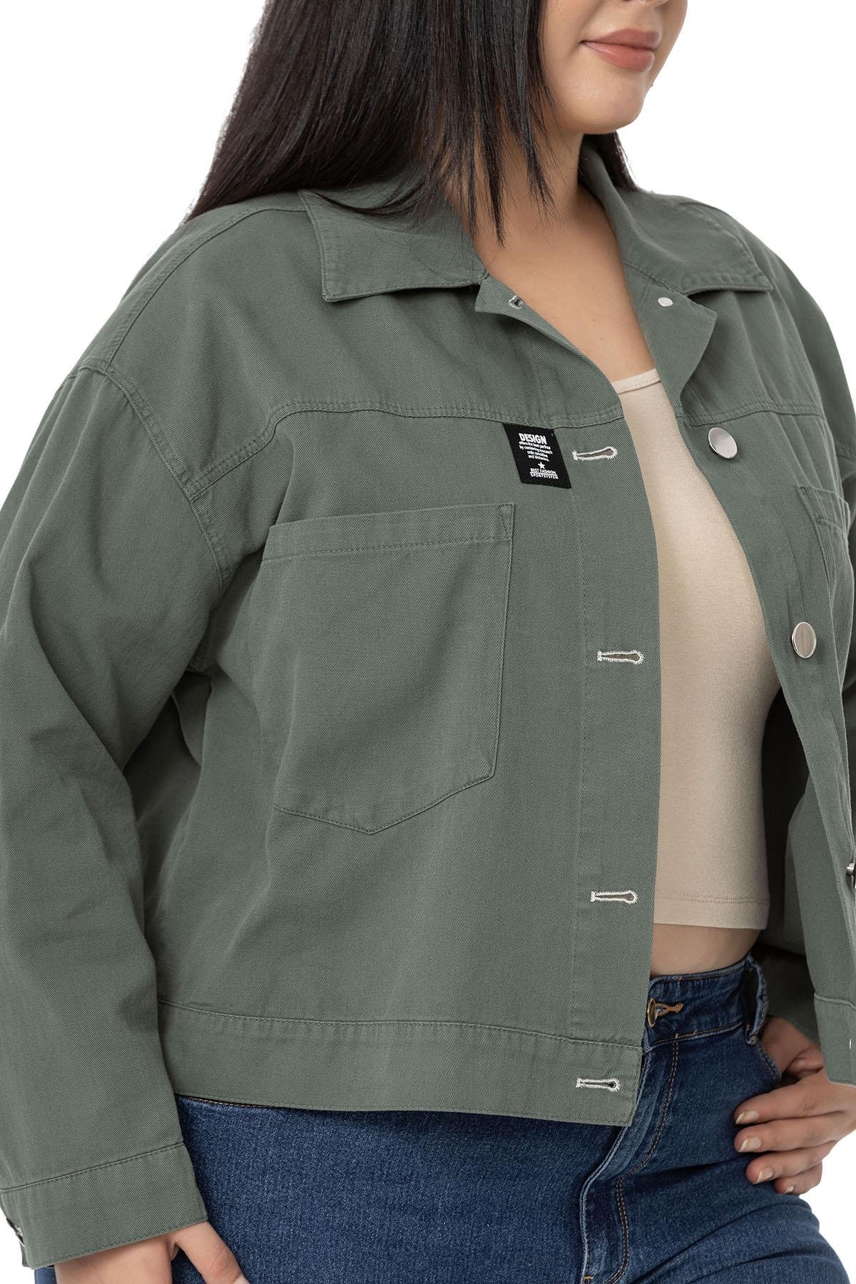 Plus size gabardine relaxed fit short jacket with bag pockets.