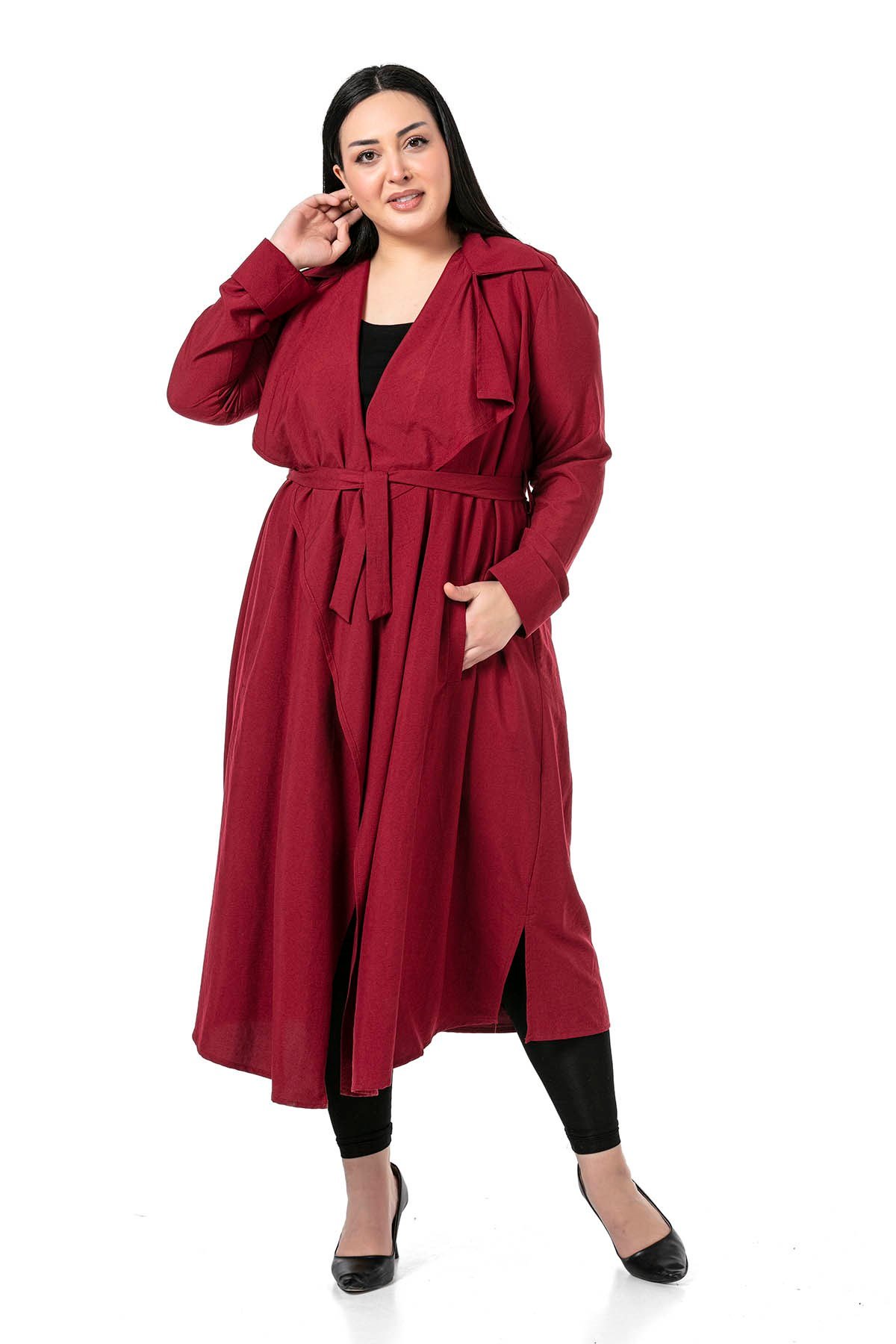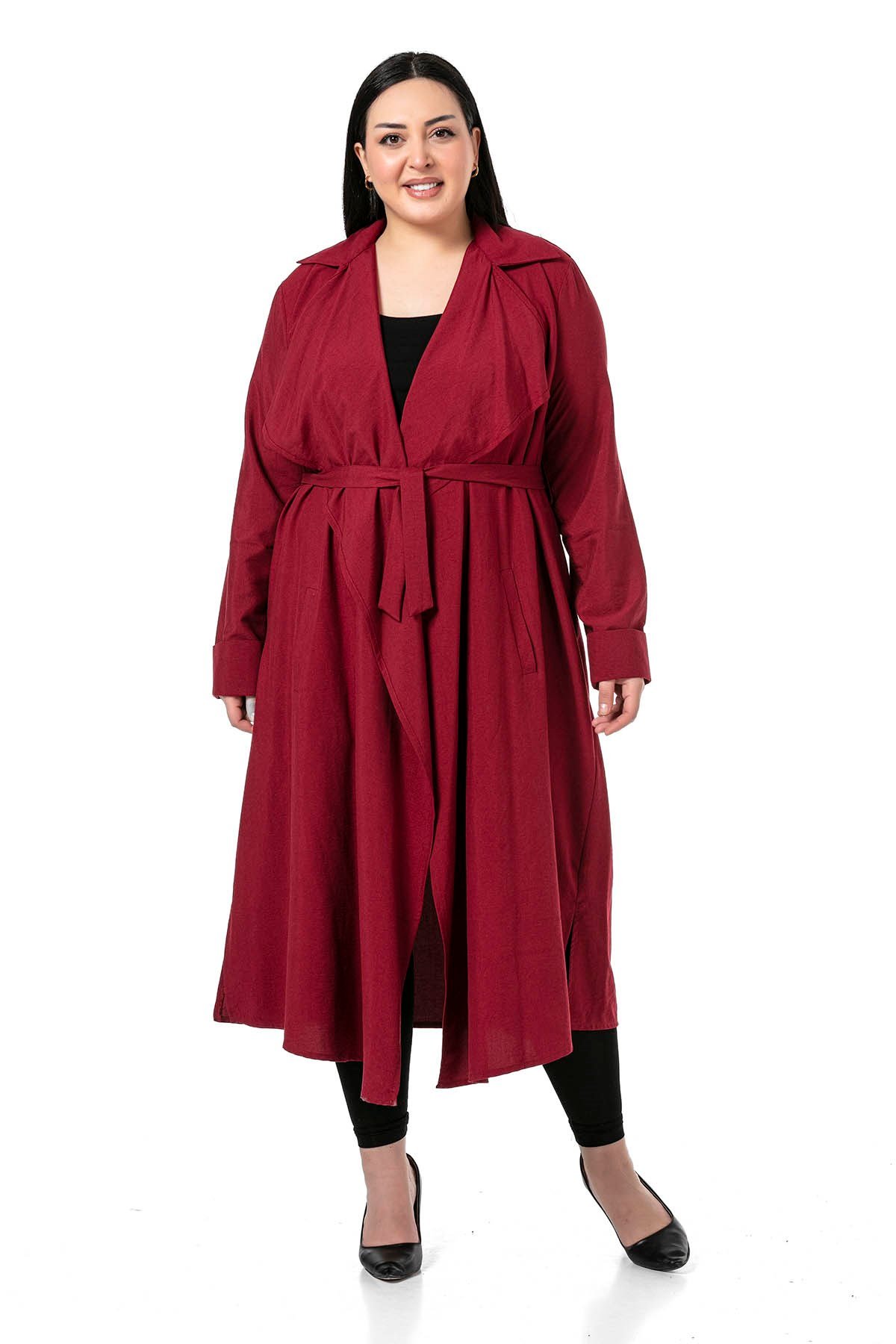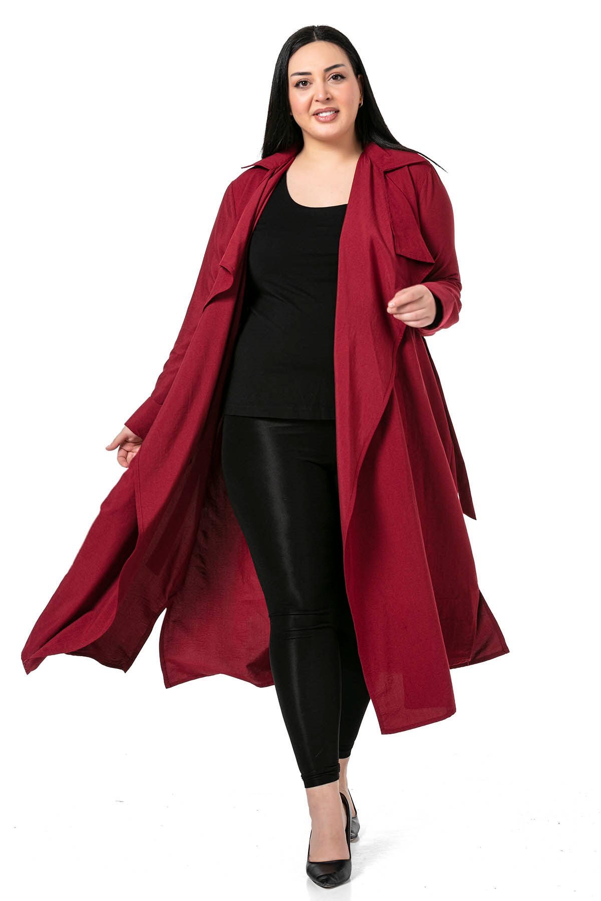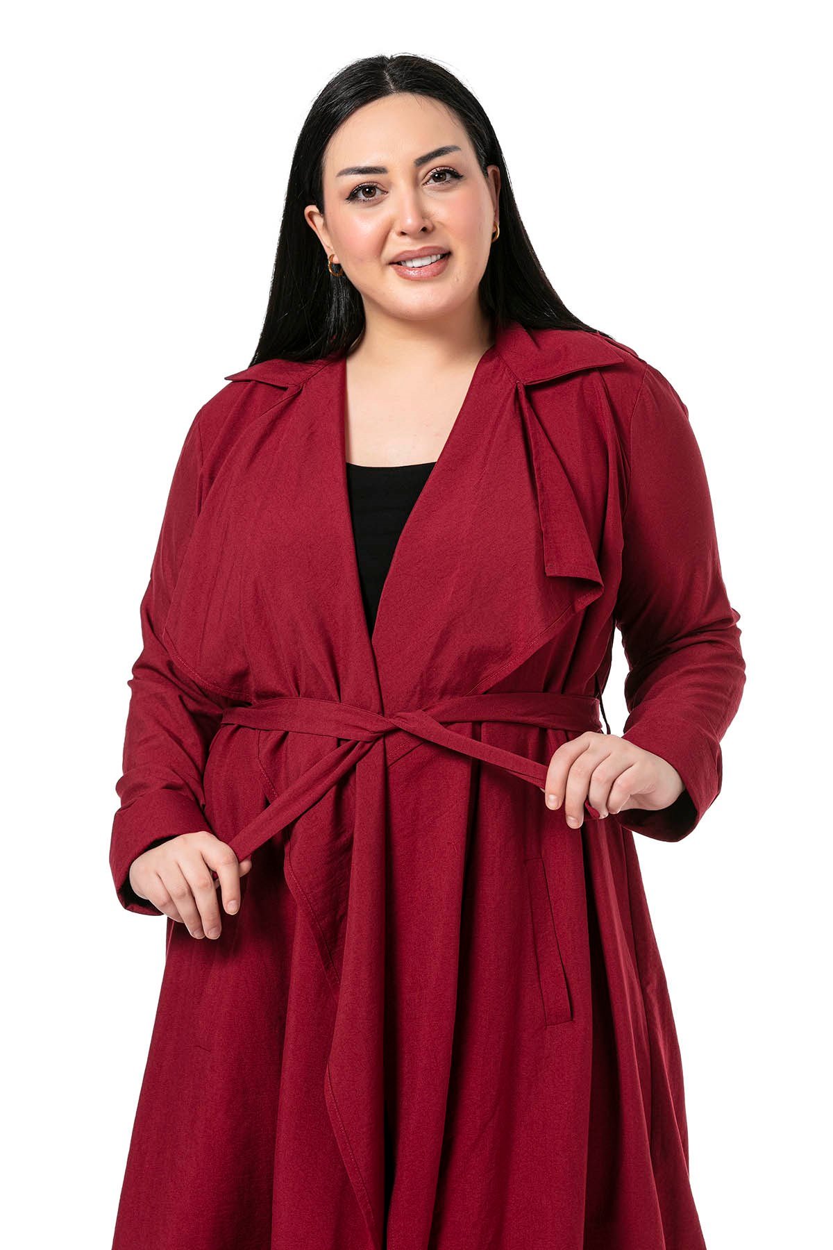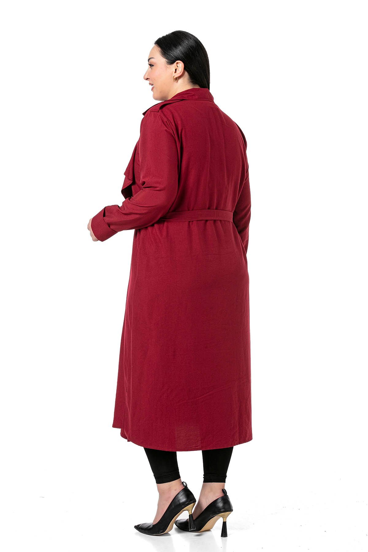 Plus Size Epaulettes Side Slits and Belted Long Burgundy Jacket