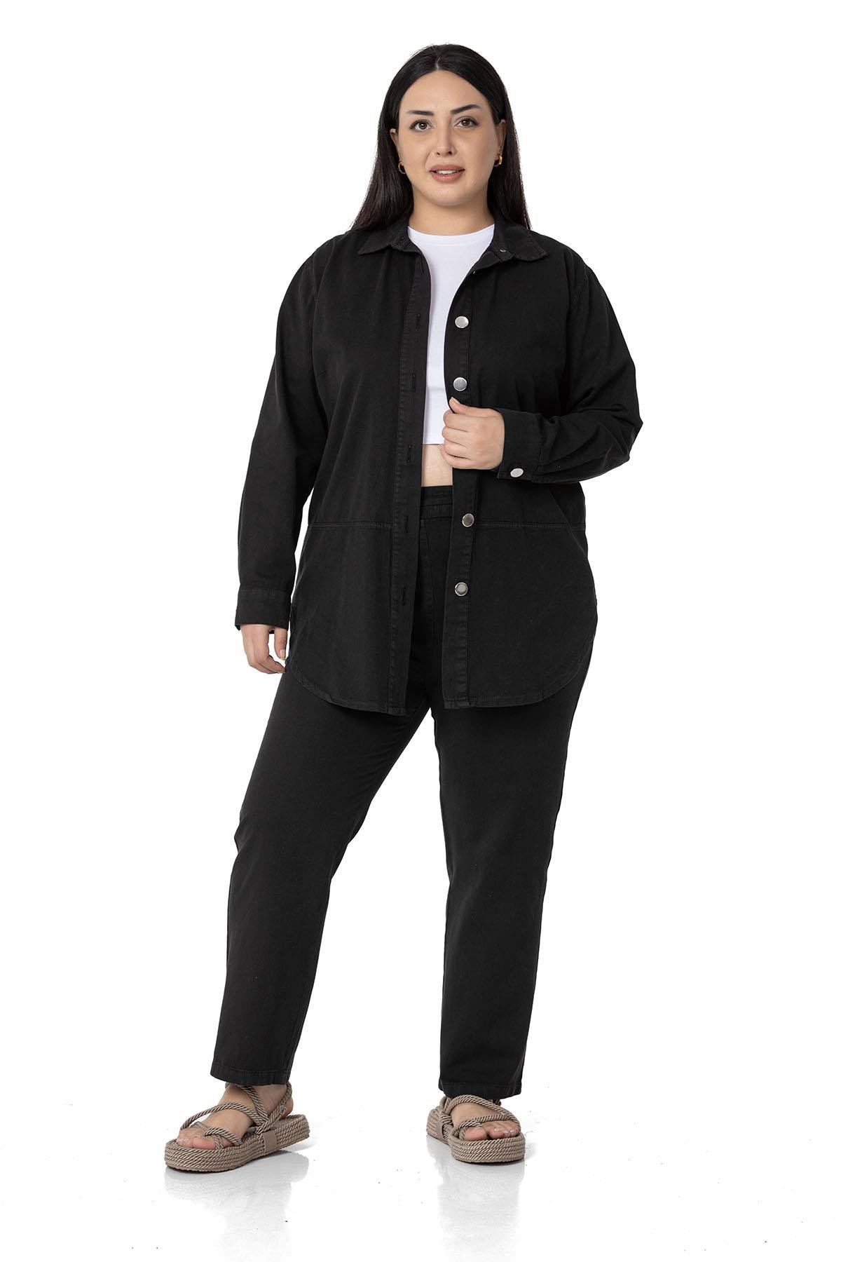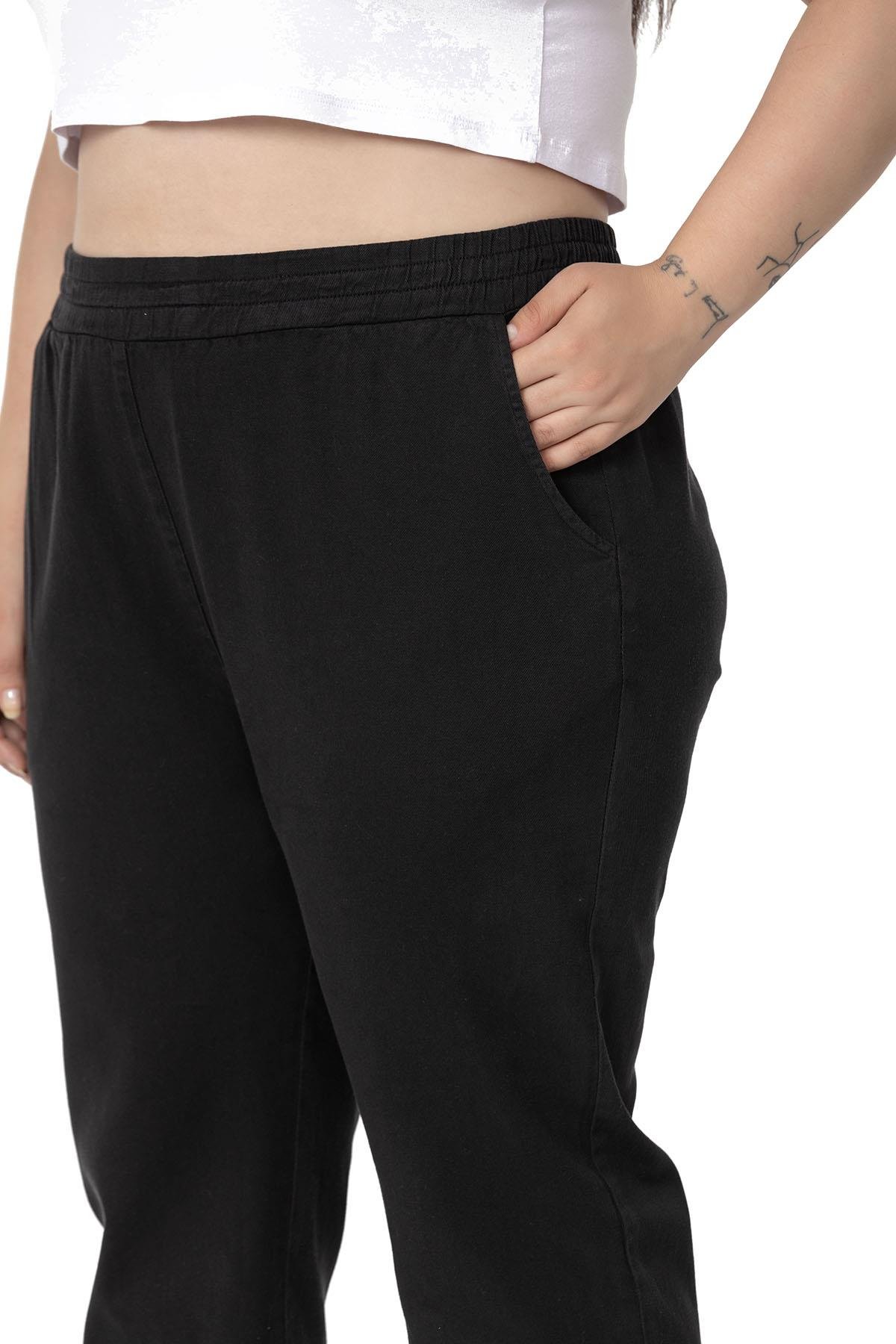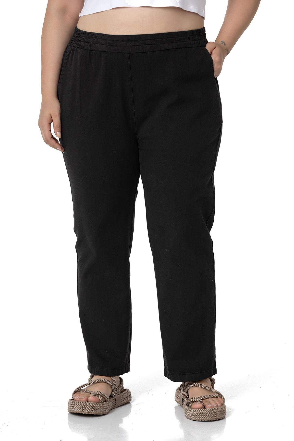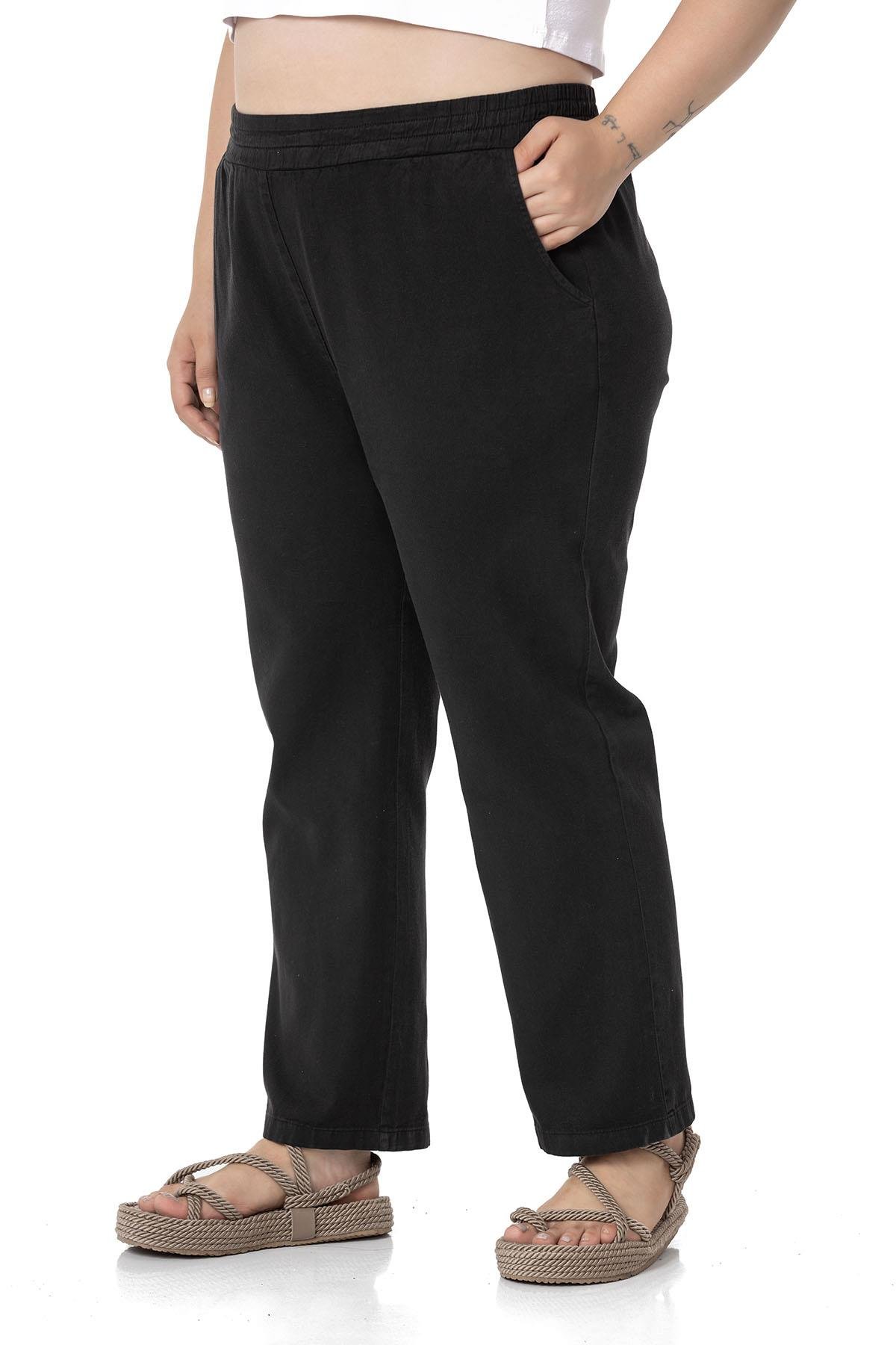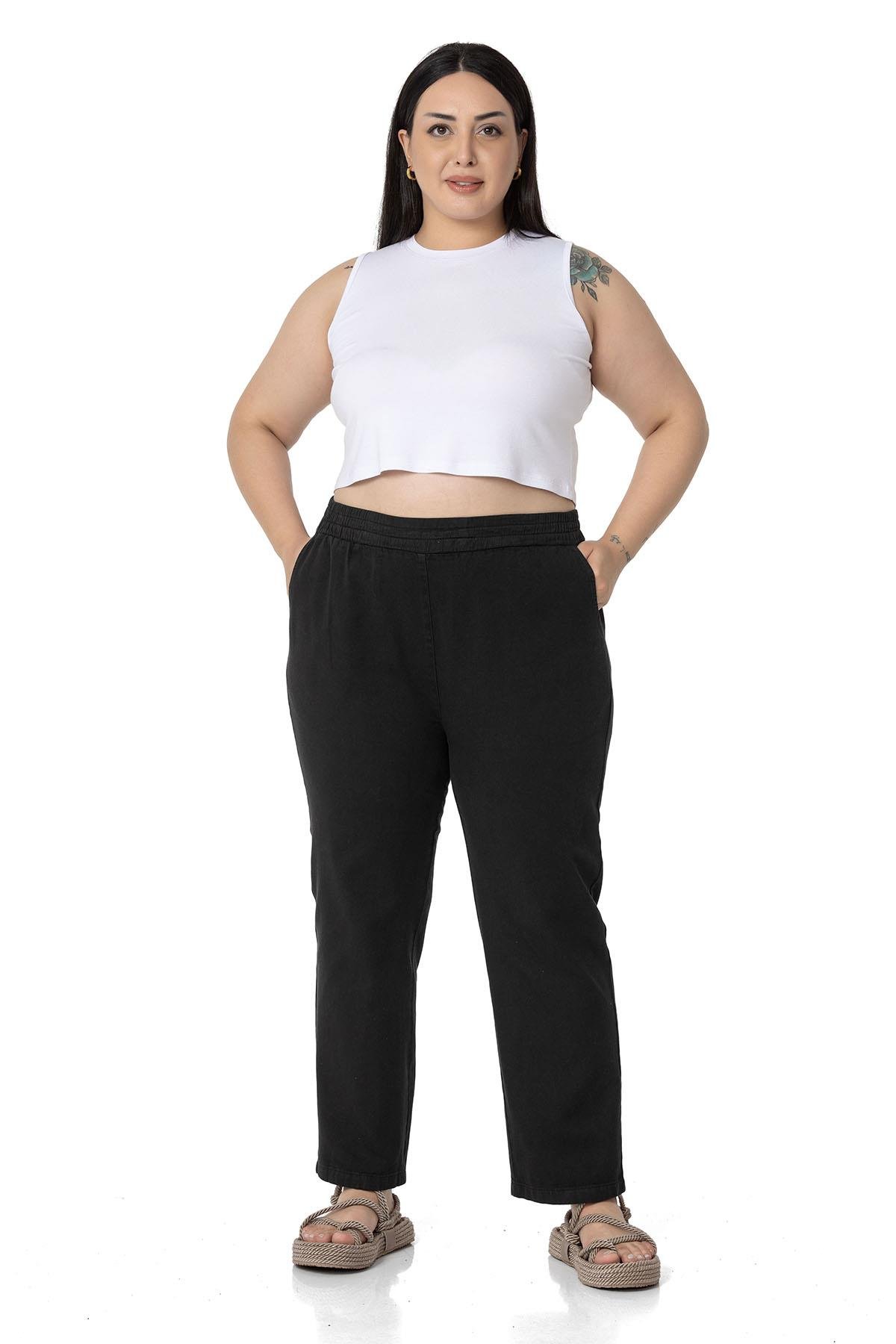 Plus Size Gabardine Black Trousers with Elastic Waist Pockets