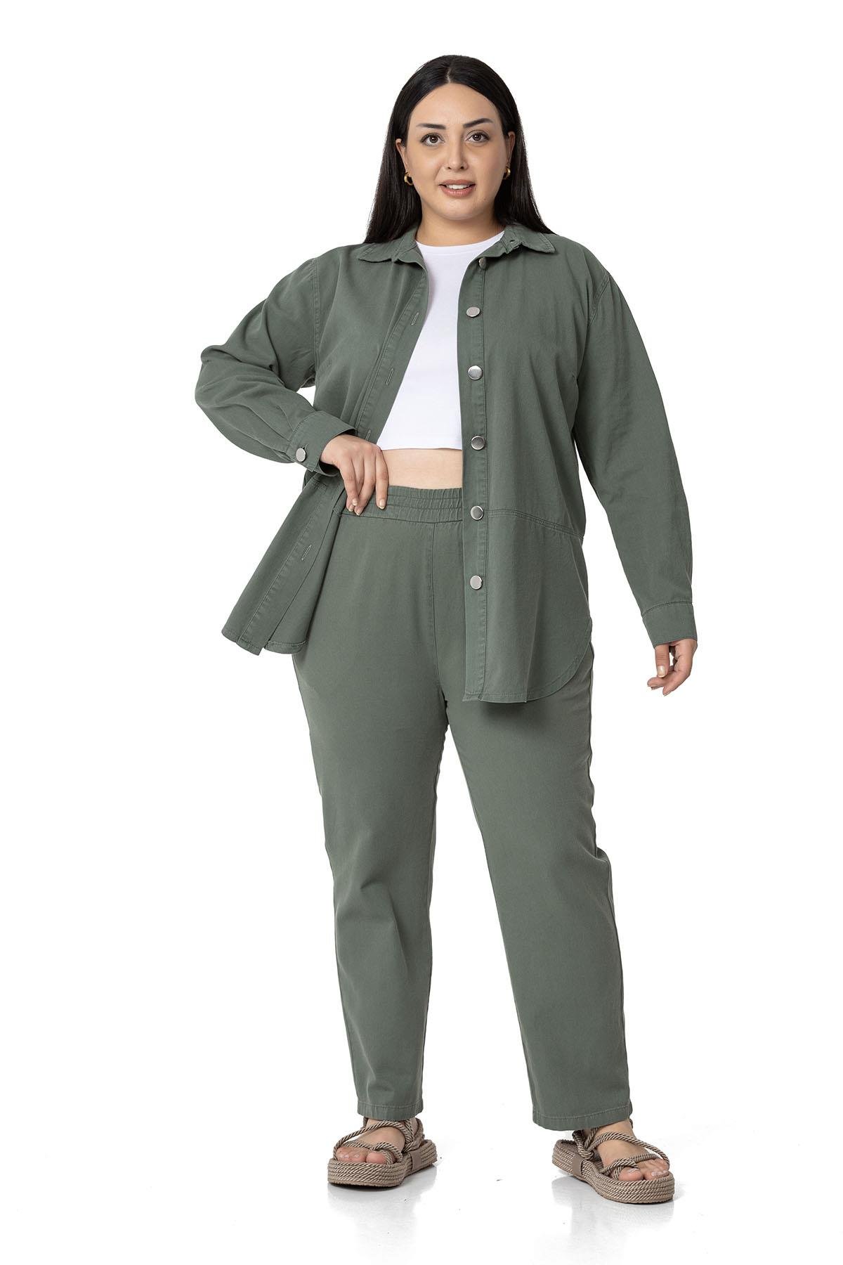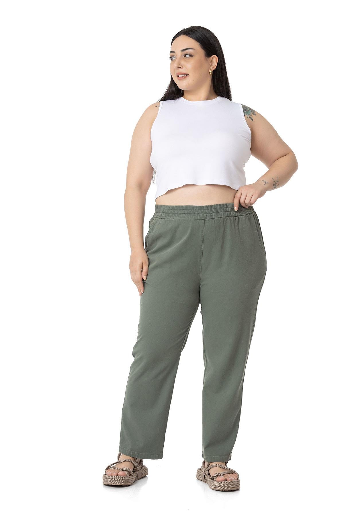 Large size gabardine tube leg trousers with elasticated waist and side pockets.