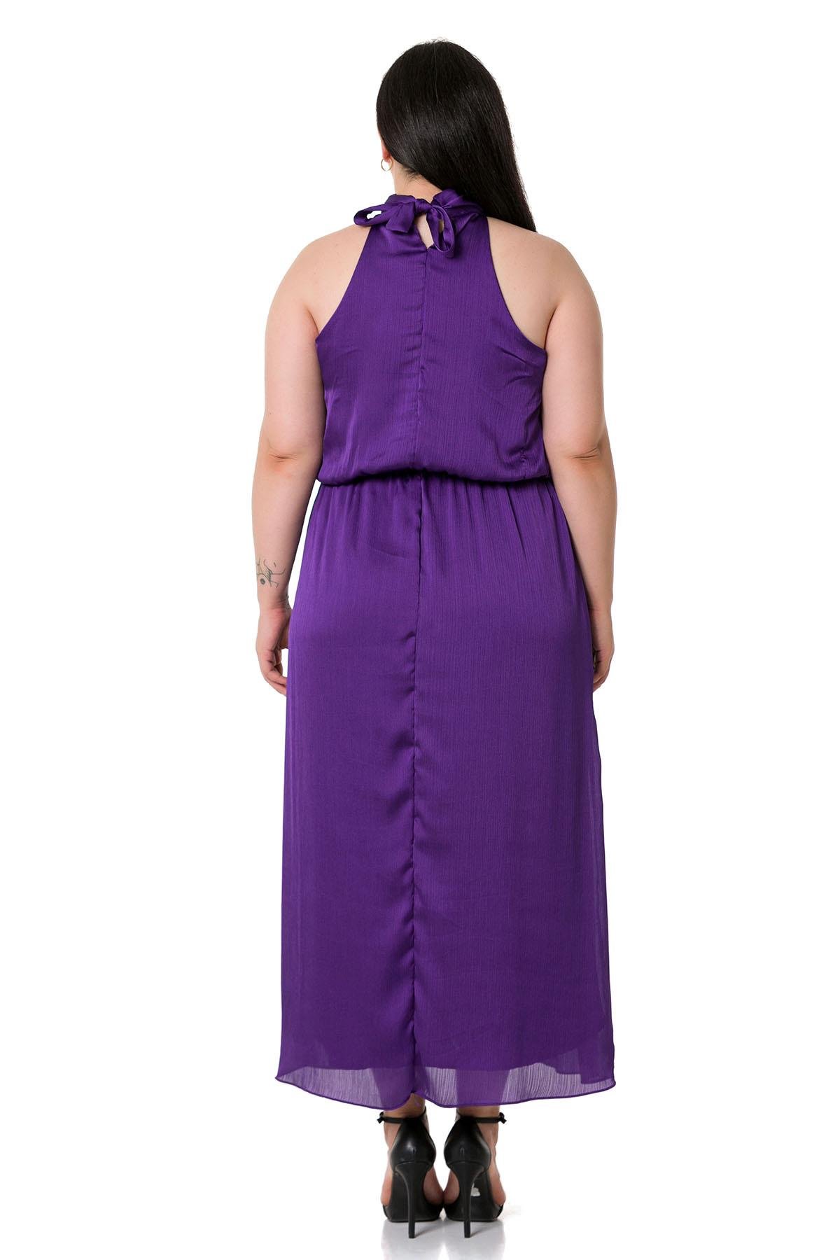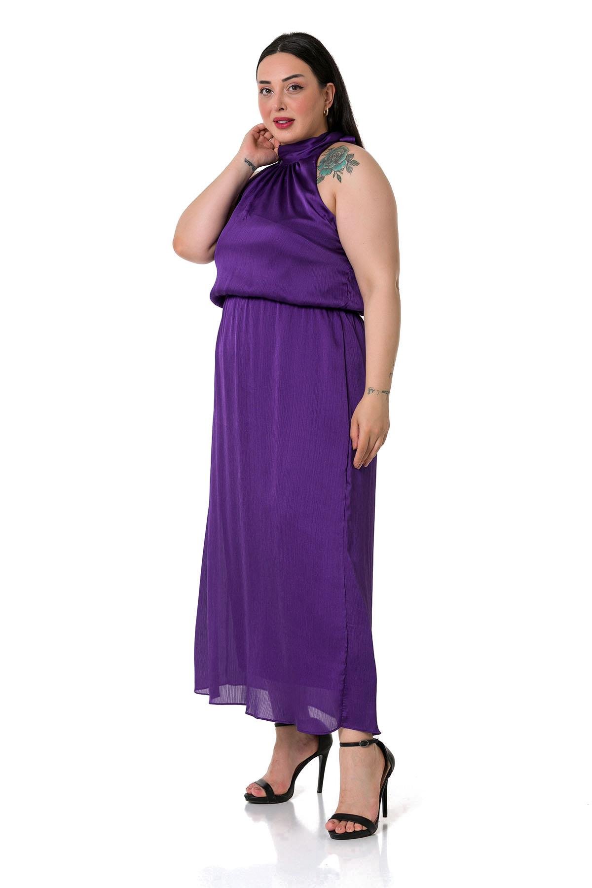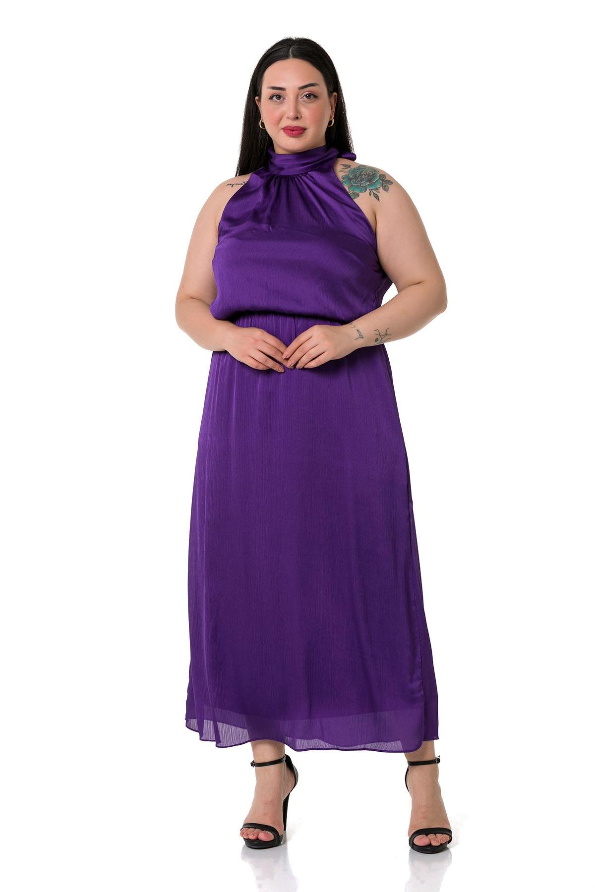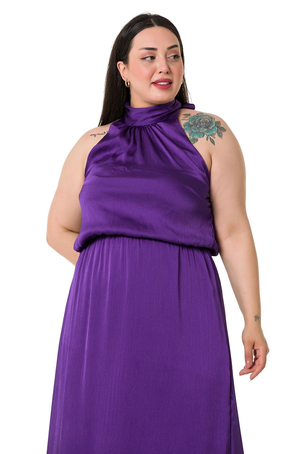 Plus Size Halter Neck Elastic Waist Satin Long Purple Dress