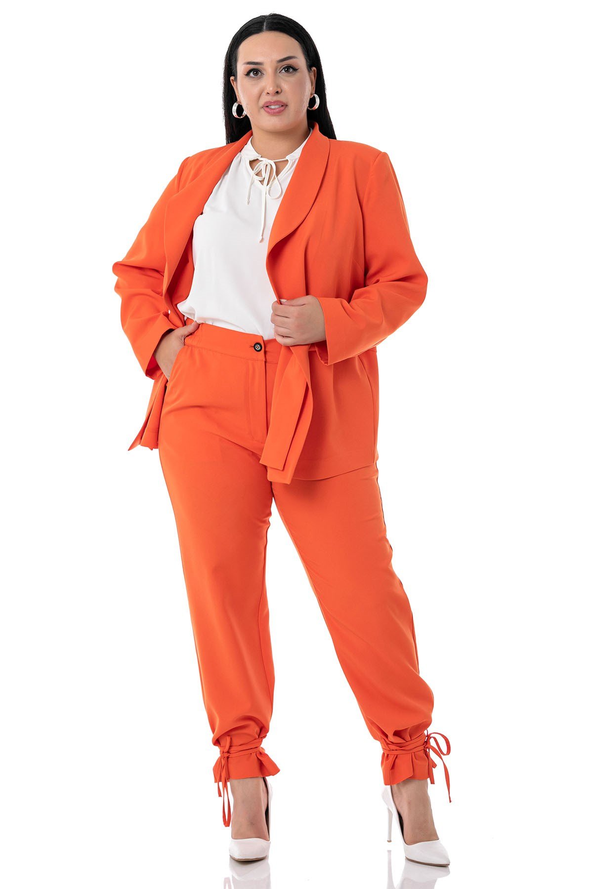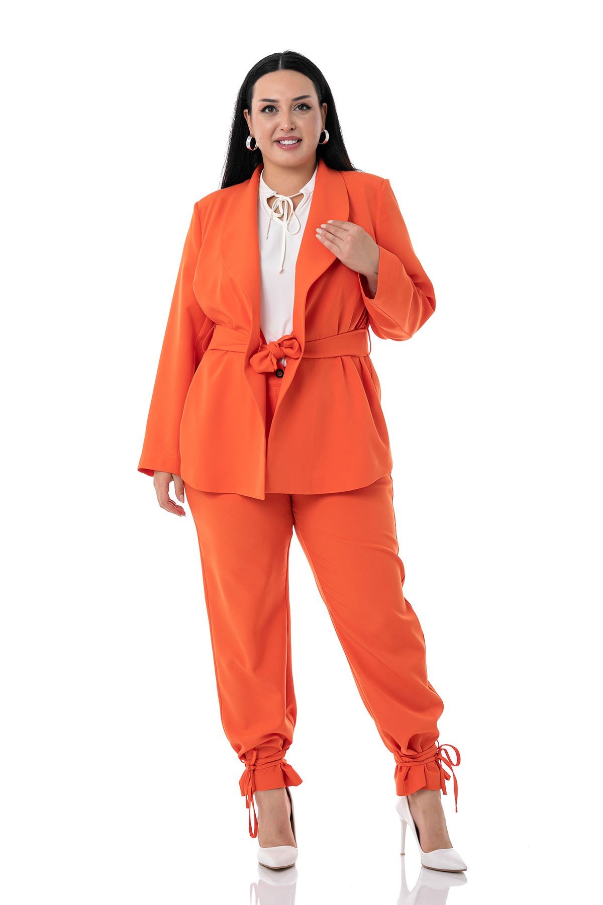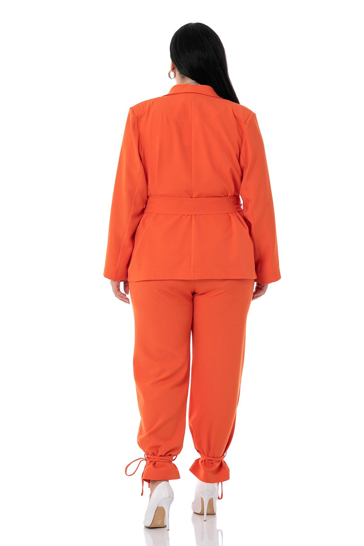Plus Size Jacket Trousers Orange Suit with Tie Detail
