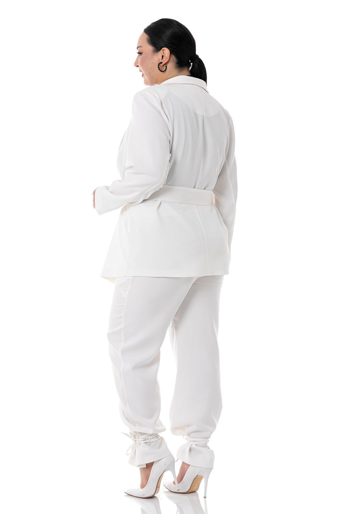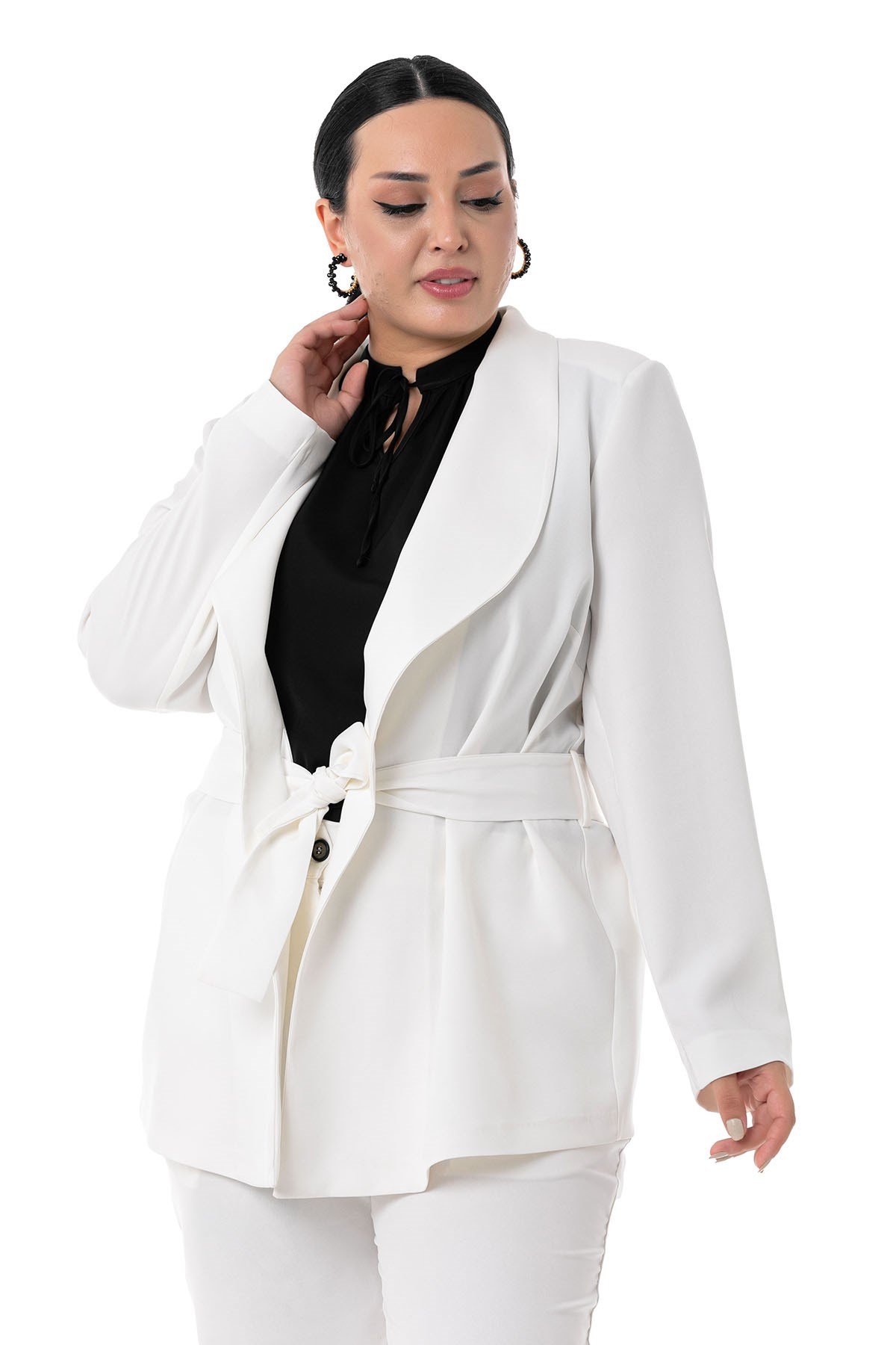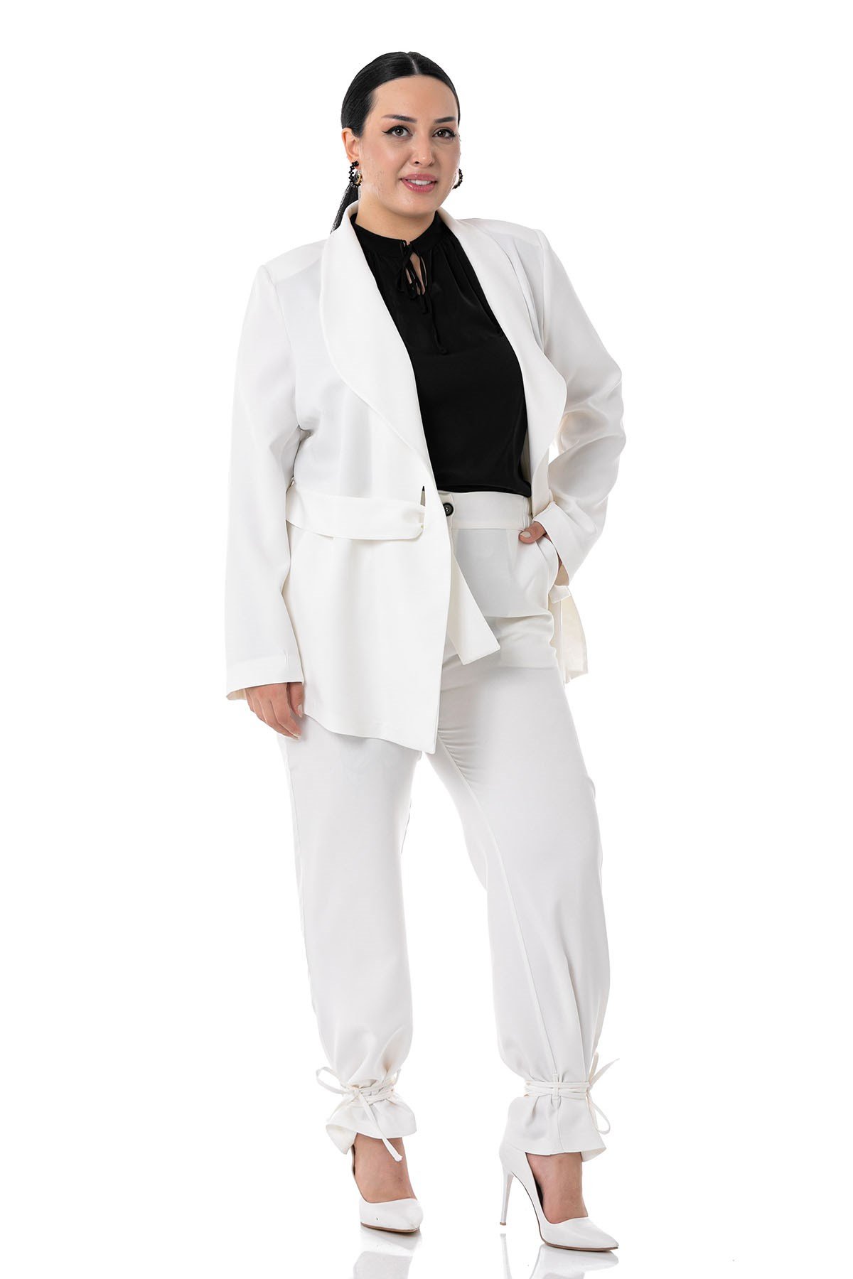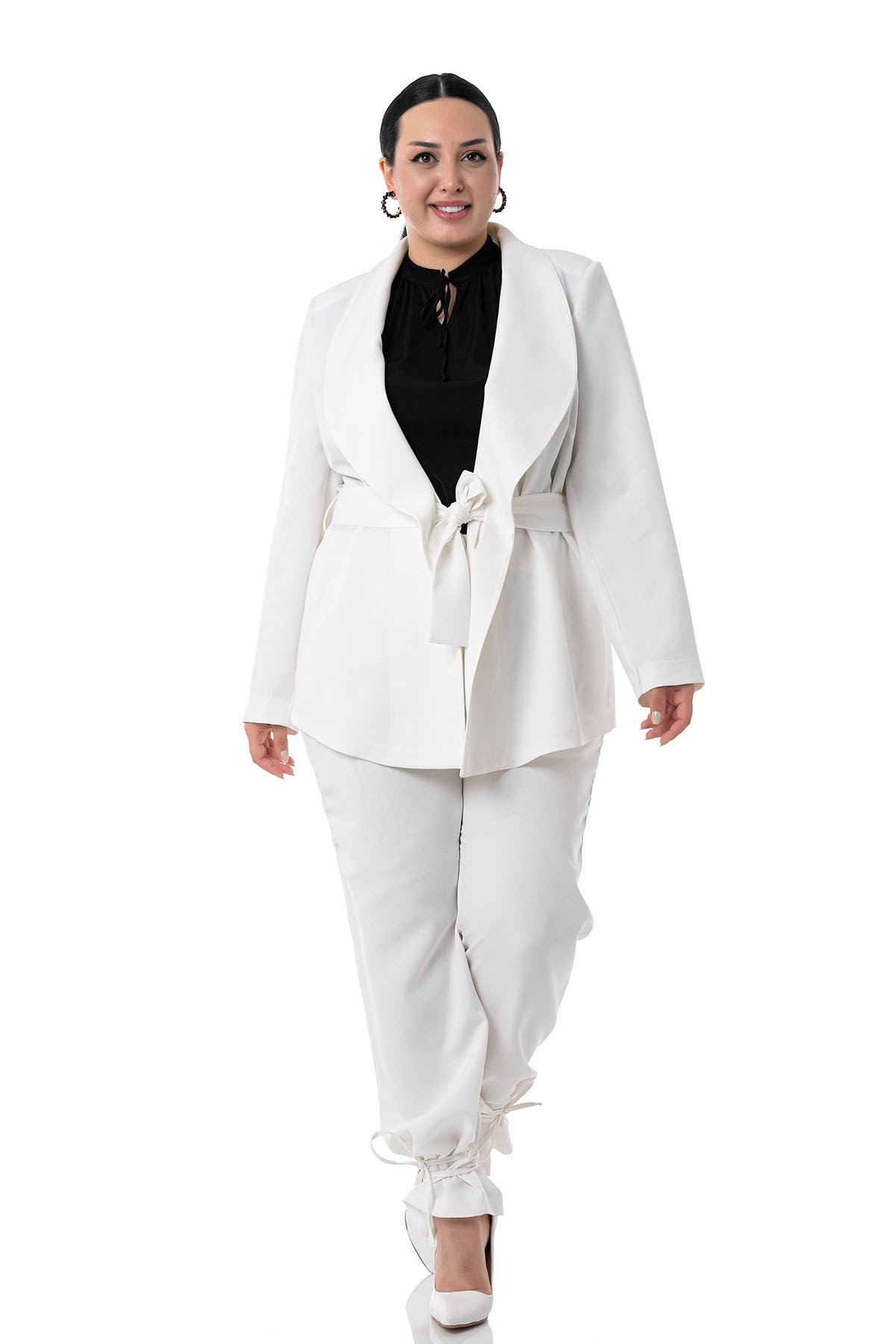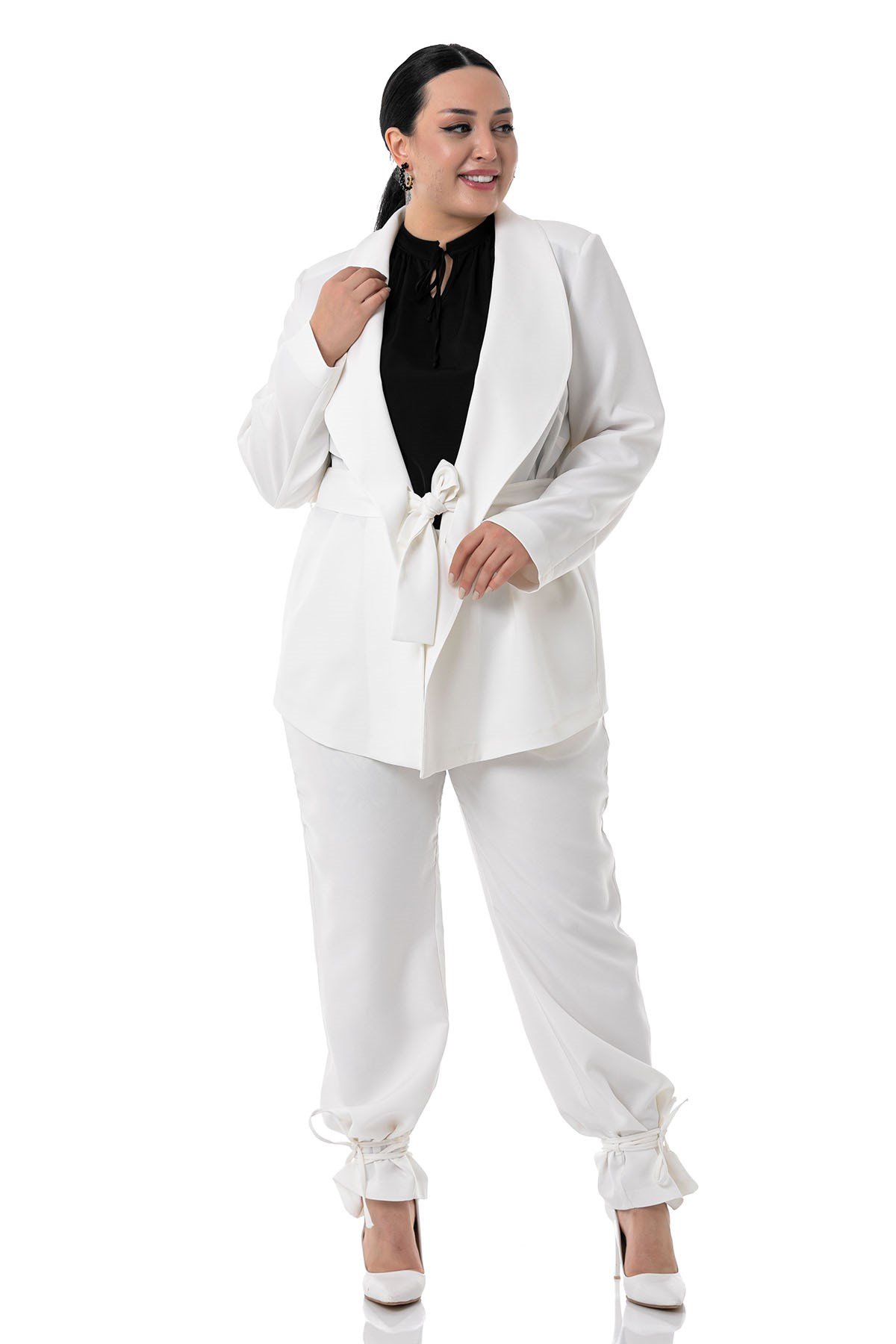 Plus Size Jacket Trousers White Suit with Tie Detail