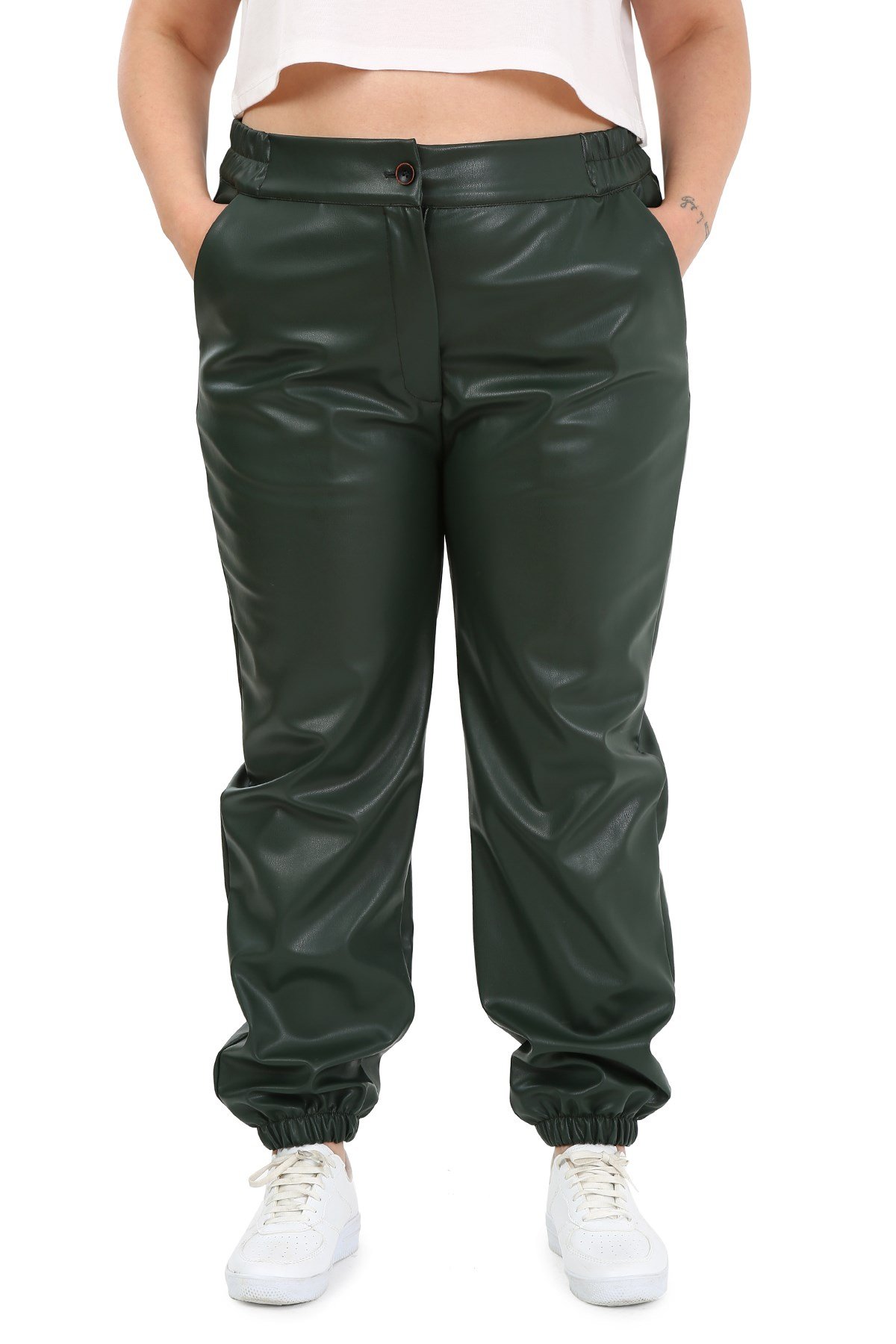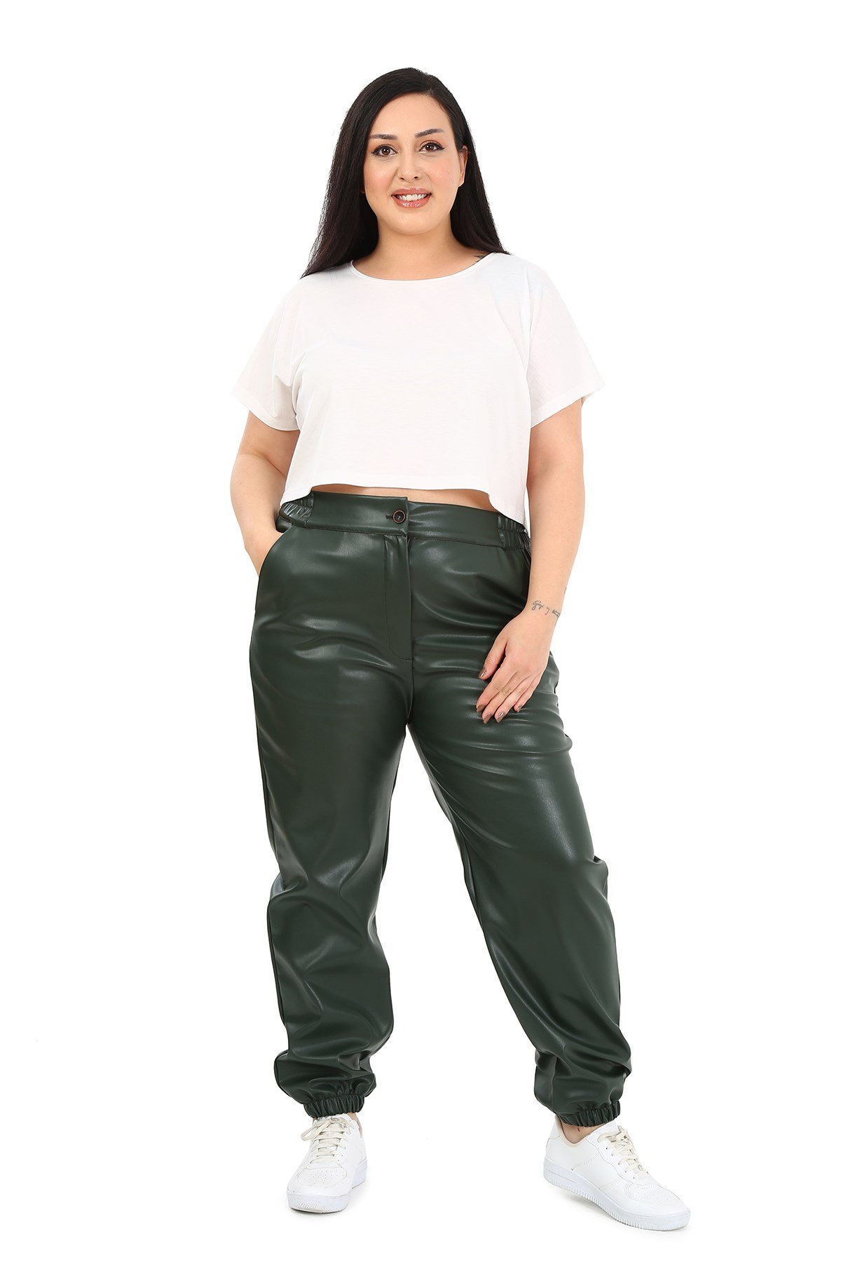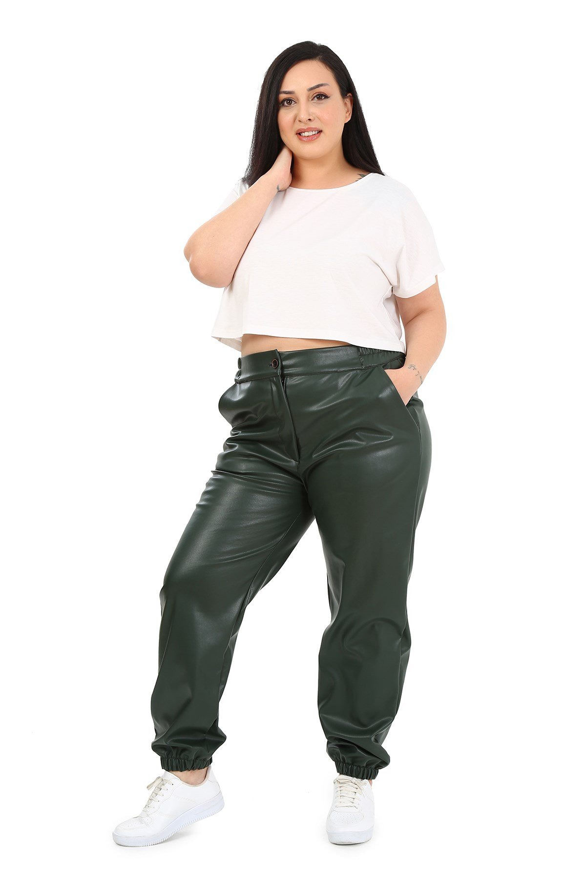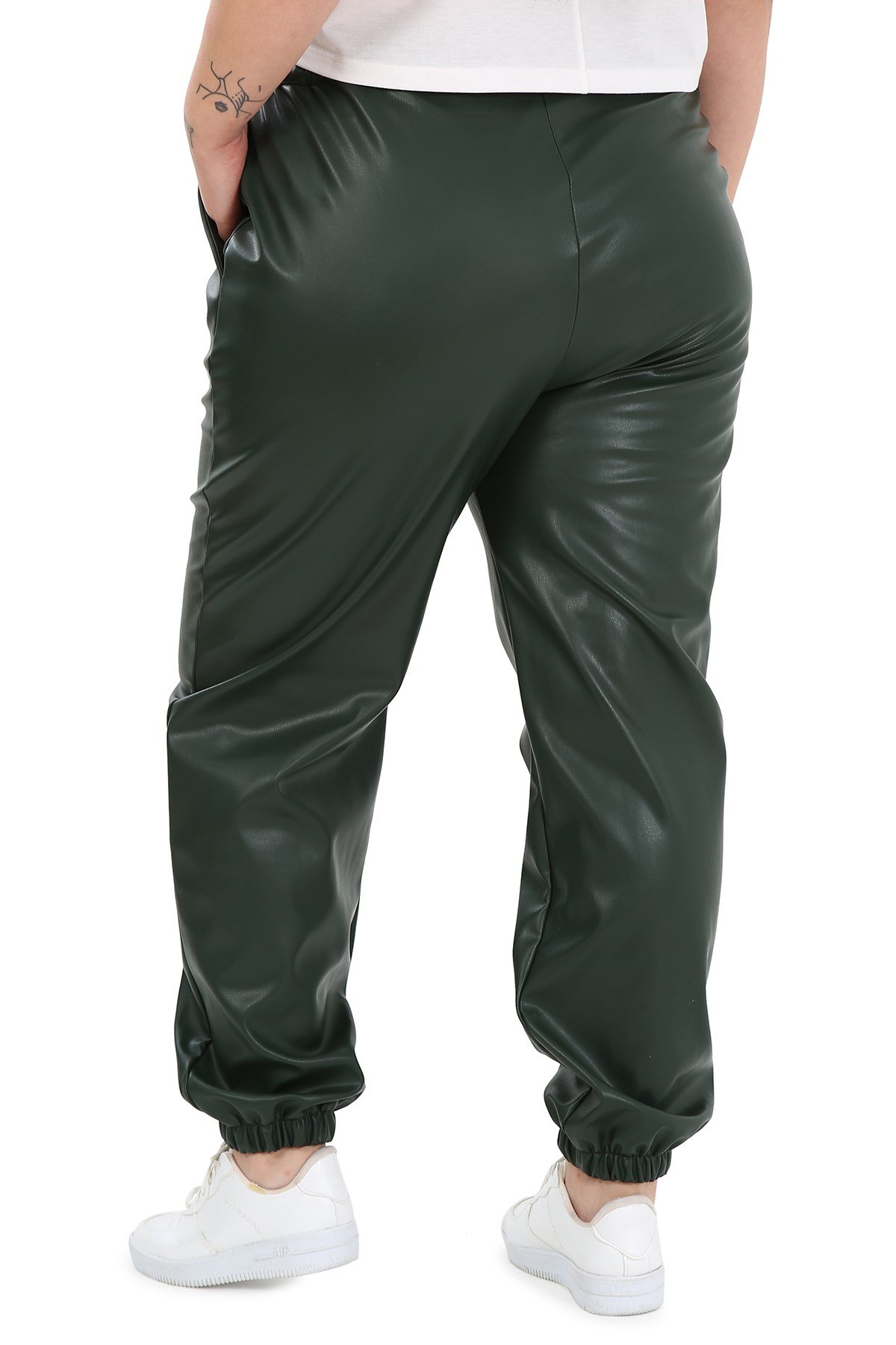 Large size faux leather trousers with elasticated side pockets at the waist and elasticated hems.