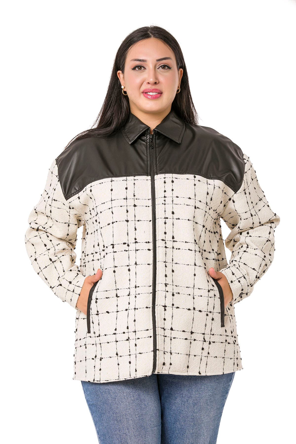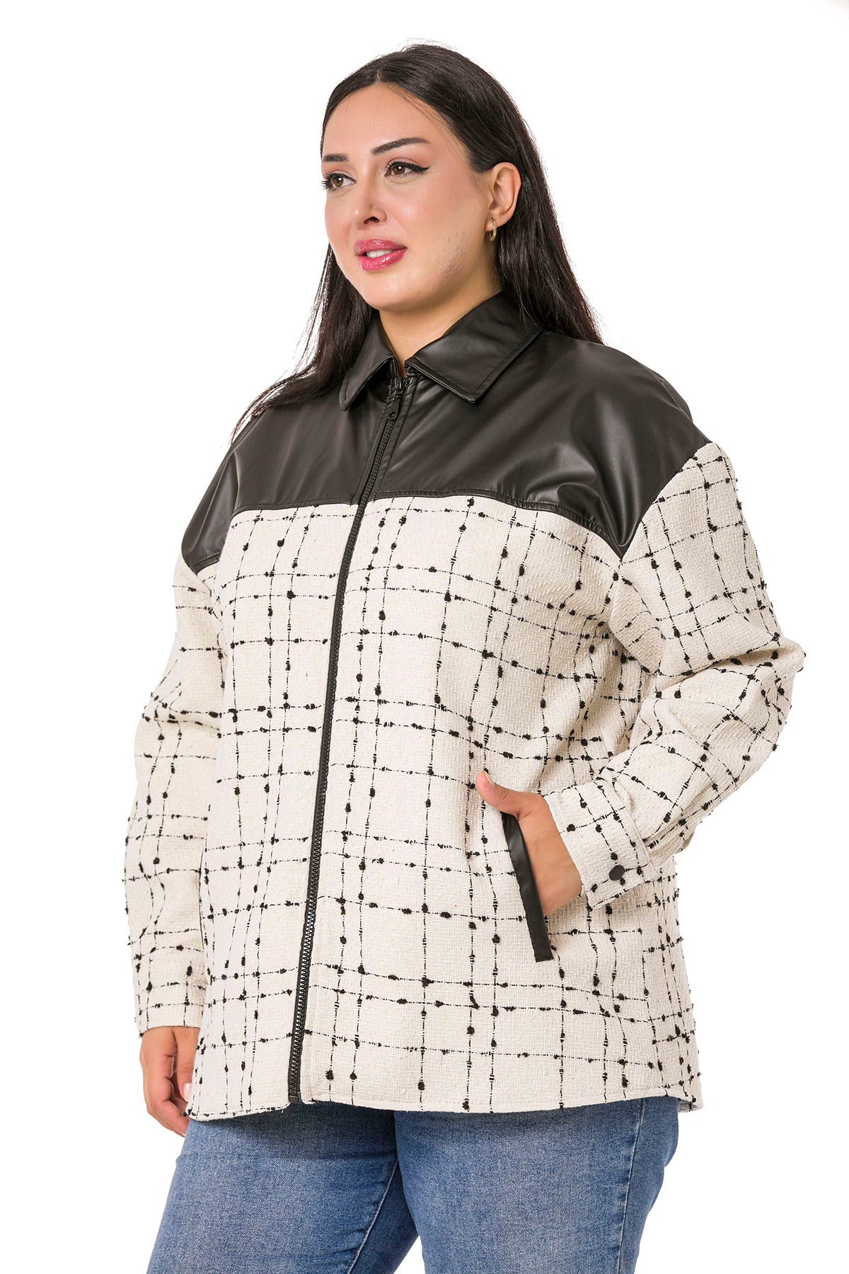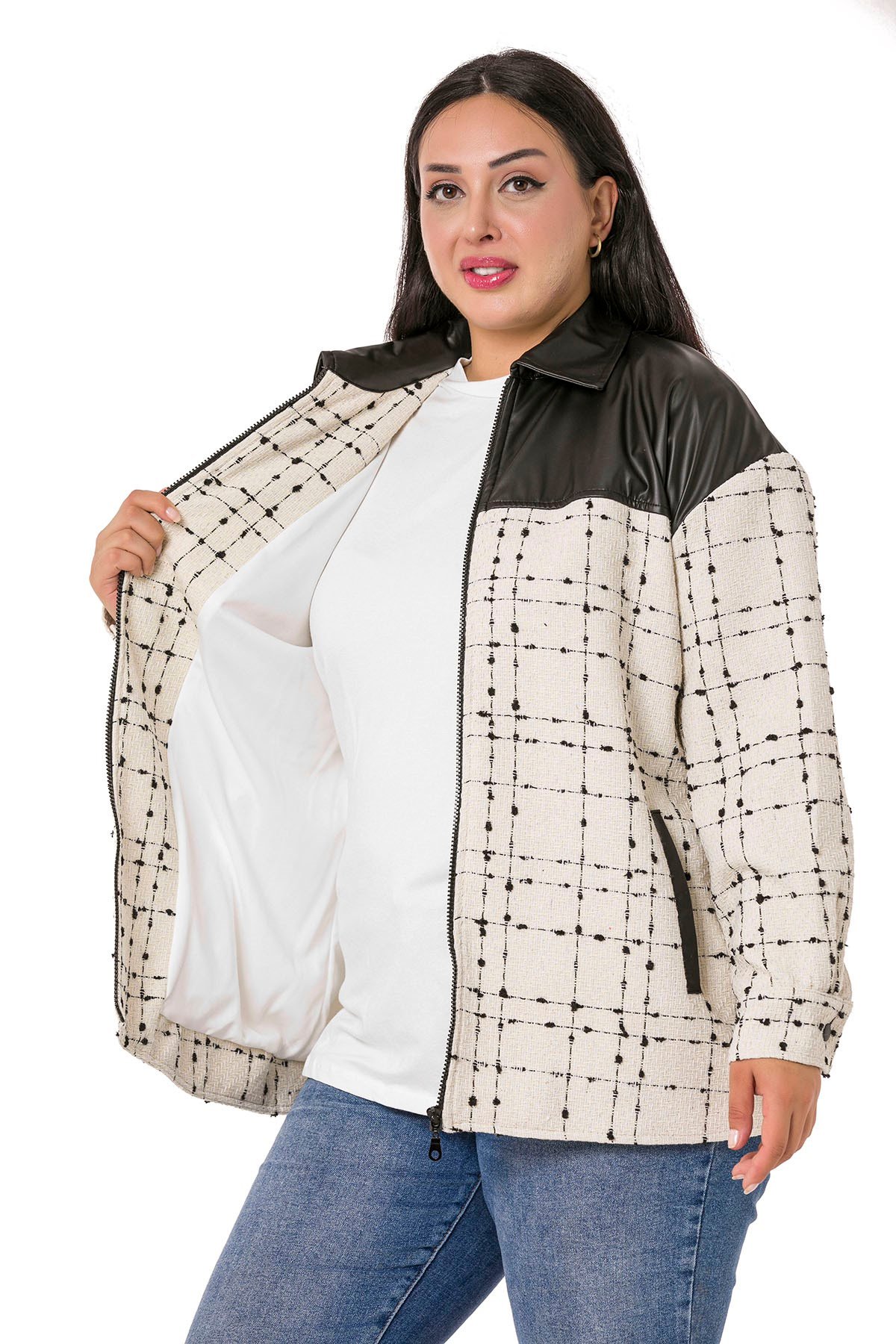 Plus size shirt collar leather trimmed tweed lined jacket with zippered pockets.