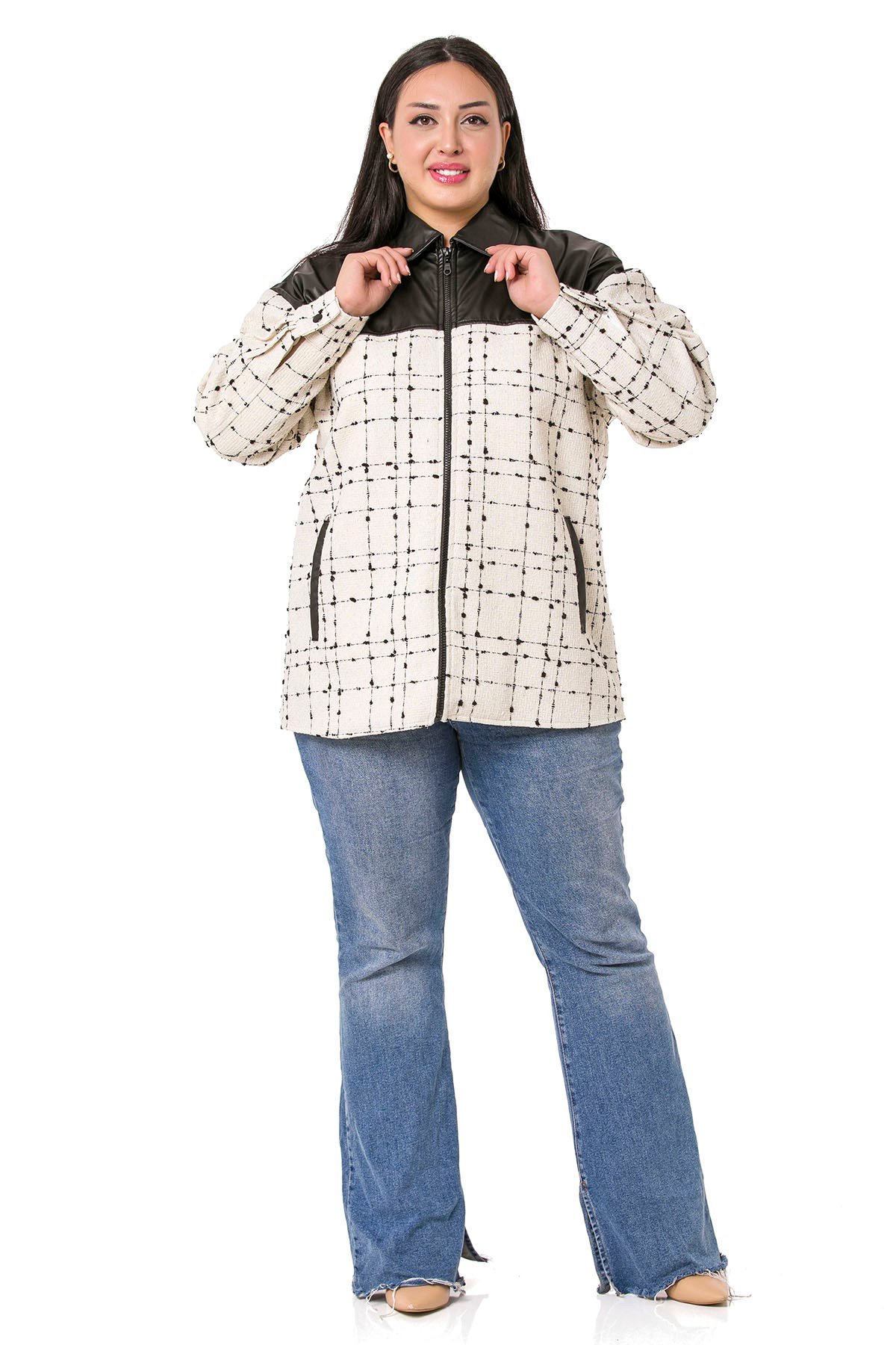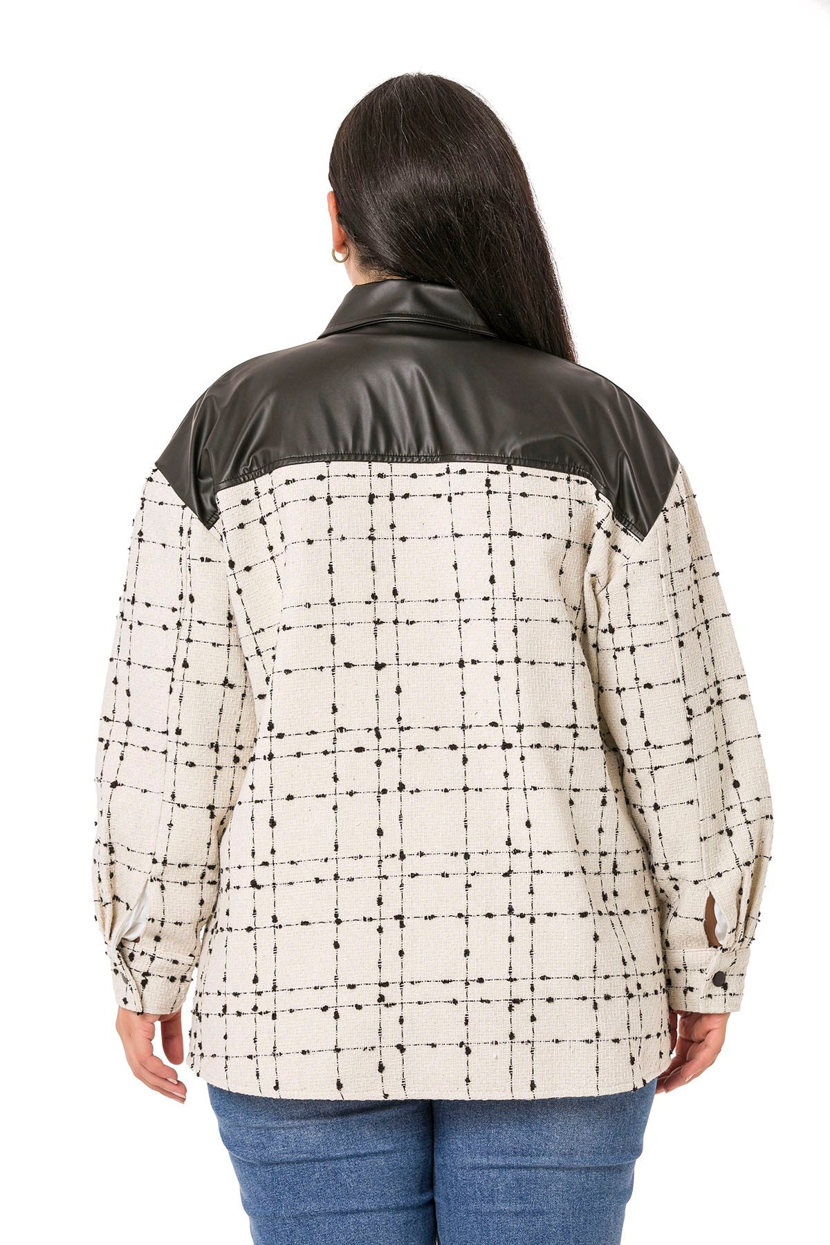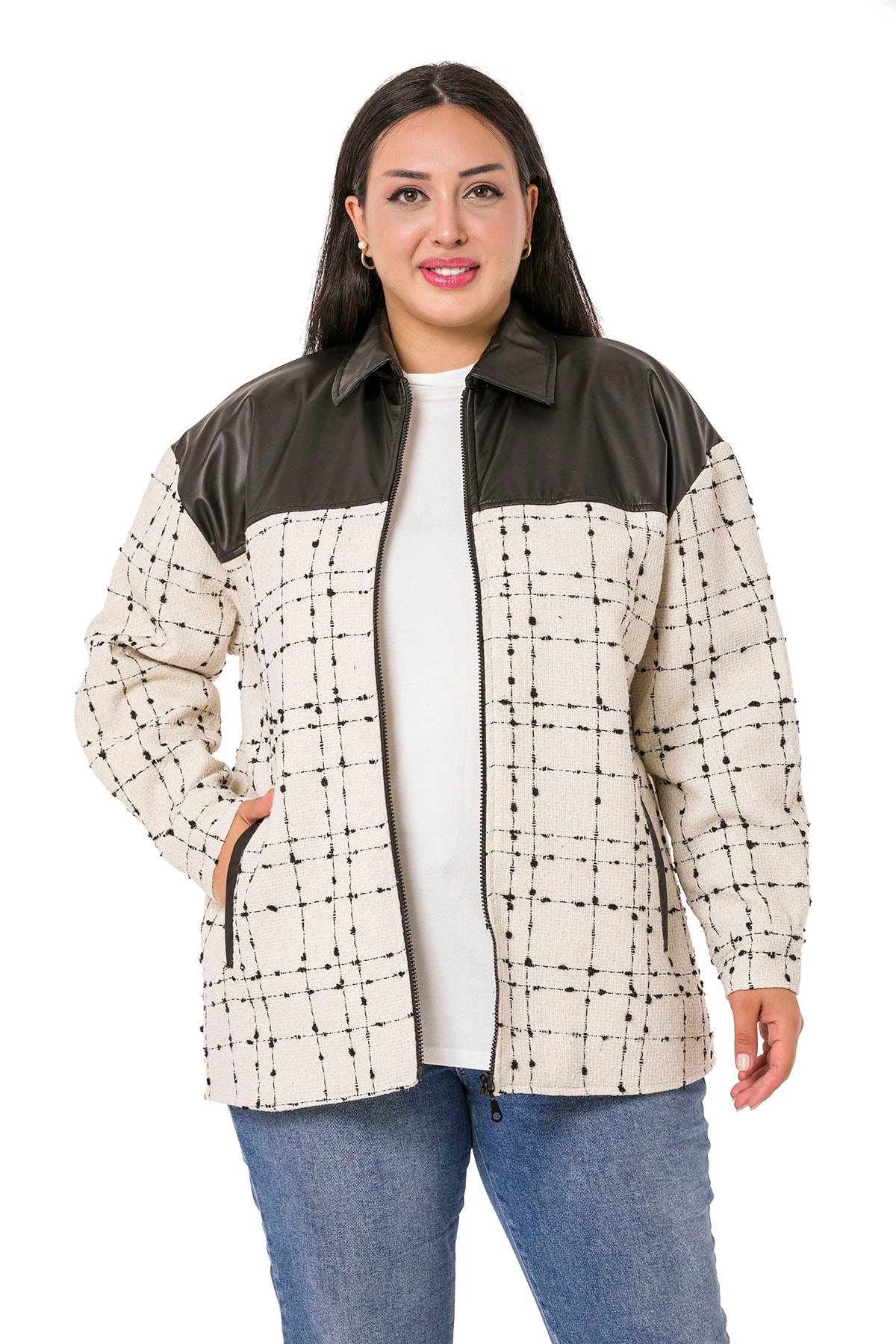 Plus size shirt collar leather trimmed tweed lined jacket with zippered pockets.