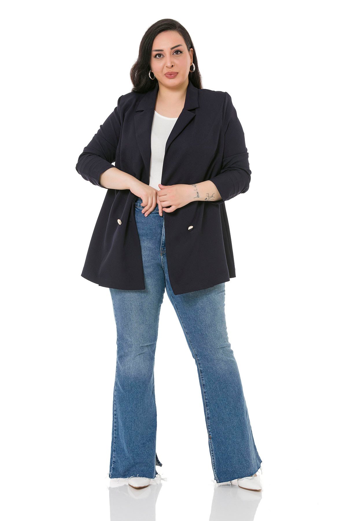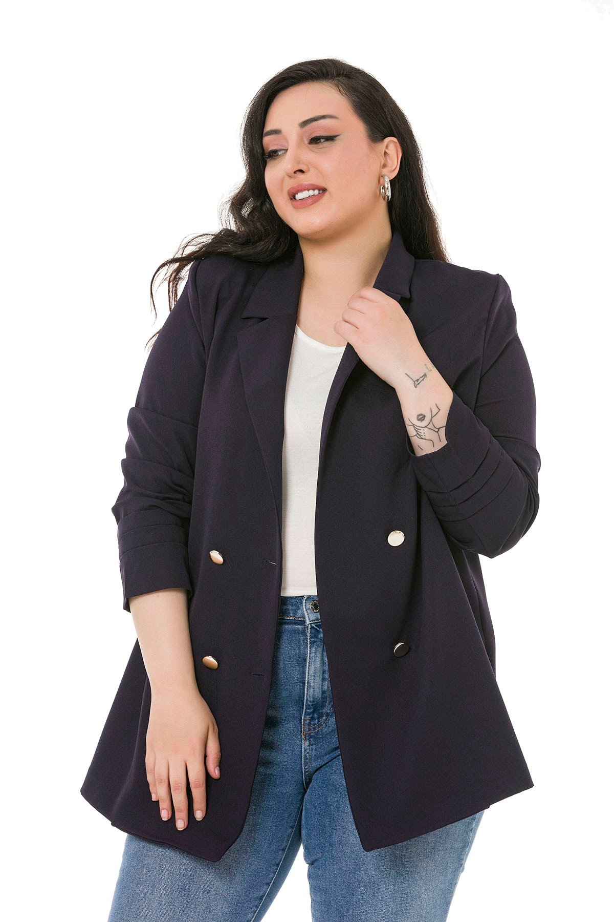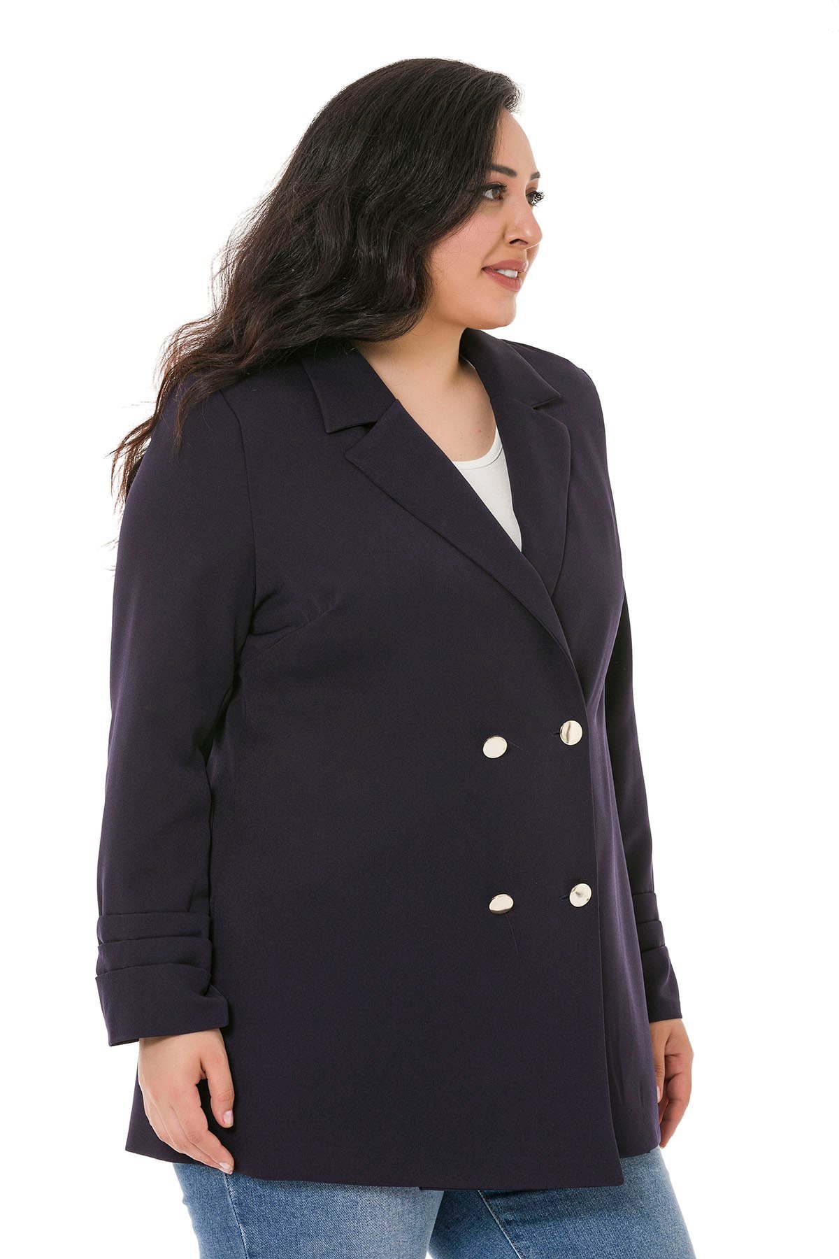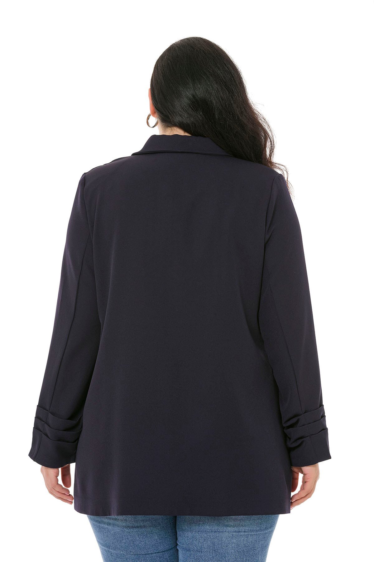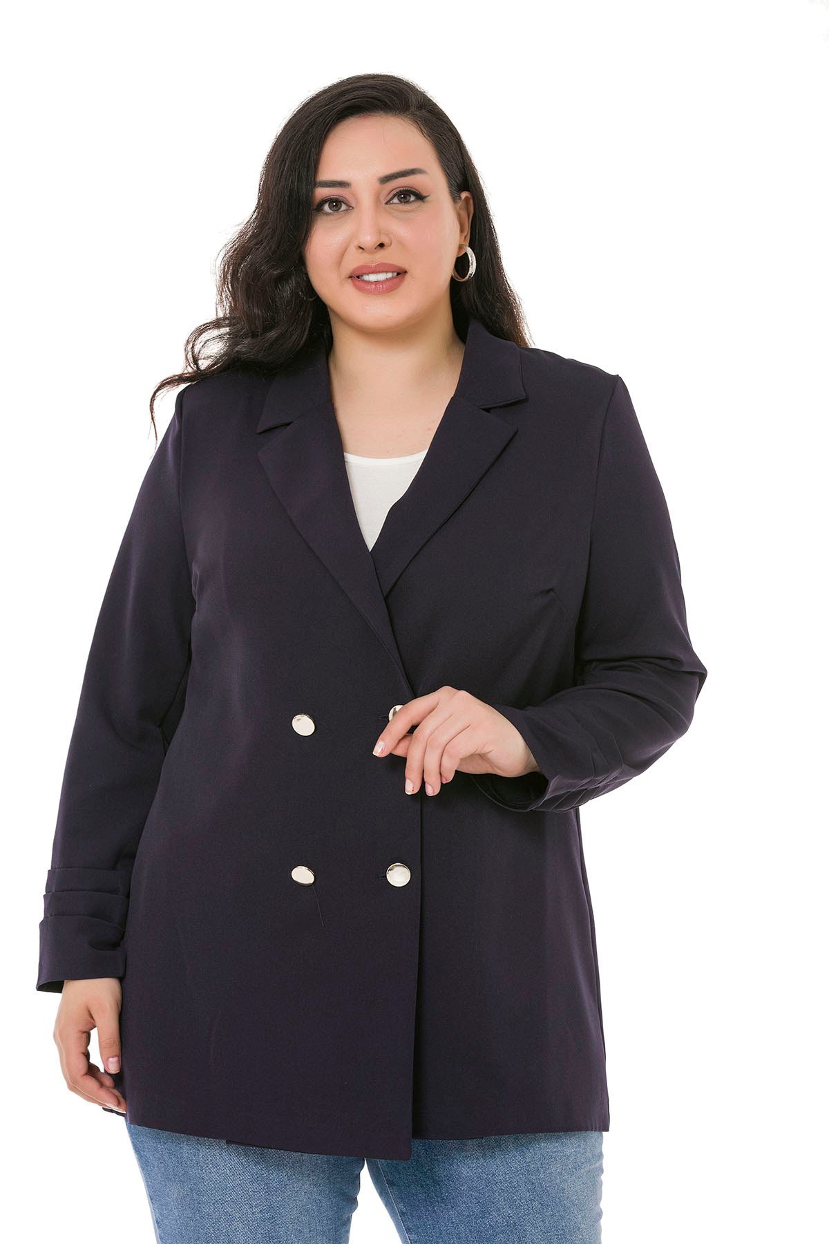 Plus Size Mono Collar Closing Sleeve Pleated Navy Blue Unlined Jacket