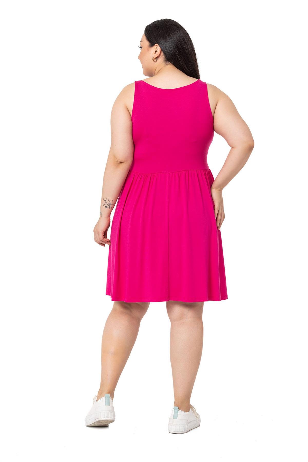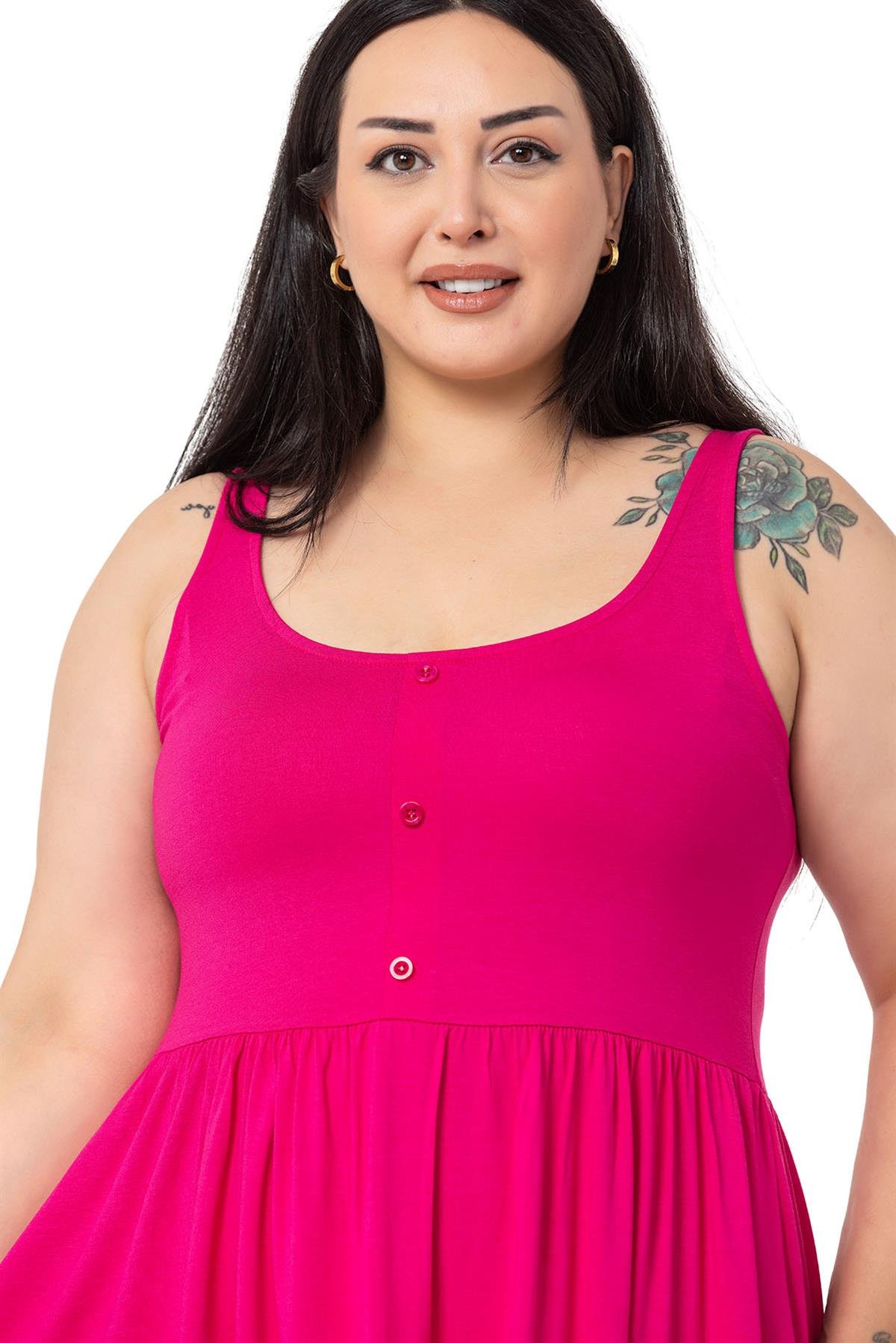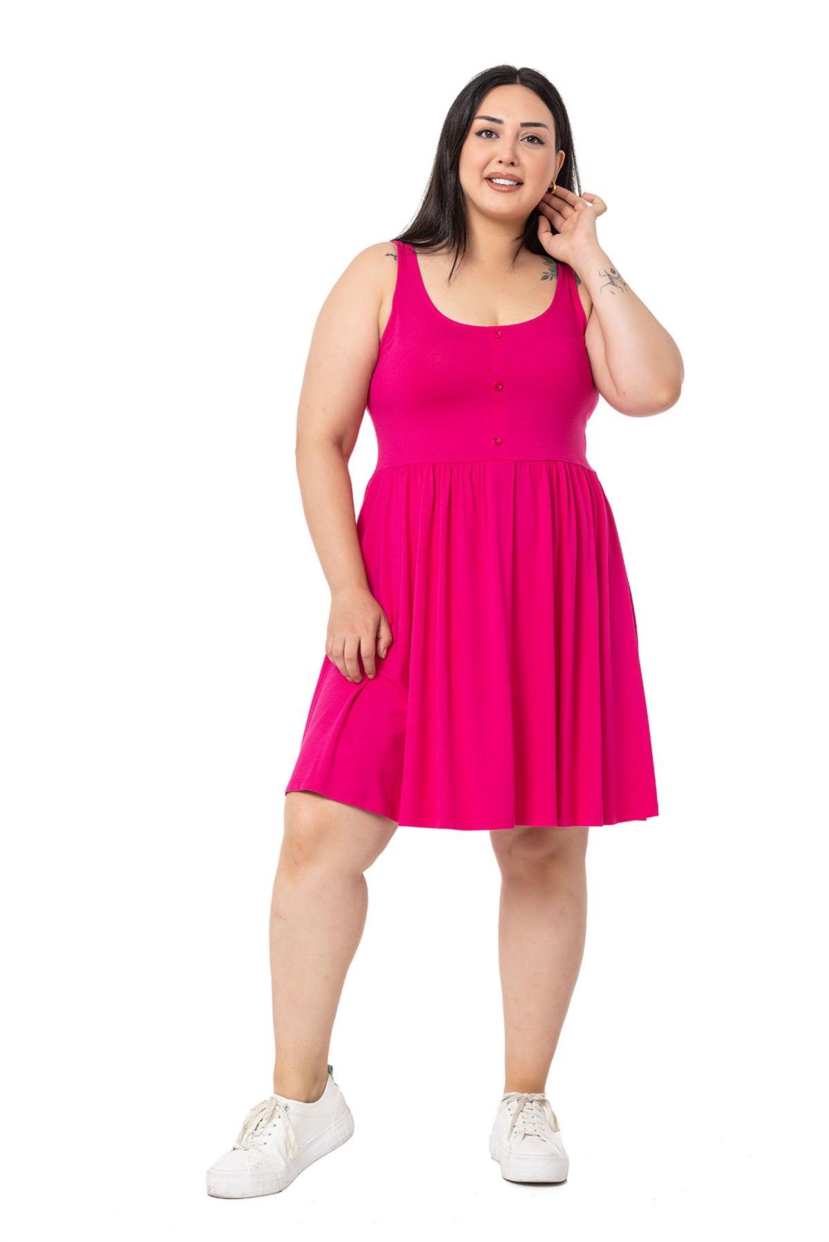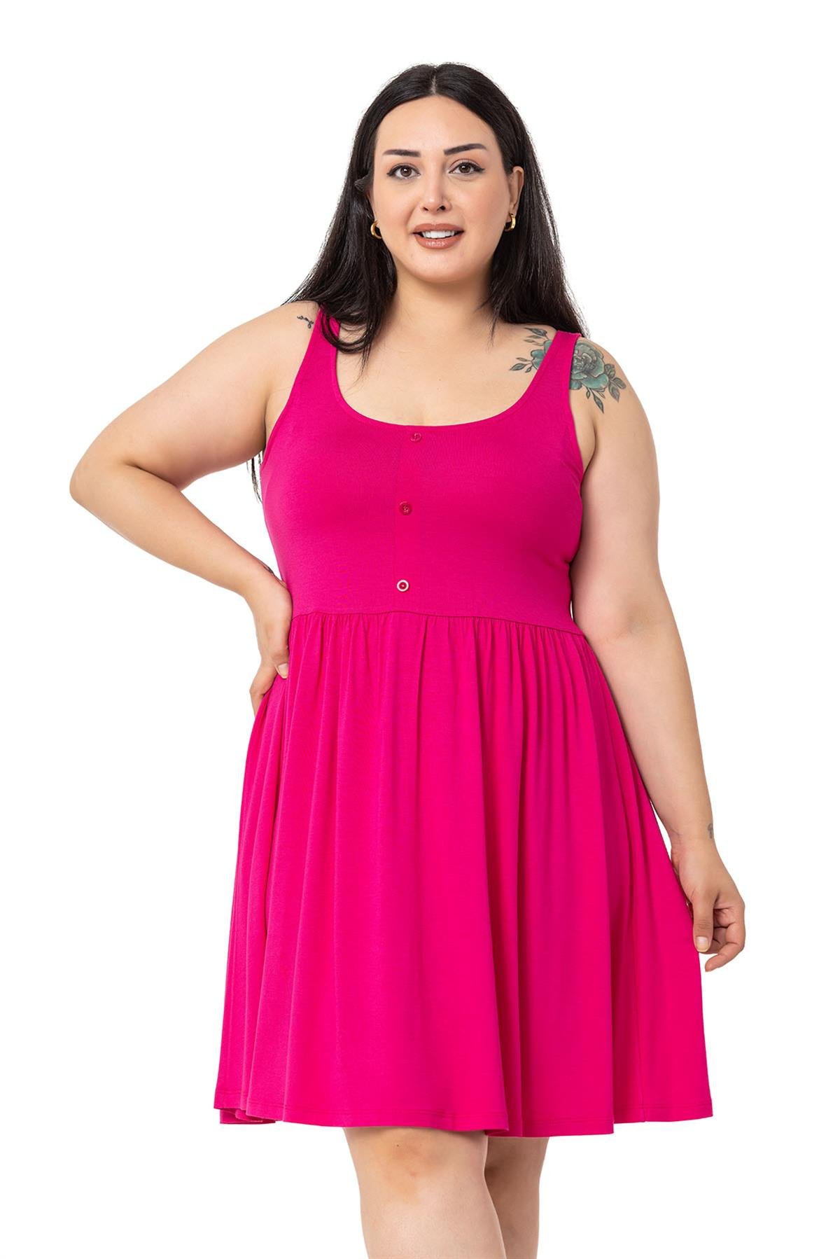 Plus Size Ornamental Button Detailed Viscose Short Fuchsia Dress