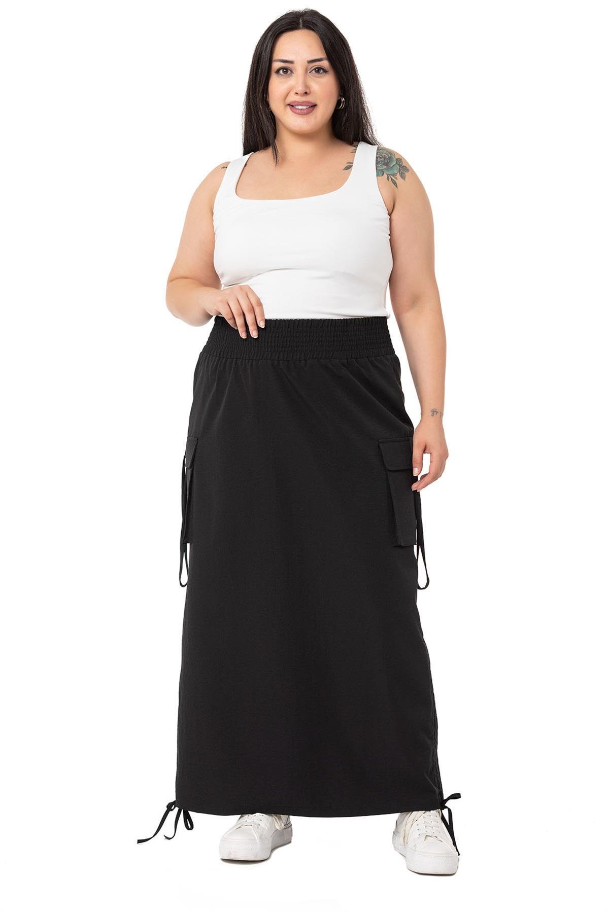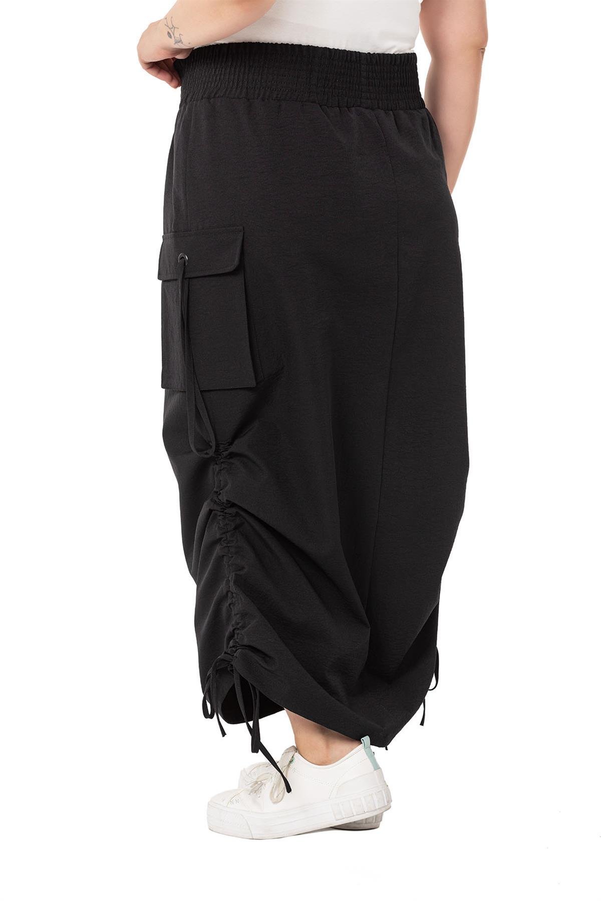 Plus Size Parachute Long Black Skirt with Side Gather Detail and Elastic Waist