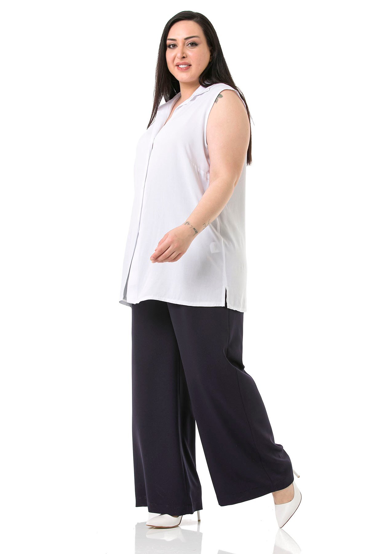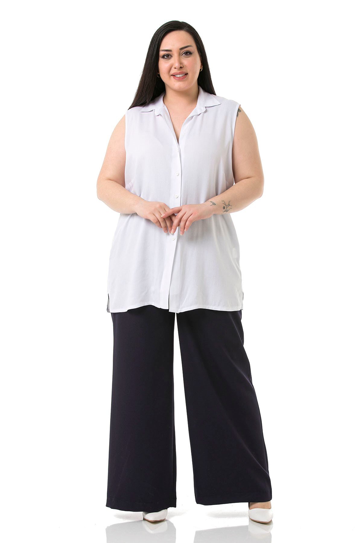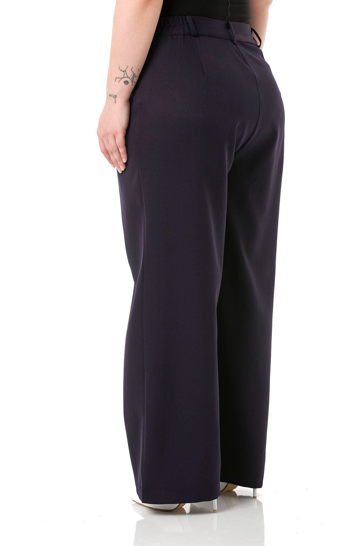 Large size, front pleated, waist, elasticated zipper at the back, wide leg double trousers.