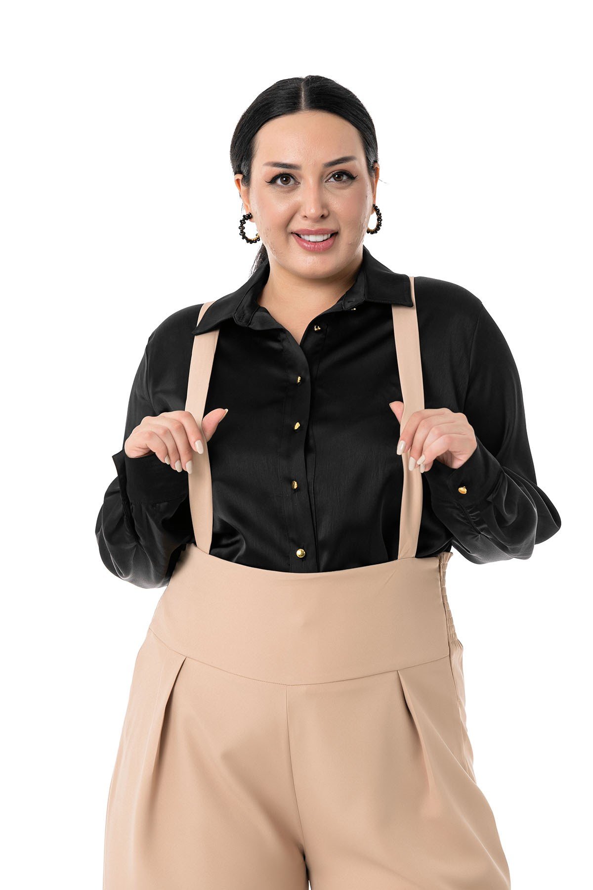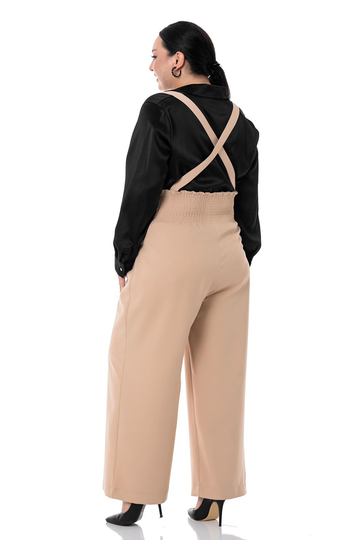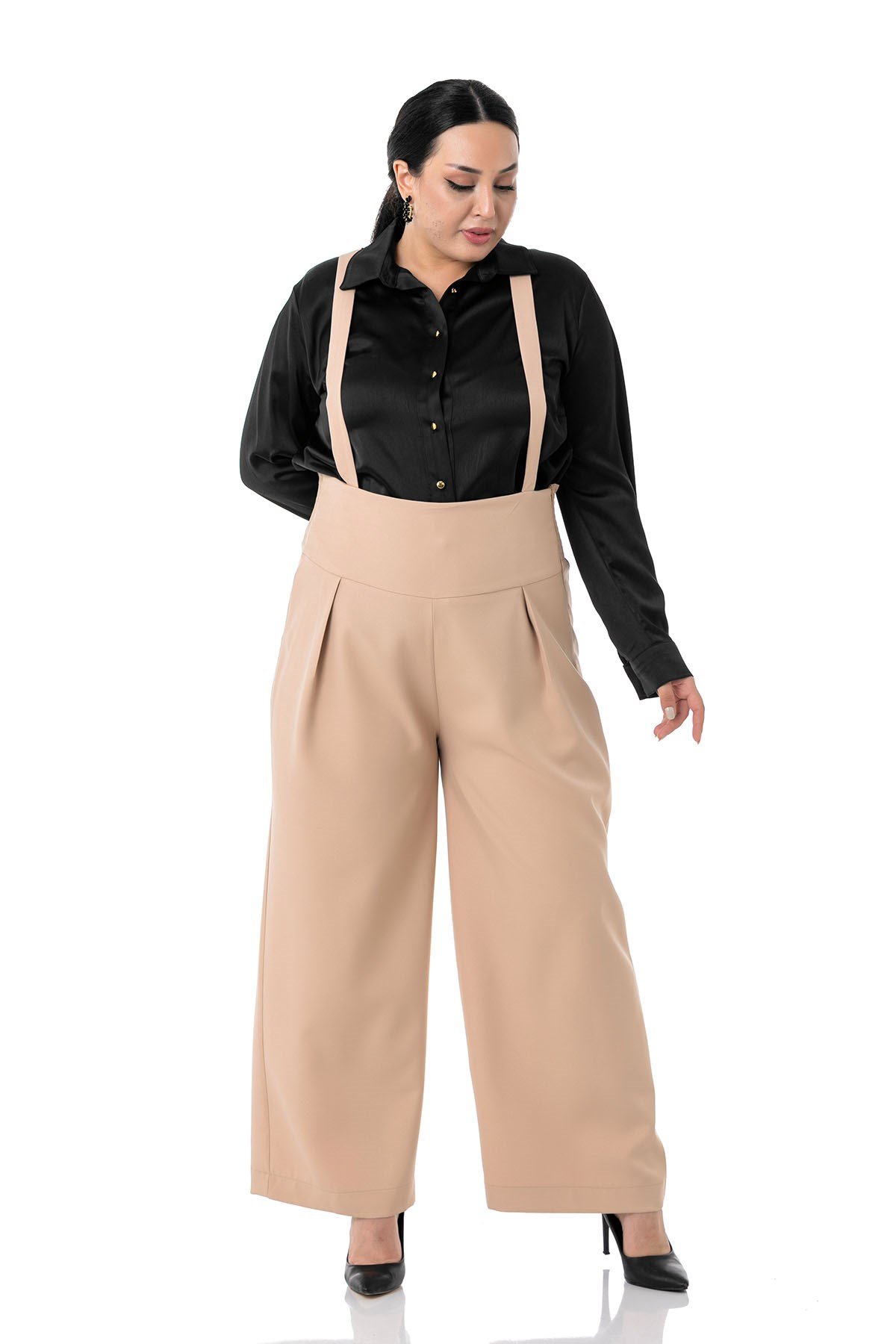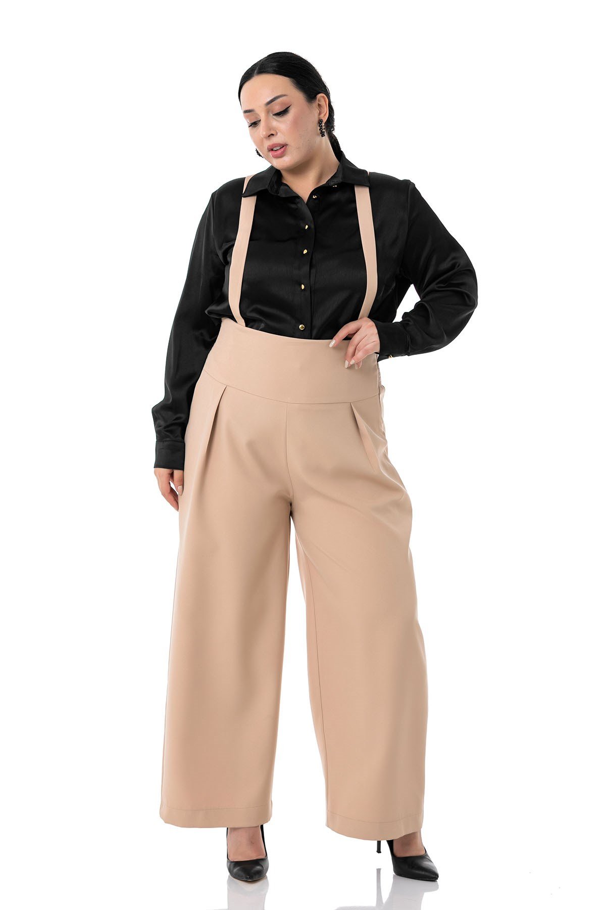 Large size double trousers with pleats on the front, elastic waistband at the back, hidden zipper on the side and wide leg straps.