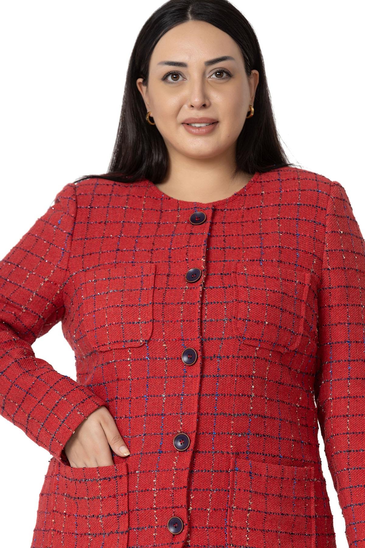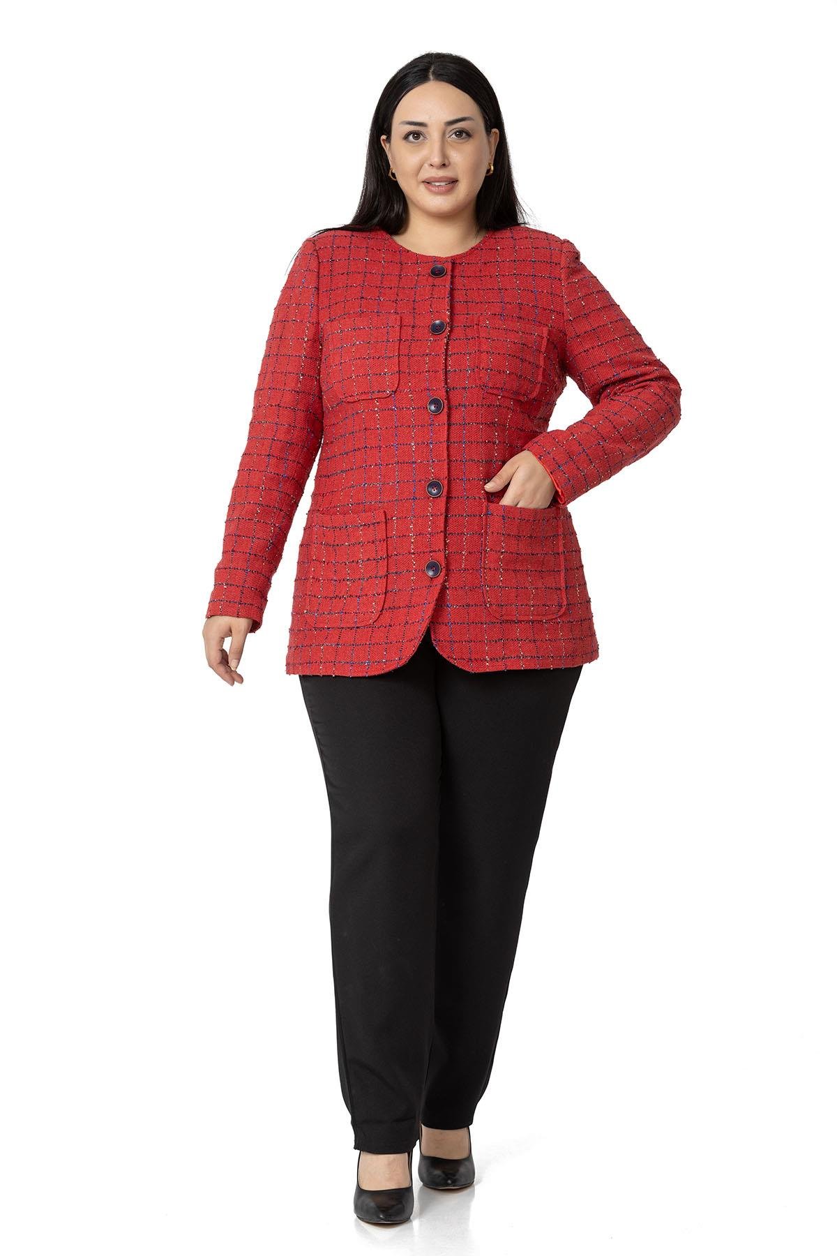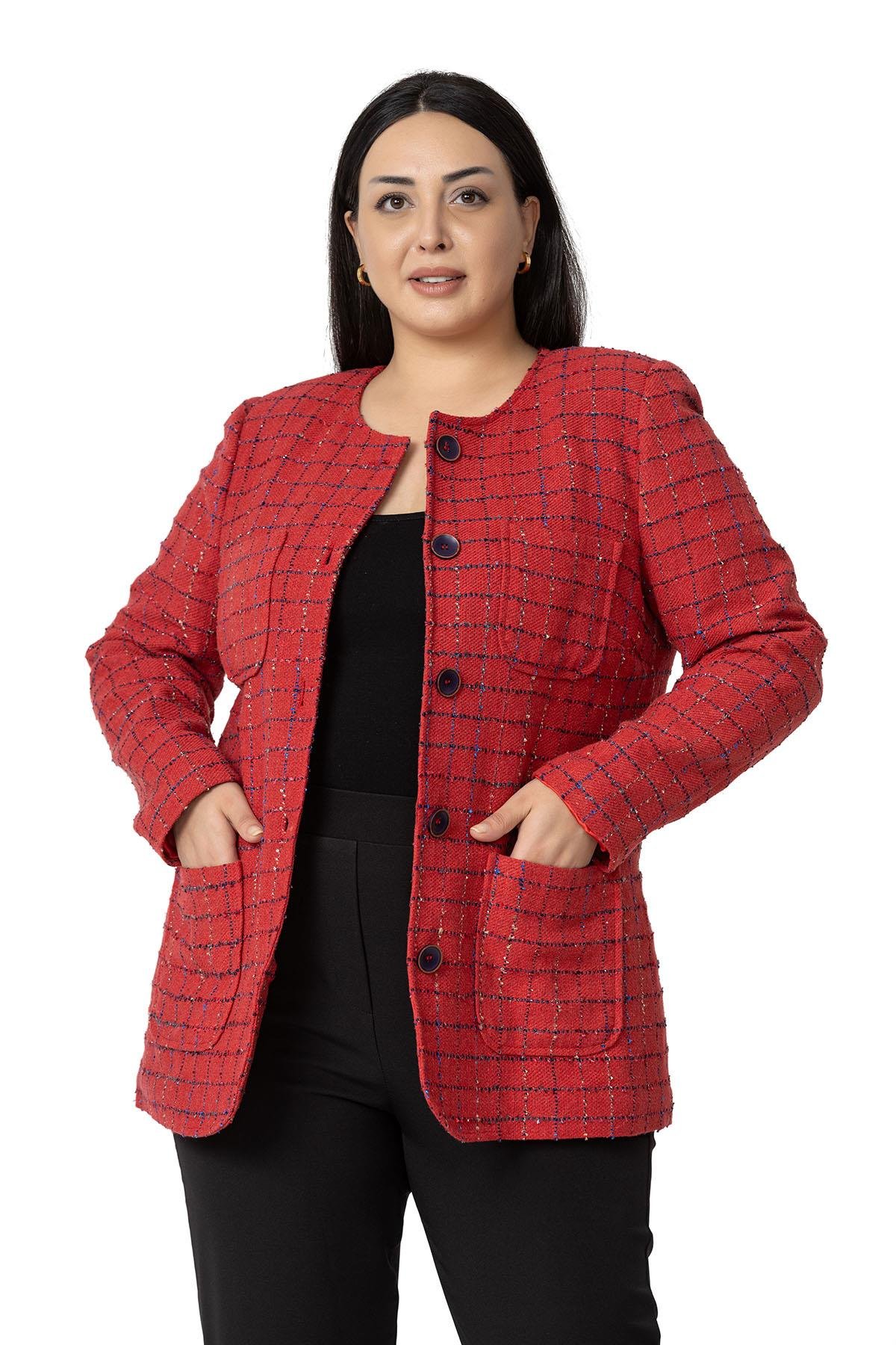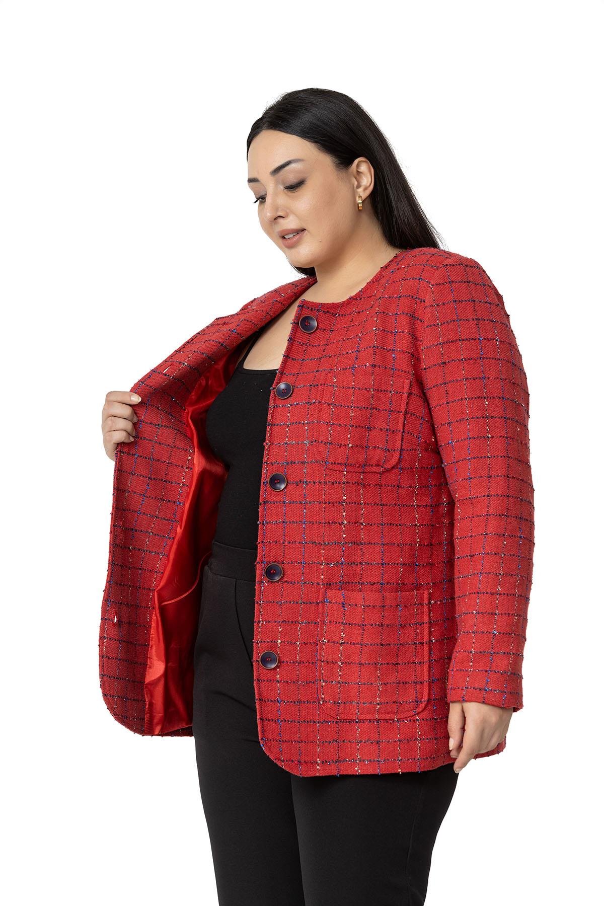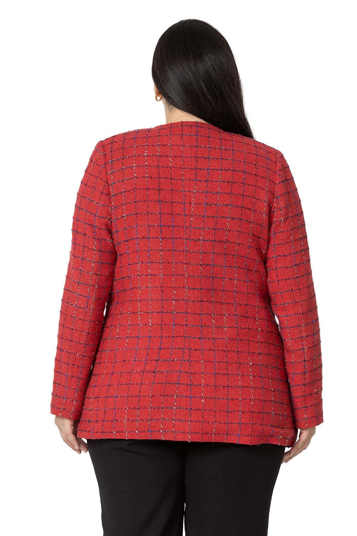 Plus size, four-pocket, collarless, buttoned, glittery chanel fabric-lined jacket.