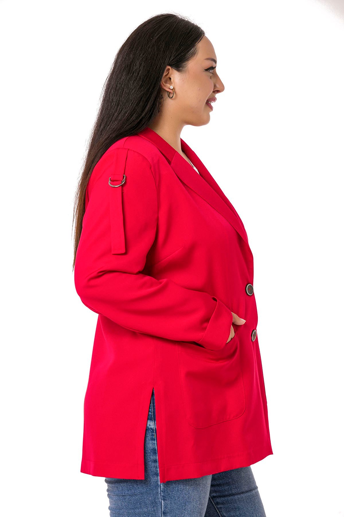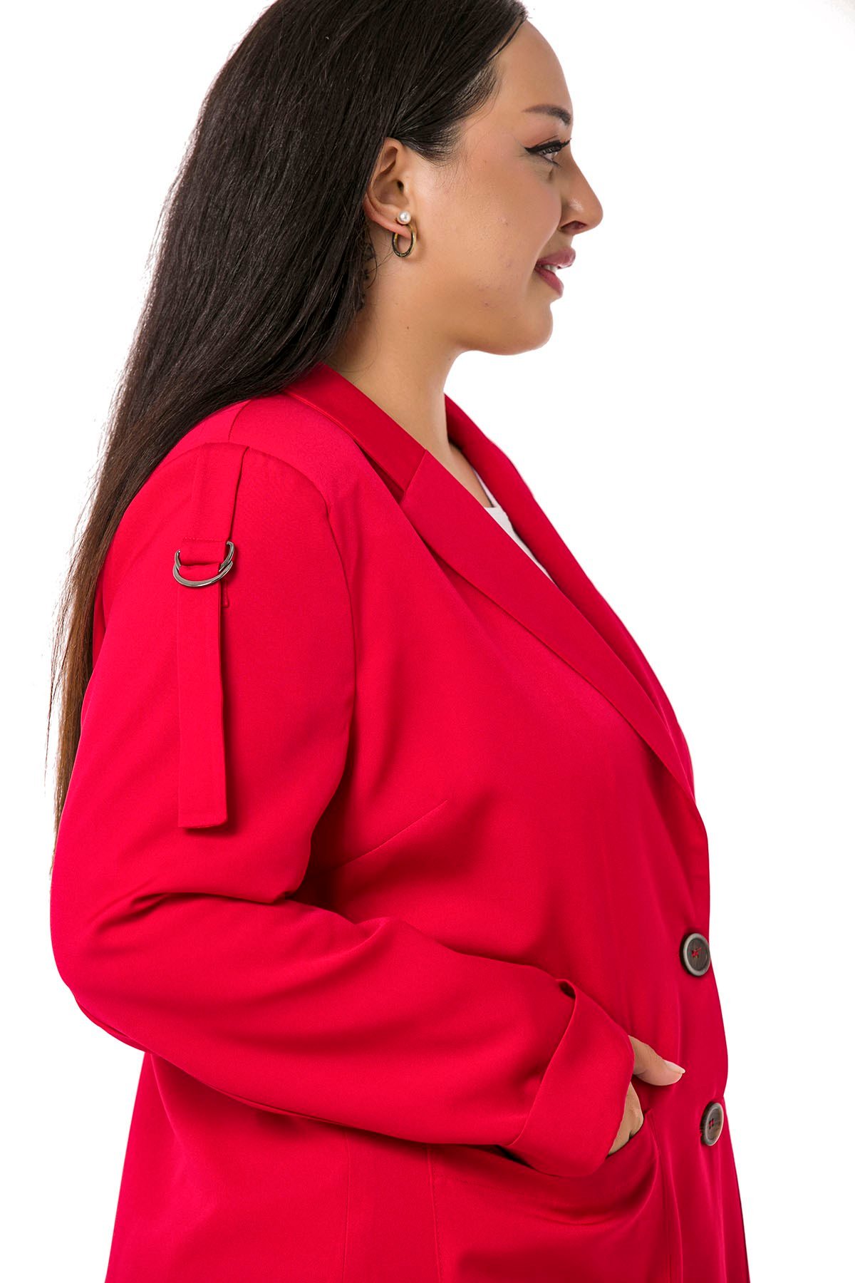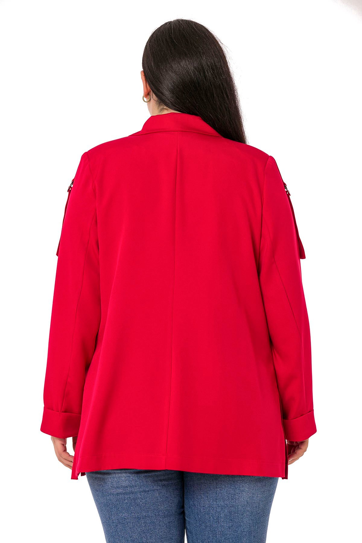 Plus Size Red Jacket with Shoulder Ribbon and D Buckle Detail and Side Slits