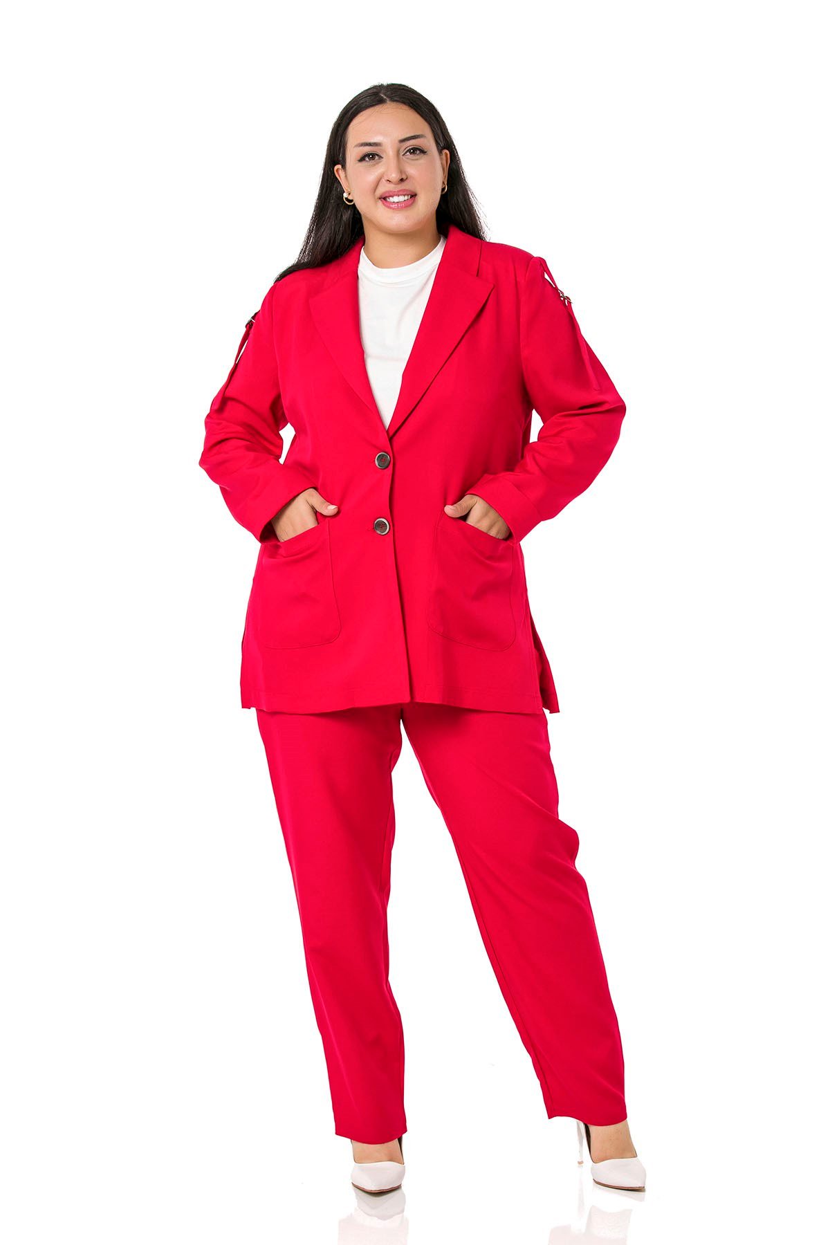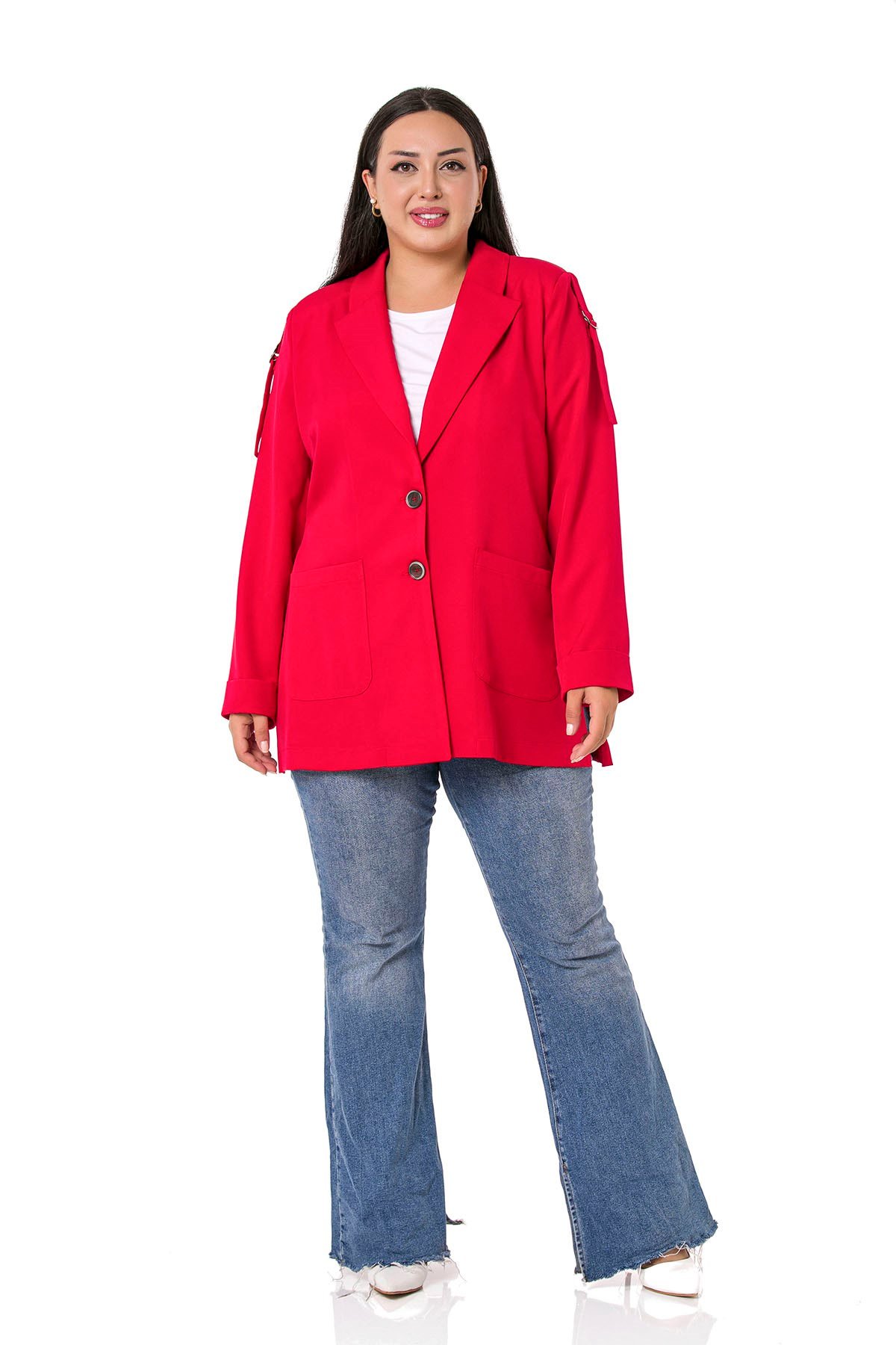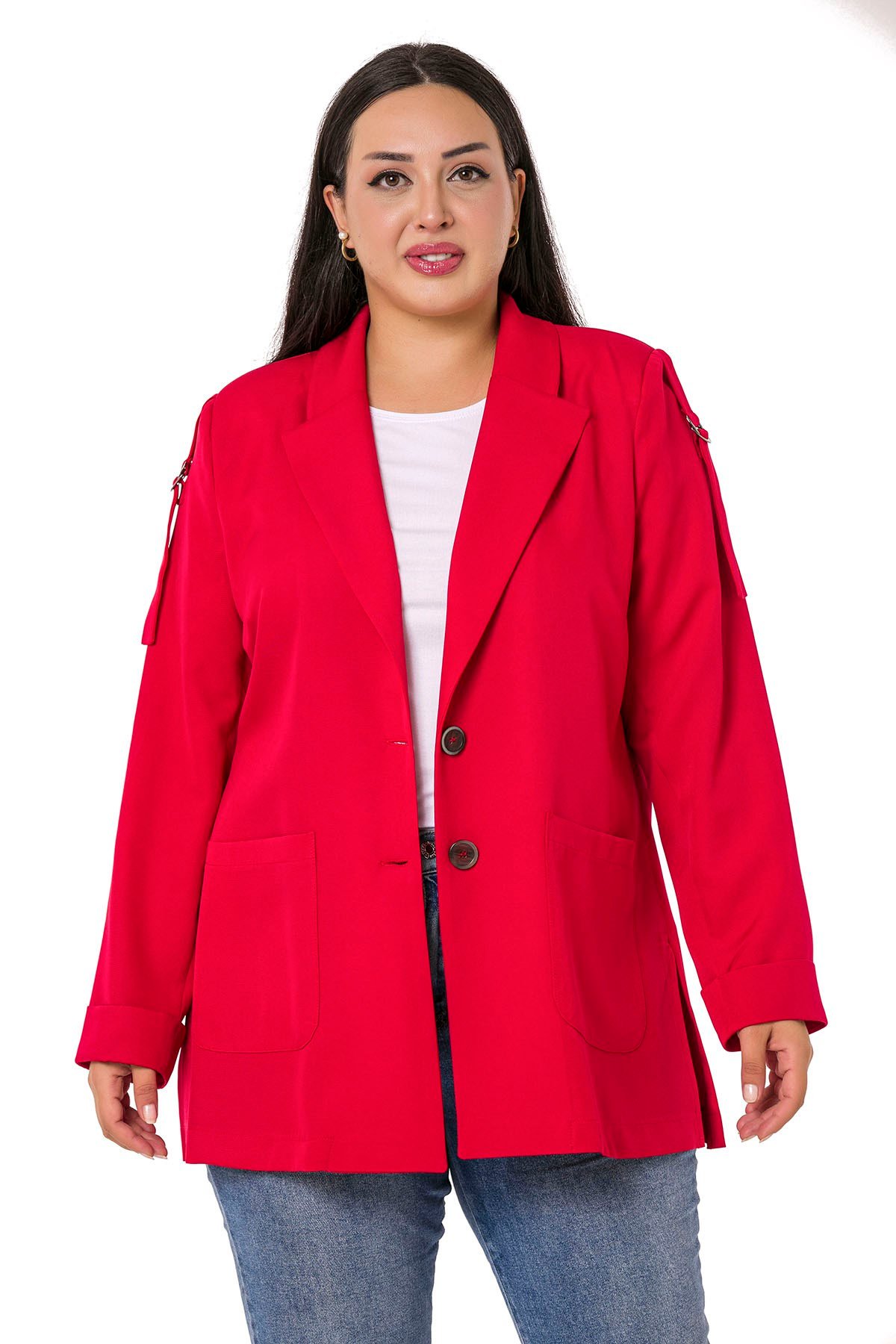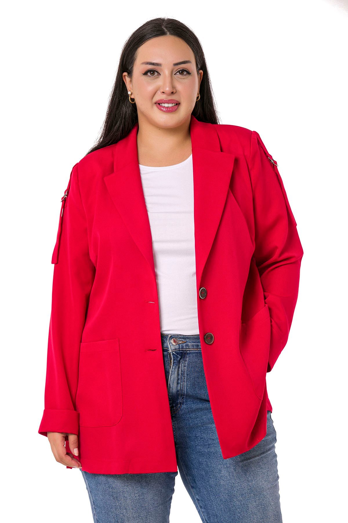 Plus Size Red Jacket with Shoulder Ribbon and D Buckle Detail and Side Slits