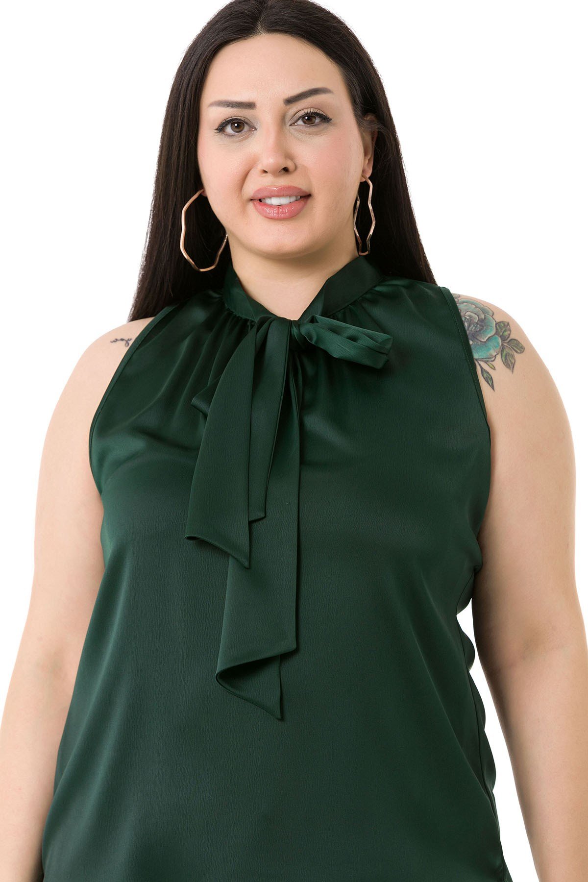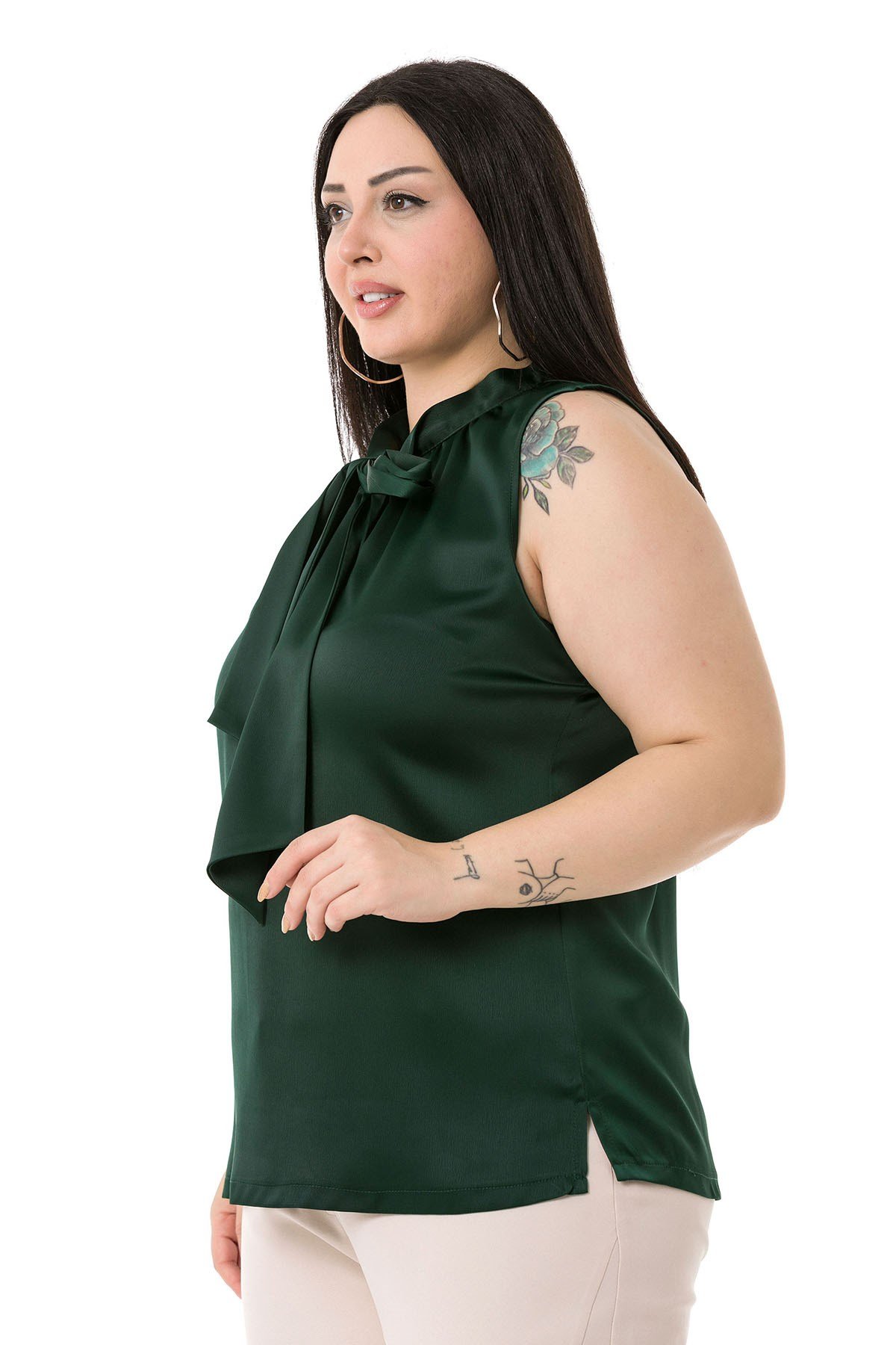 Plus Size Satin Emerald Blouse with Scarf Collar and Side Slits