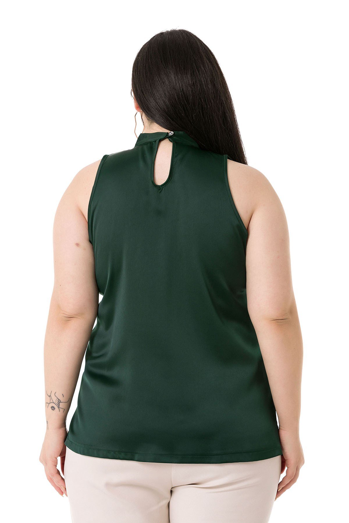 Large size satin blouse with scarf neckline, button closure at the back, sleeveless and side slit.