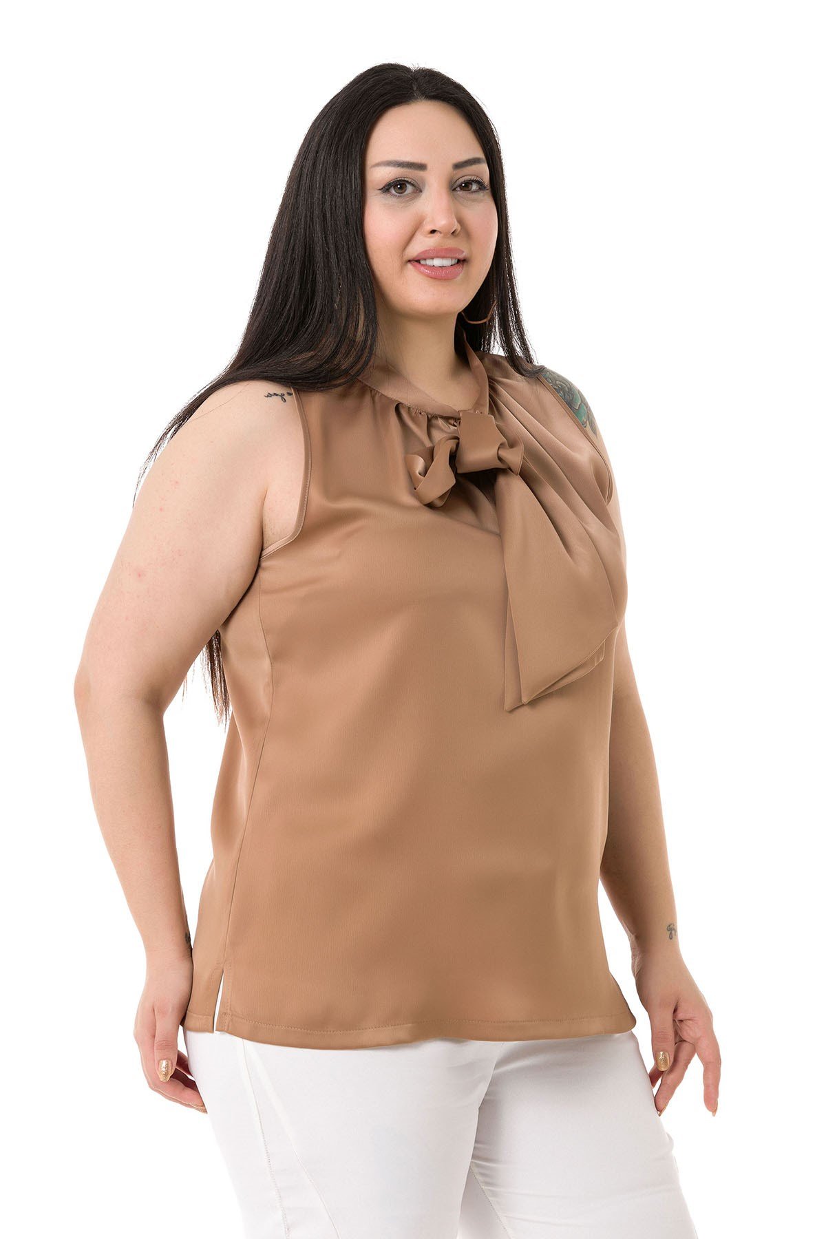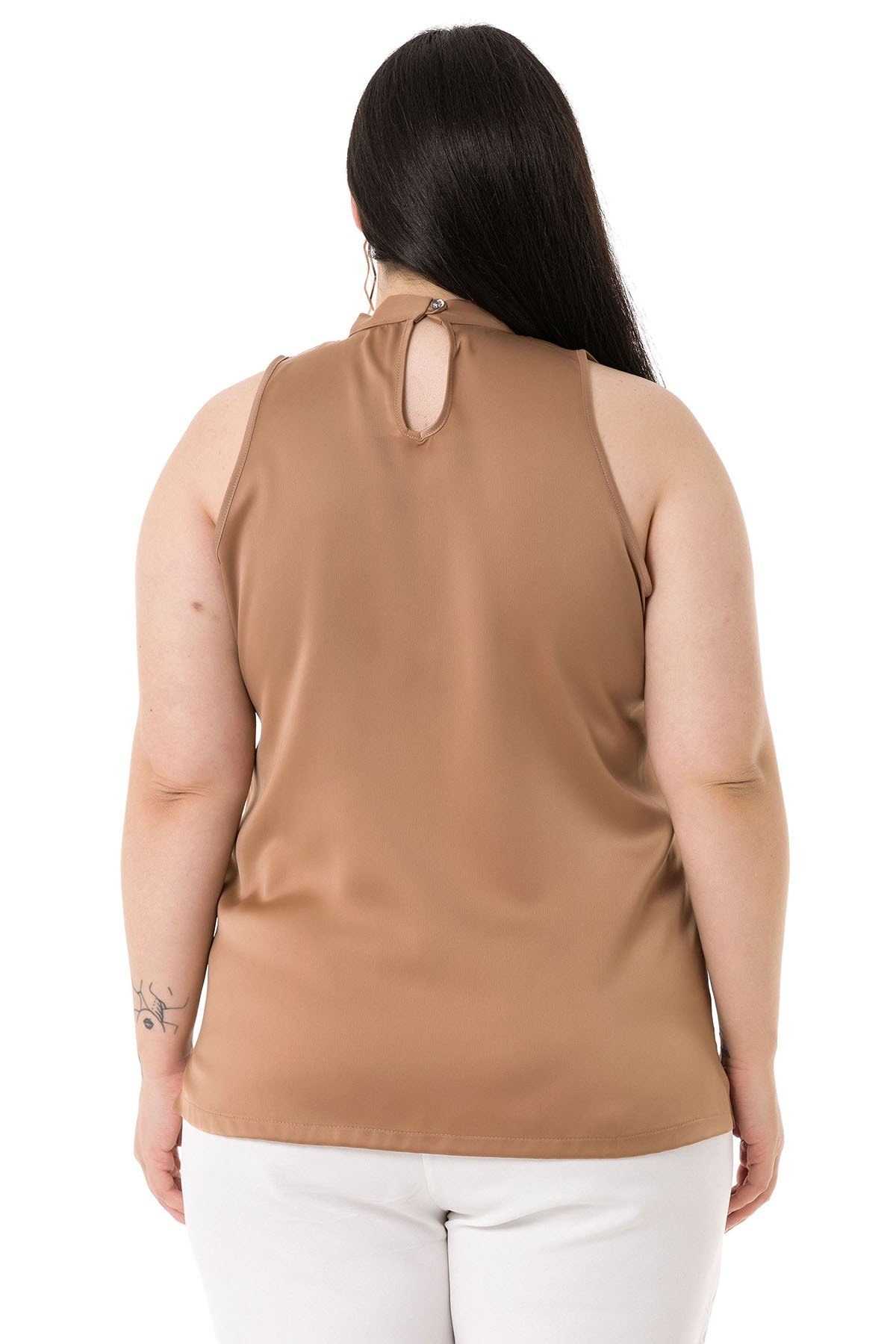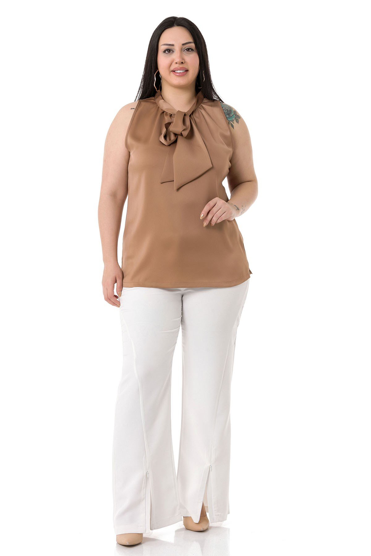 Large size satin blouse with scarf neckline, button closure at the back, sleeveless and side slit.