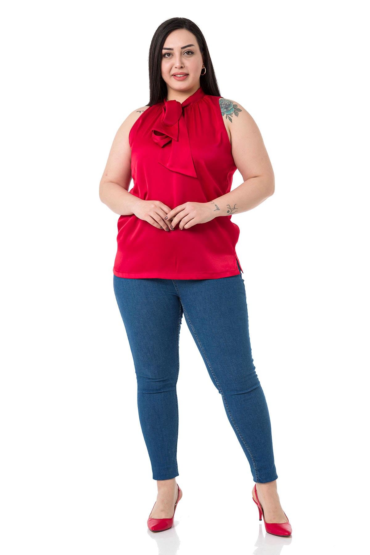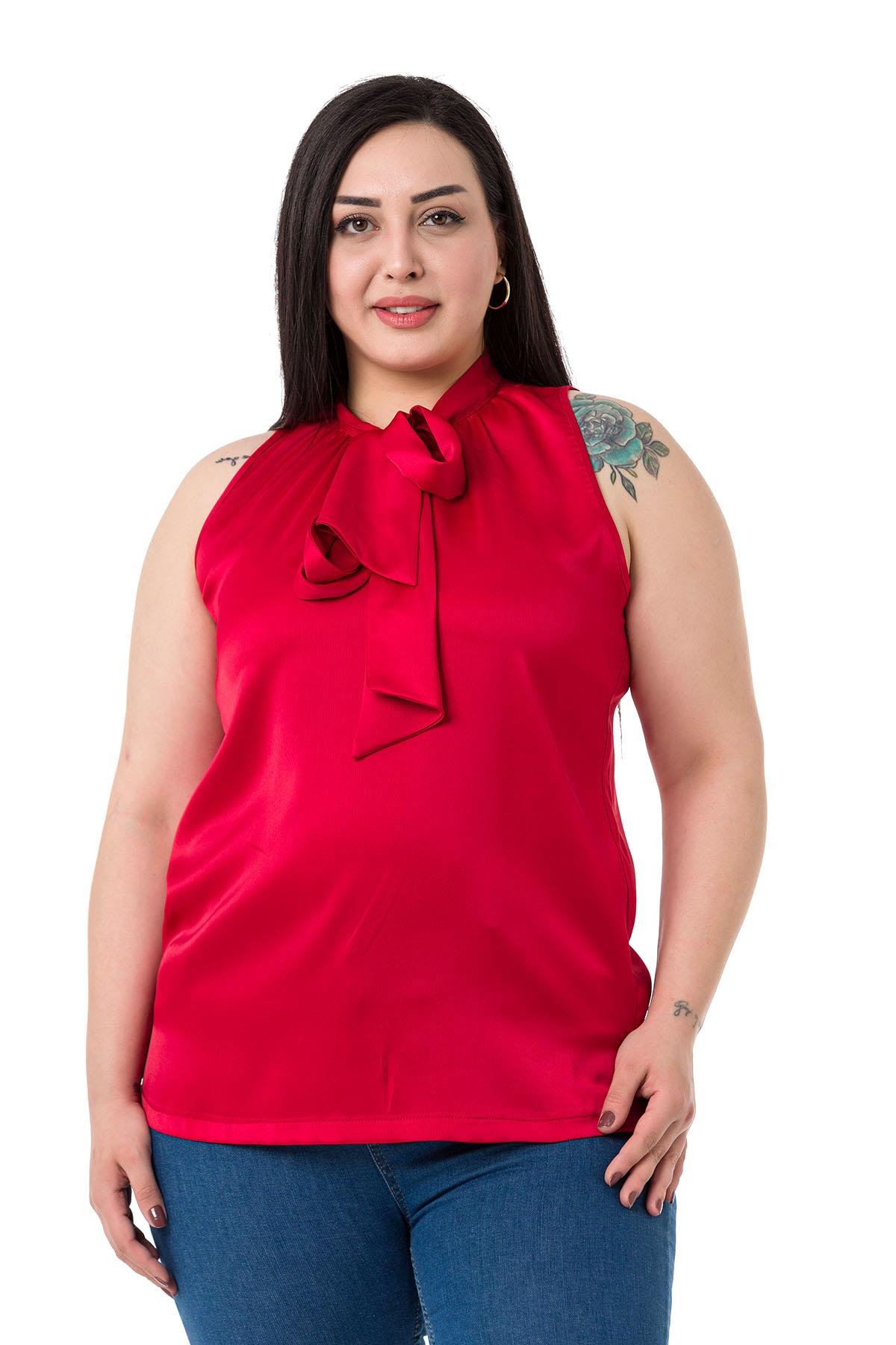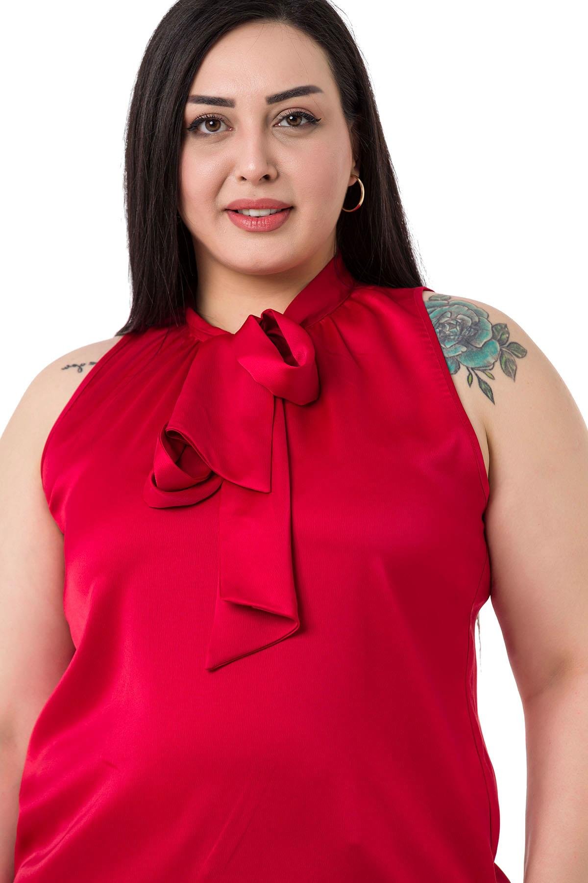 Plus Size Satin Red Blouse with Side Slit and Scarf Collar